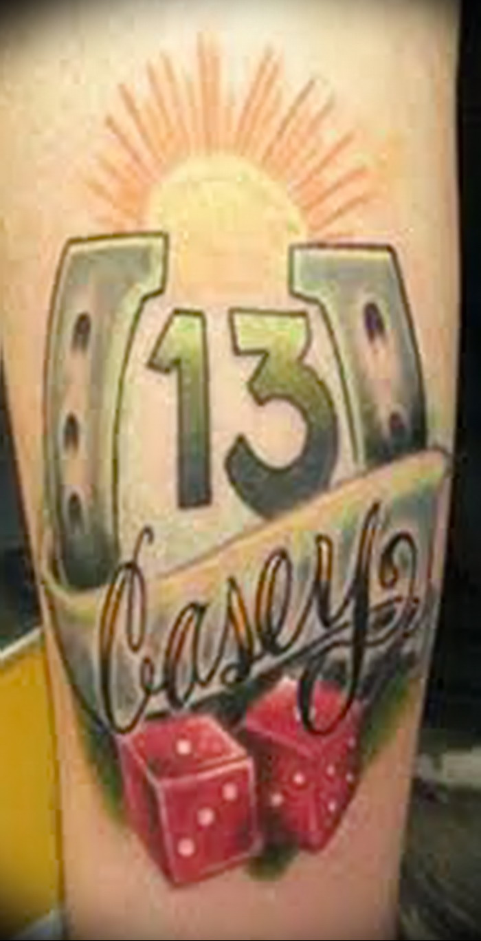 Un homme choisit le tatouage "13" pour une raison. Il lui donne un certain sens. Le propriétaire d'un tatouage aime compléter les figures par des attributs du jeu. C'est possible :