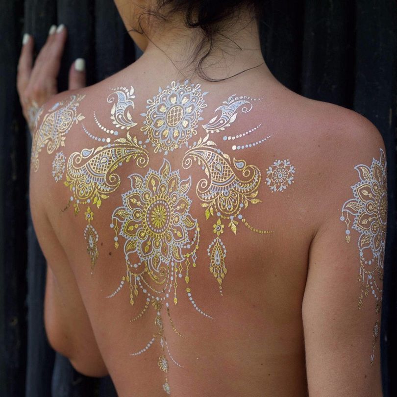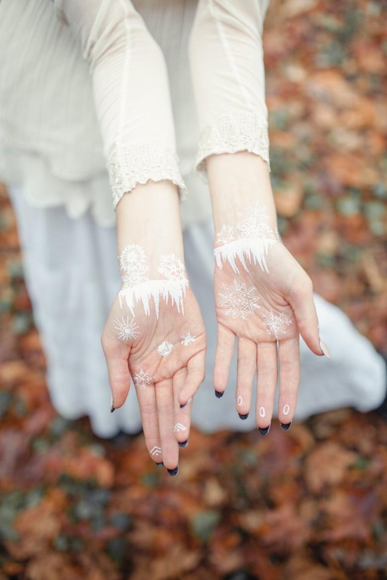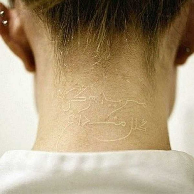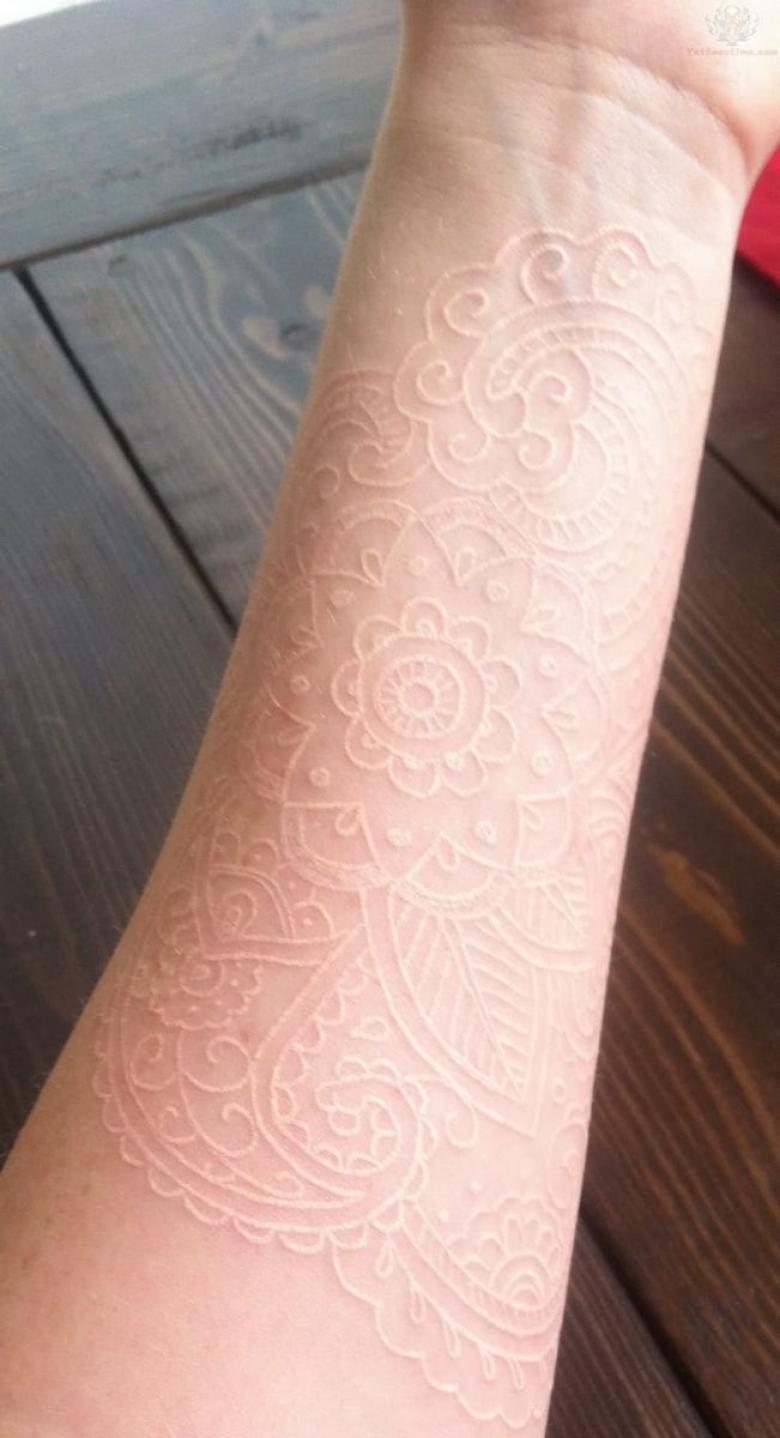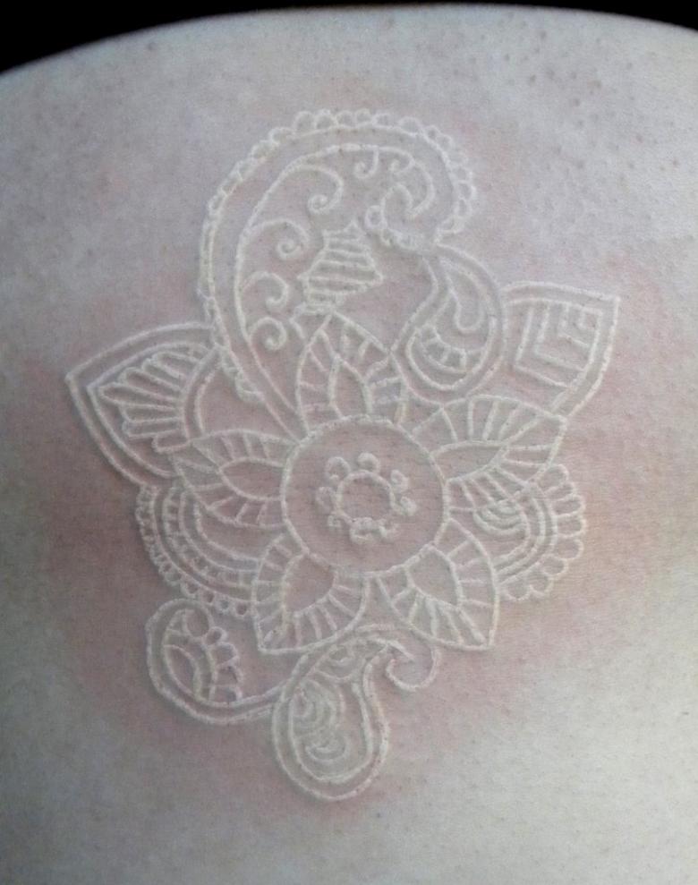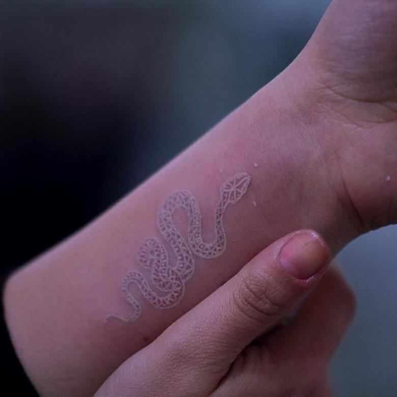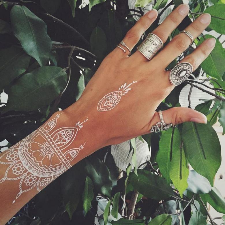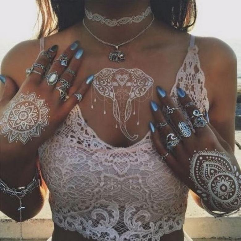 - L'encre blanche appliquée sur la peau modifie sa teinte. En outre, chaque personne acquiert un ton individuel. Plus la peau est foncée, plus l'encre sera jaune. Les filles à la peau blanche comme neige ne présenteront pas de jaunissement, mais le motif sera plus pâle et moins contrasté.