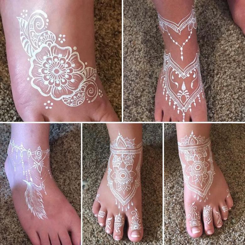 - Sur la cheville, dans la zone du talon, de petits ajuras, des caches, des nœuds celtiques, des chaînes, encadrant le pied par-dessus le pied ont un aspect original.