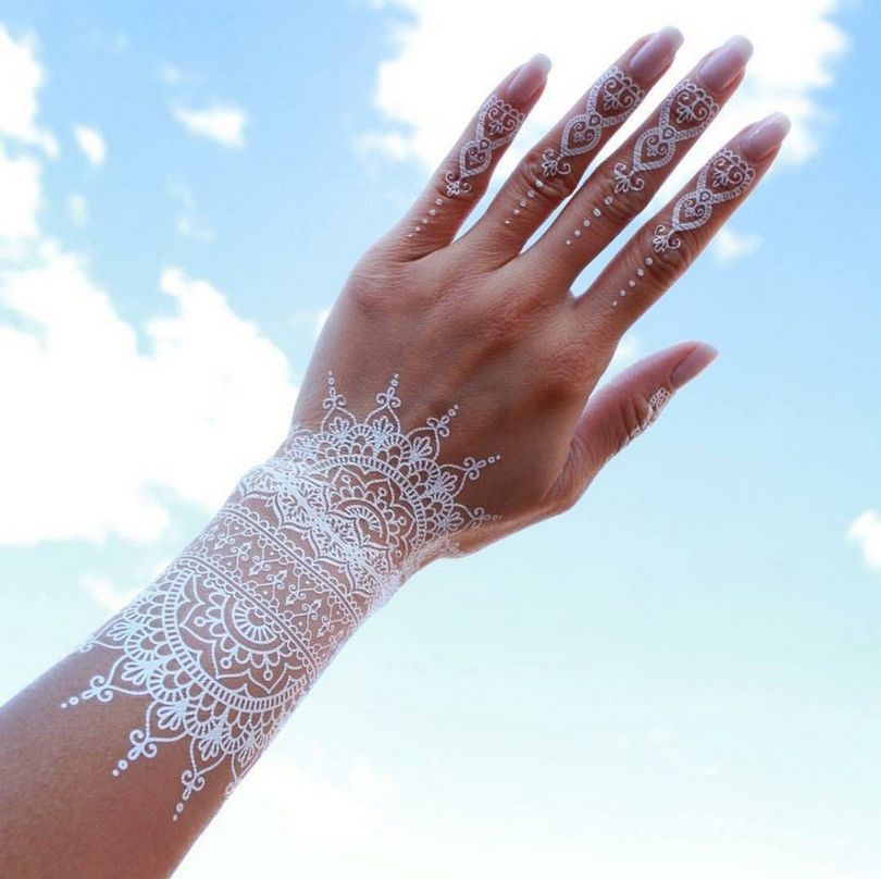 Mieux que les autres images, le motif ajouré crée un beau relief complexe sur le corps. Les oiseaux, les papillons et les fleurs sont superbes. Vous ne pouvez pas non plus vous tromper si vous choisissez comme thème pour un tatouage blanc le nom d'un être cher, un aphorisme, une déclaration du philosophe oriental. Très beau look de tatouage blanc jumelé sur les mains d'un homme et d'une femme.