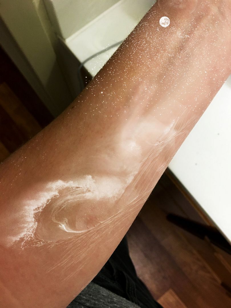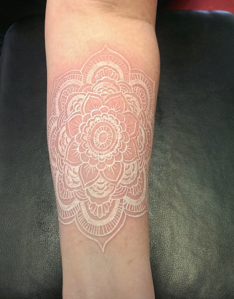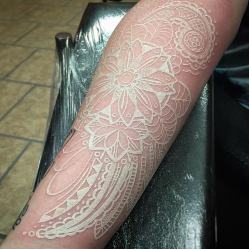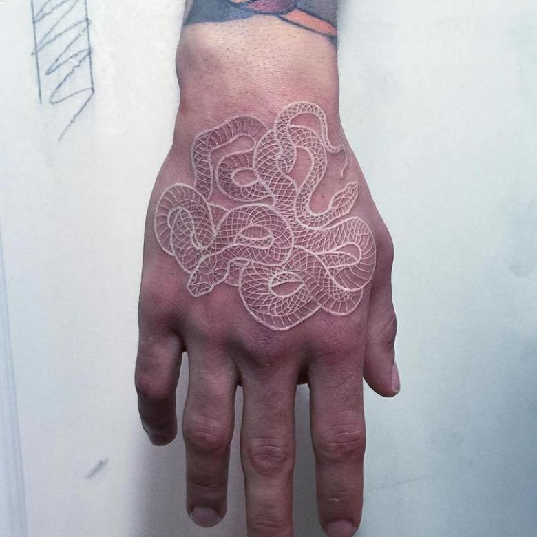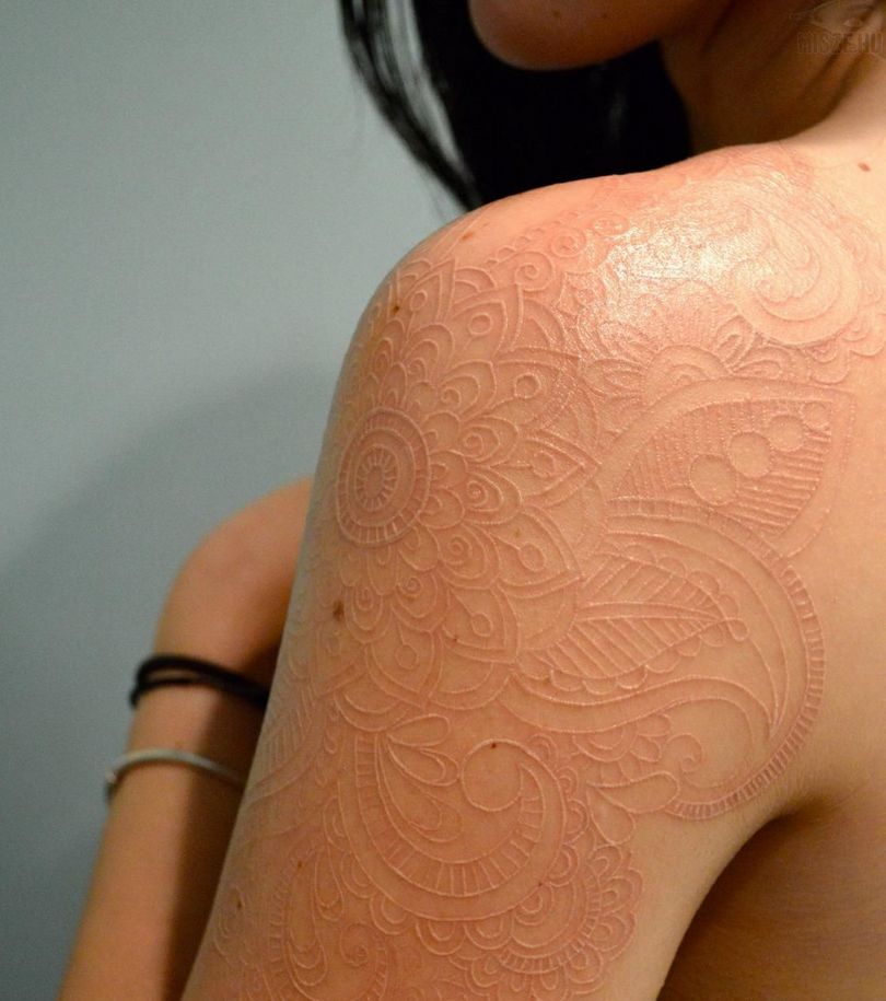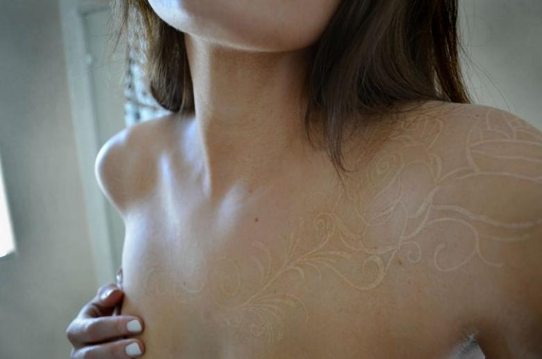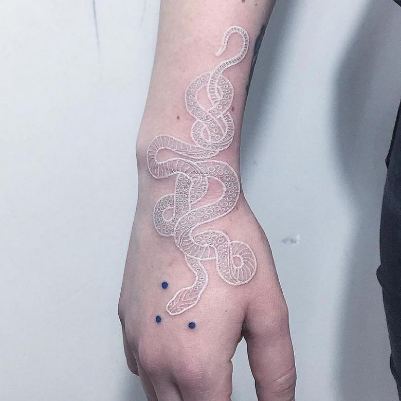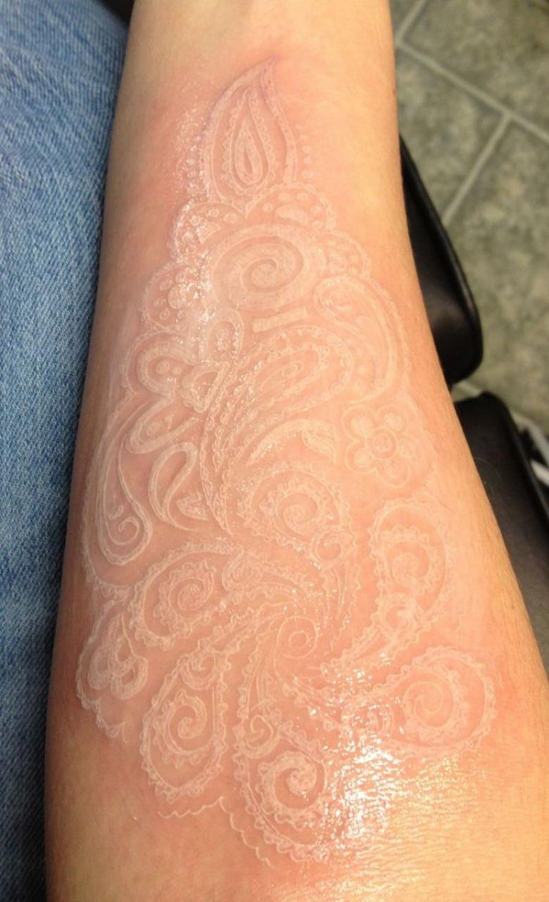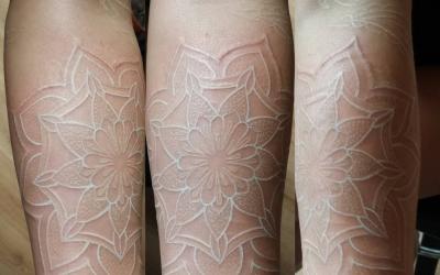 - Le tatouage blanc est presque invisible sur une peau blanchâtre.
