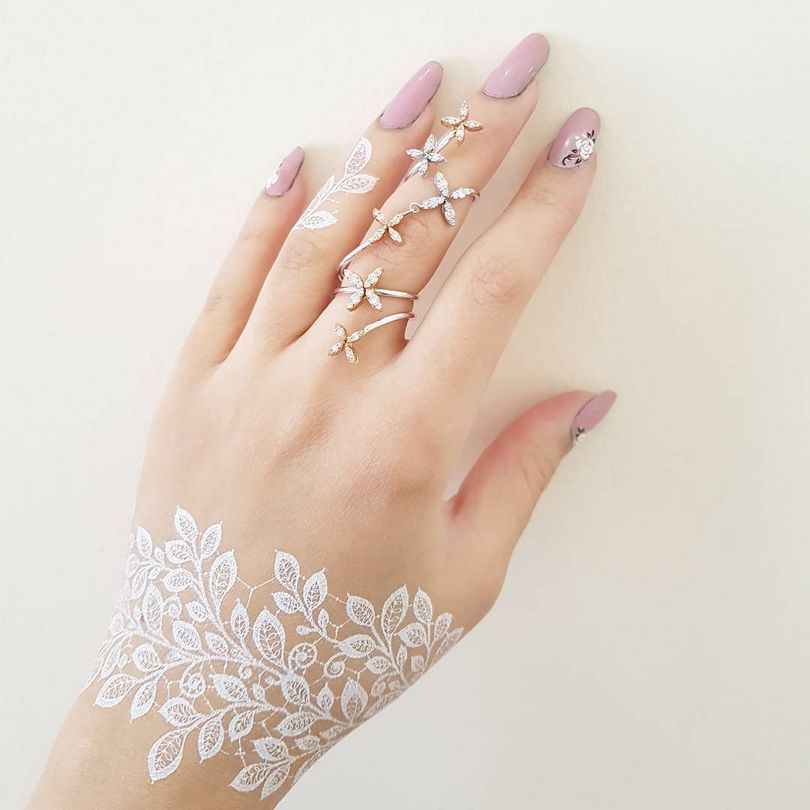 Les dames optent souvent pour des motifs plus légers, des traceries et des représentations schématiques de fleurs, d'oiseaux ou d'insectes. Le tatouage blanc de conception légère est une décoration exclusive, qui semble plus chère que les bijoux.