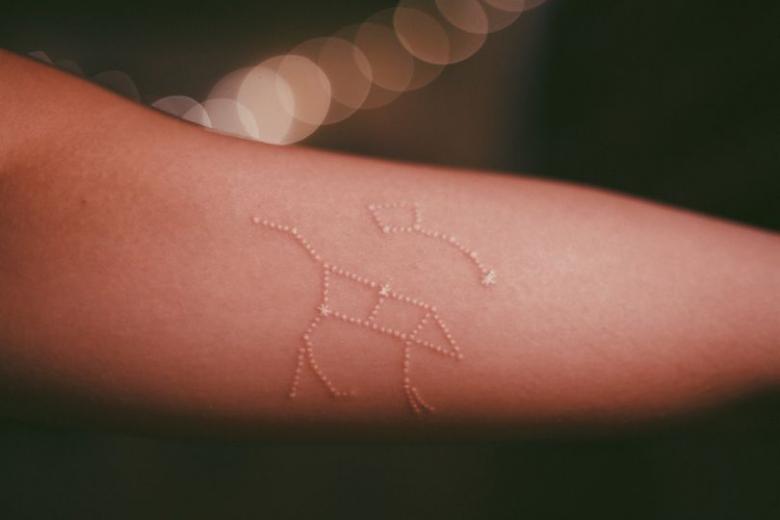 Les dessins remplis d'encre UV à peine visible sont révélés sous une lumière vive. Tous les détails sont parfaitement visibles et en même temps le tatouage est très soigné, sans une ombre de vulgarité, léger et transparent.