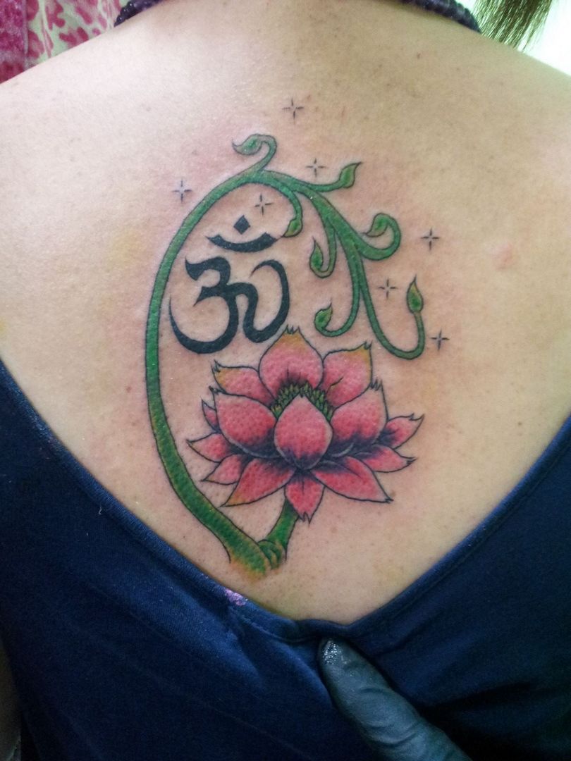 - татуировката Om е изписана на фона на звезди, цветно петно;