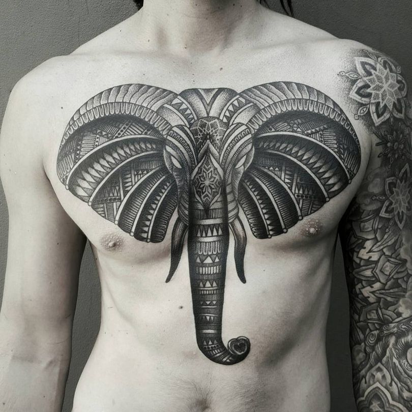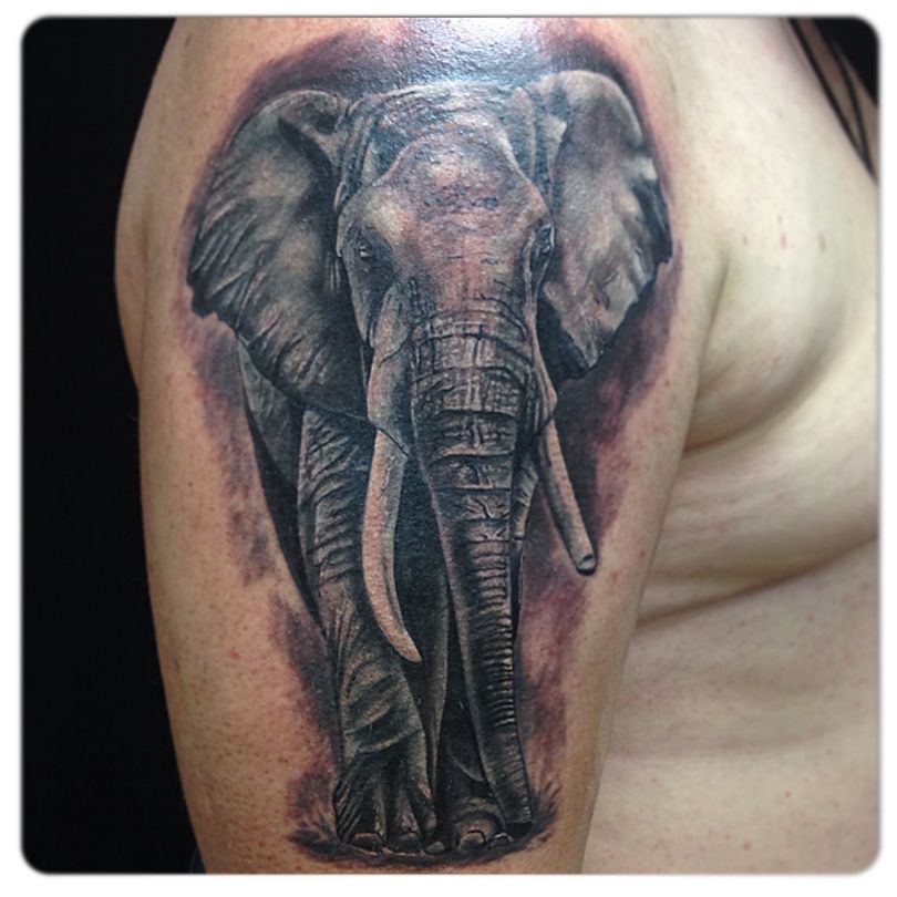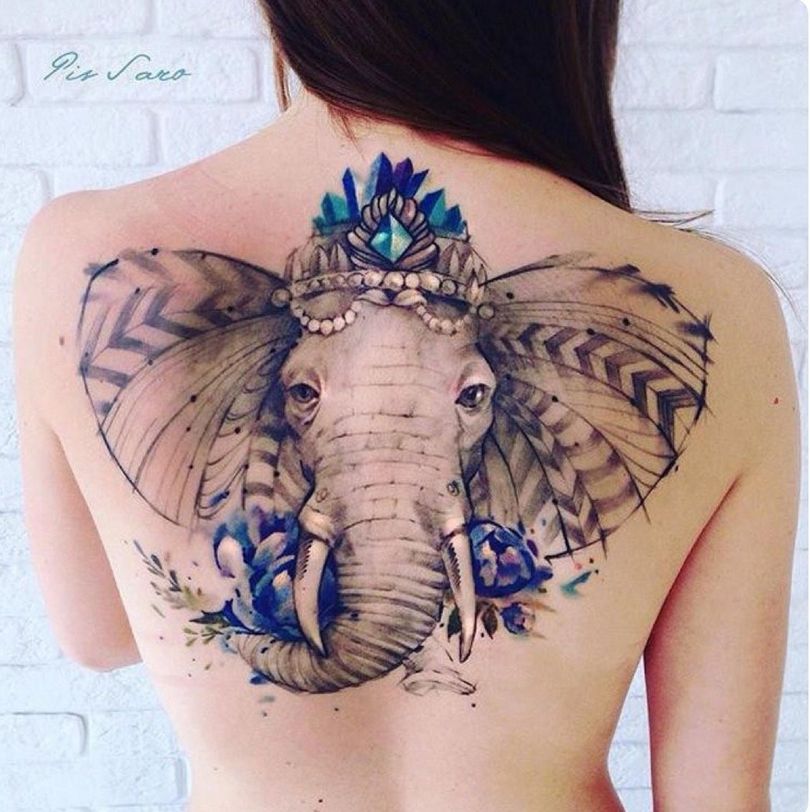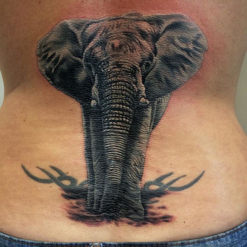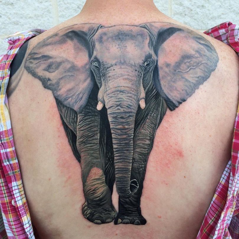 Въз основа на отговорите в професионалните сайтове на татуистите може да се направи заключението, че слонът, поставен на гърба, торса или ръцете, се идентифицира с дебела кожа, силна защита и готовност за решителна атака.