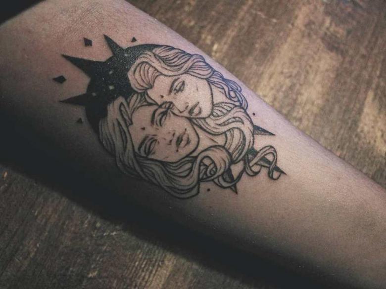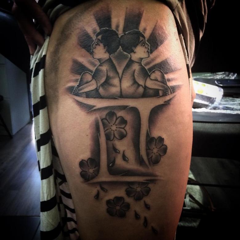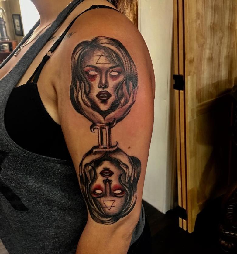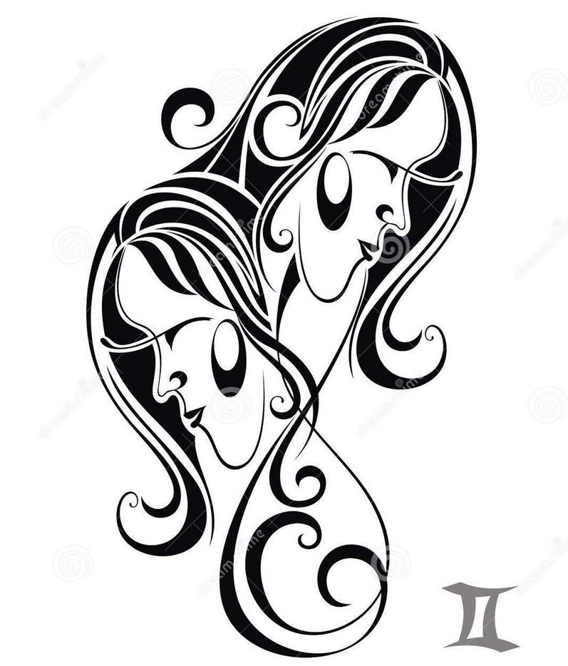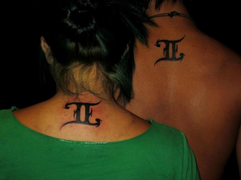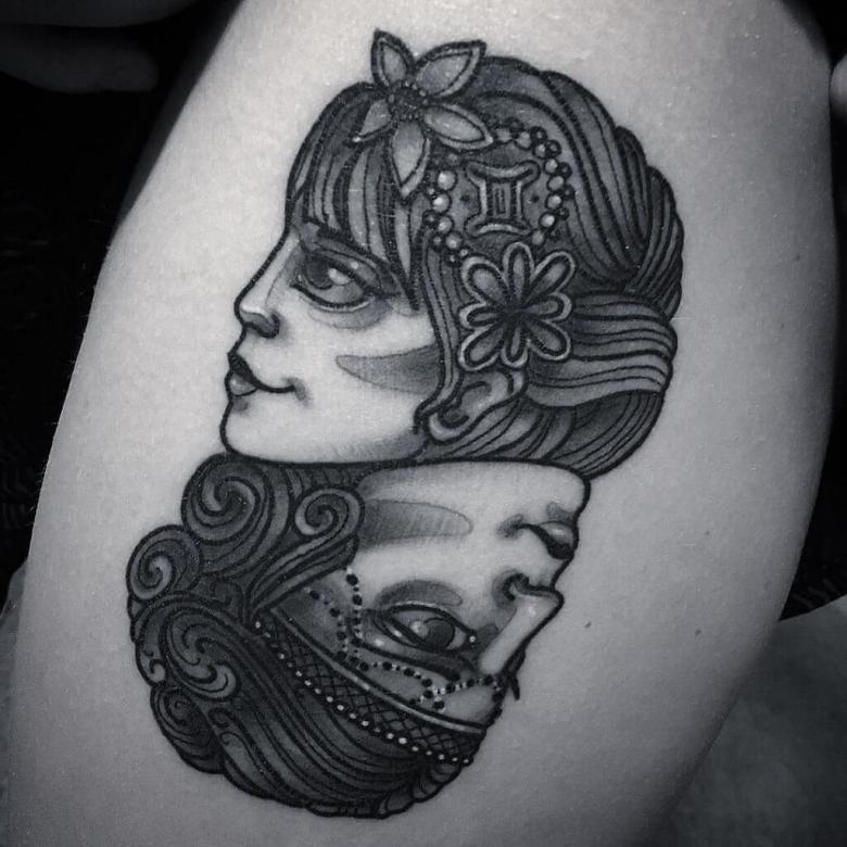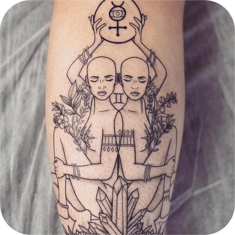 Le signe des Gémeaux a gagné en popularité dans l'industrie du tatouage et son interprétation ne se limite pas à l'horoscope. L'image standard de deux visages identiques est combinée avec d'autres éléments astrologiques, des objets étrangers, selon lesquels la signification du tatouage change.