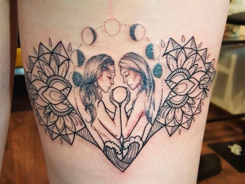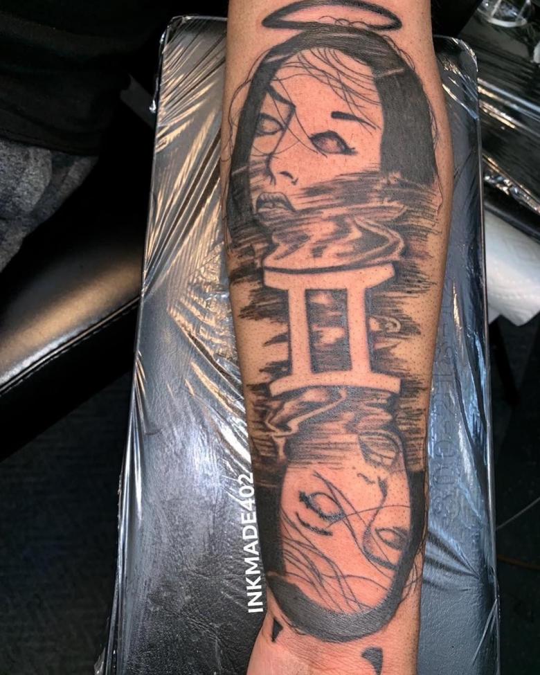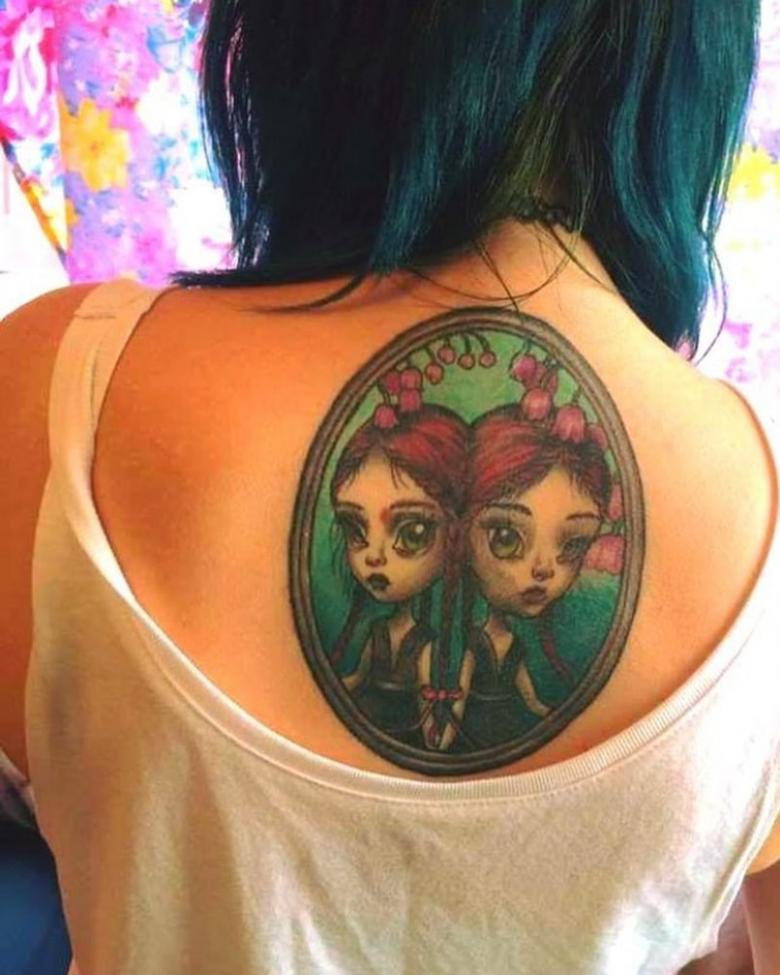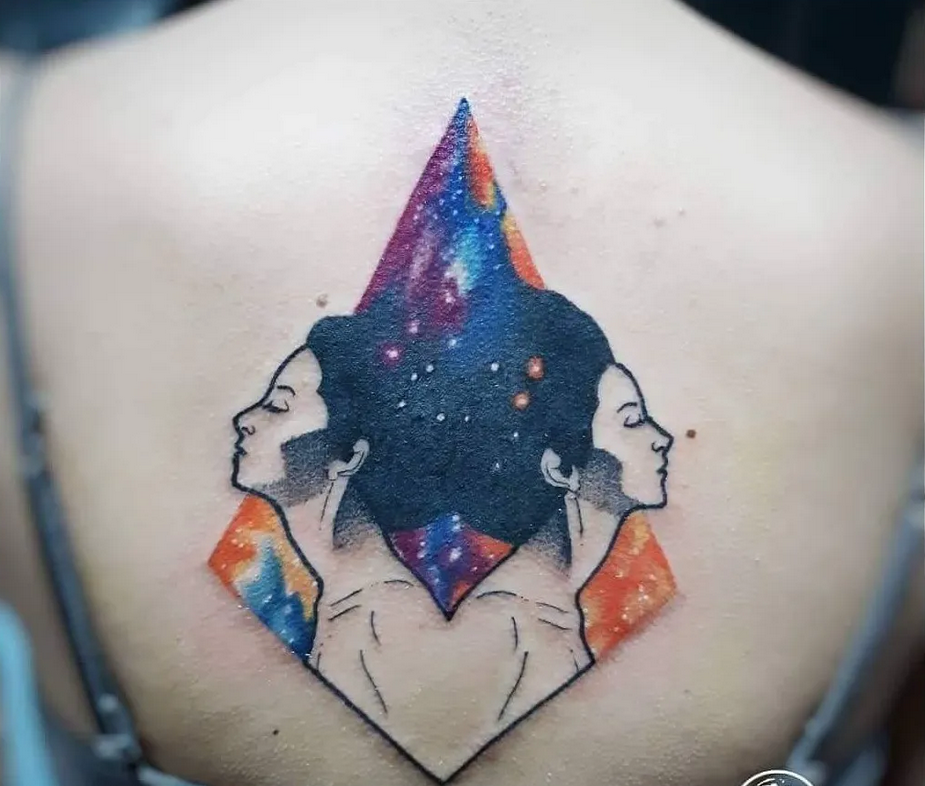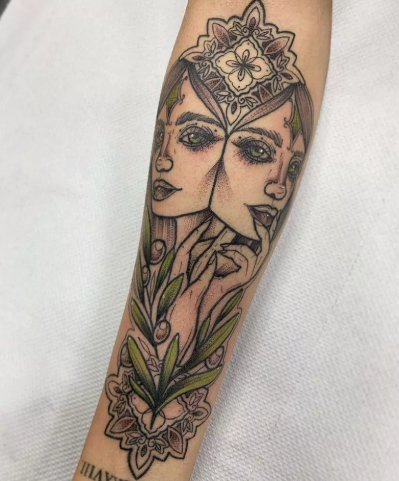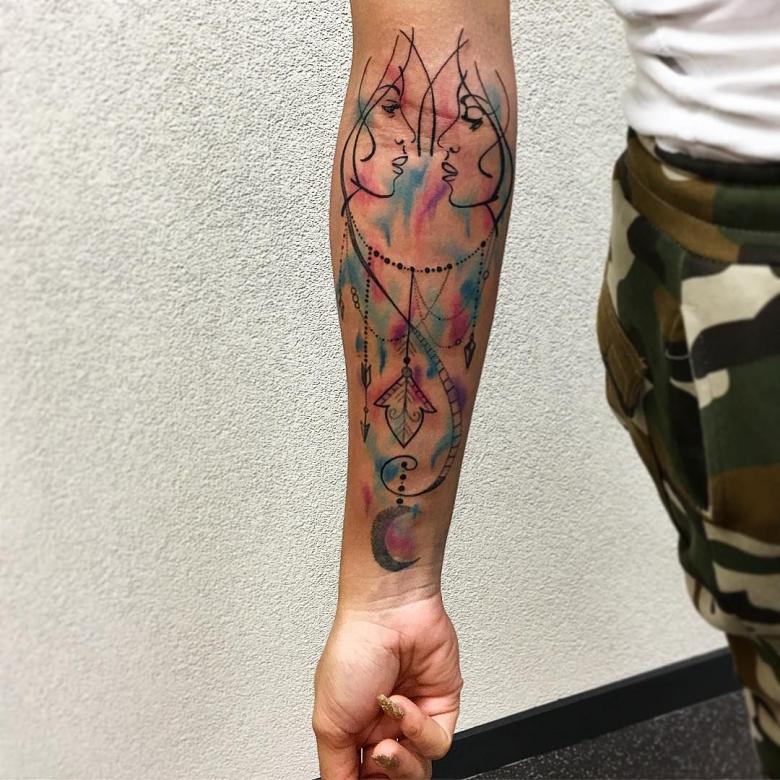 Le signe des Gémeaux a gagné en popularité dans l'industrie du tatouage et son interprétation ne se limite pas à l'horoscope. L'image standard de deux visages identiques est combinée avec d'autres éléments astrologiques, des objets étrangers, selon lesquels la signification du tatouage change.