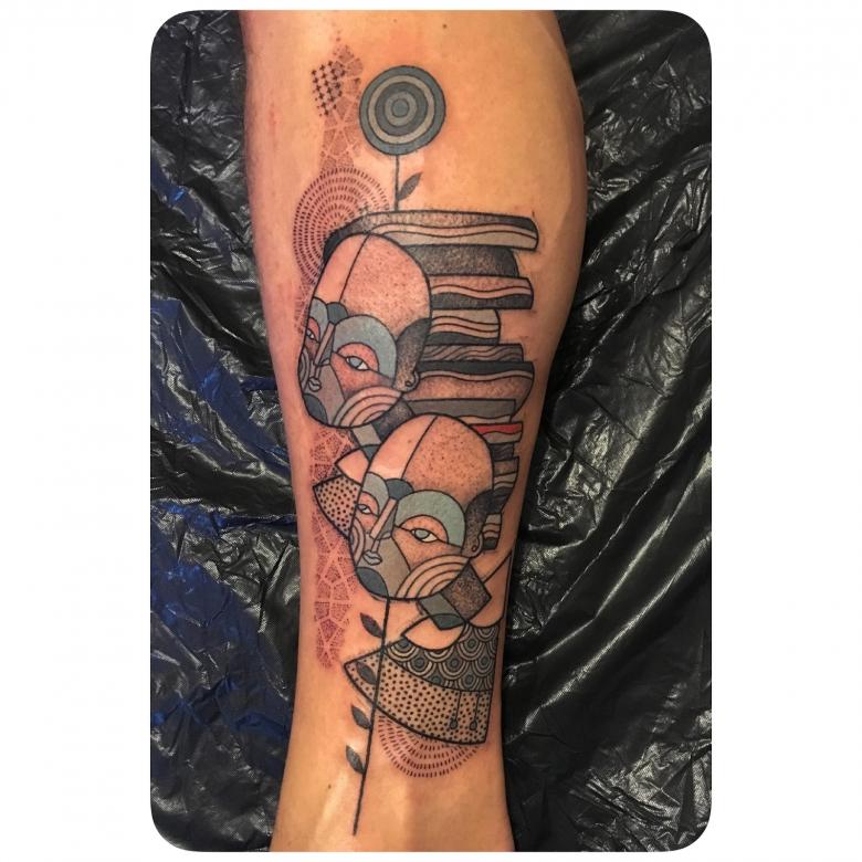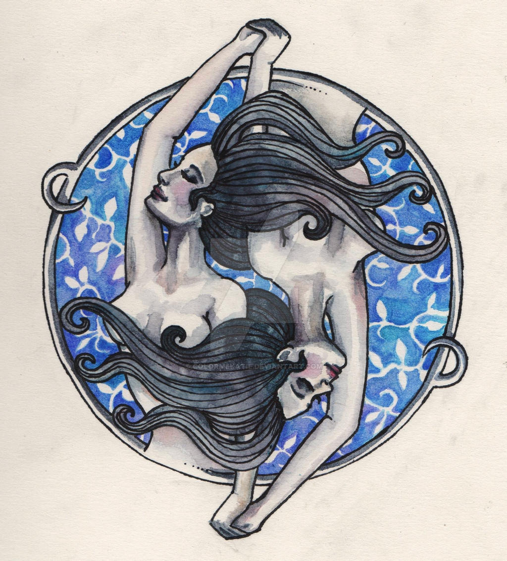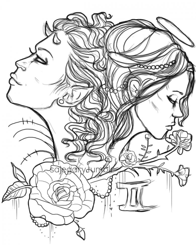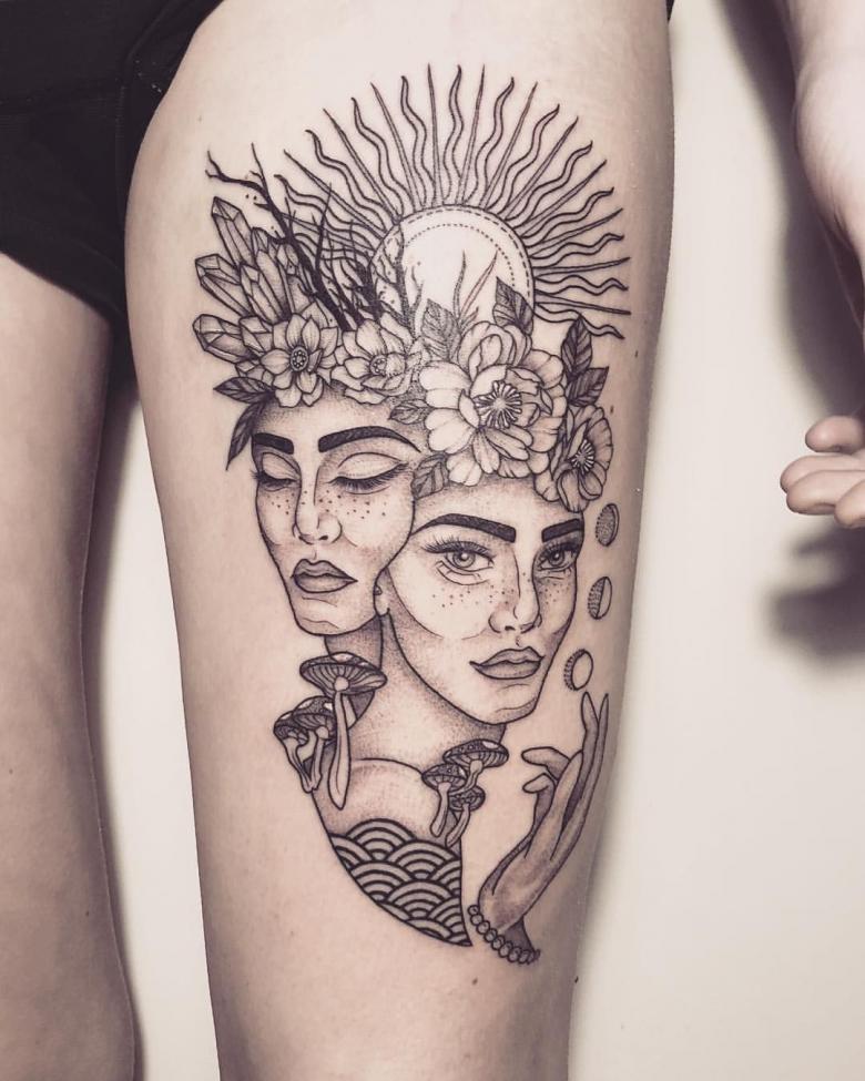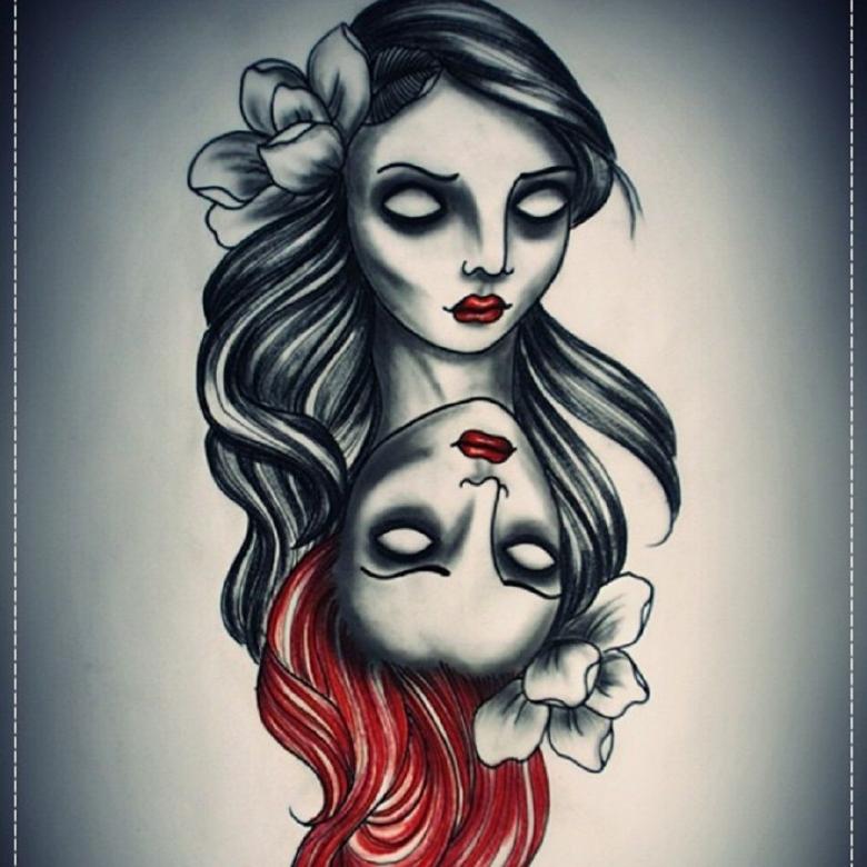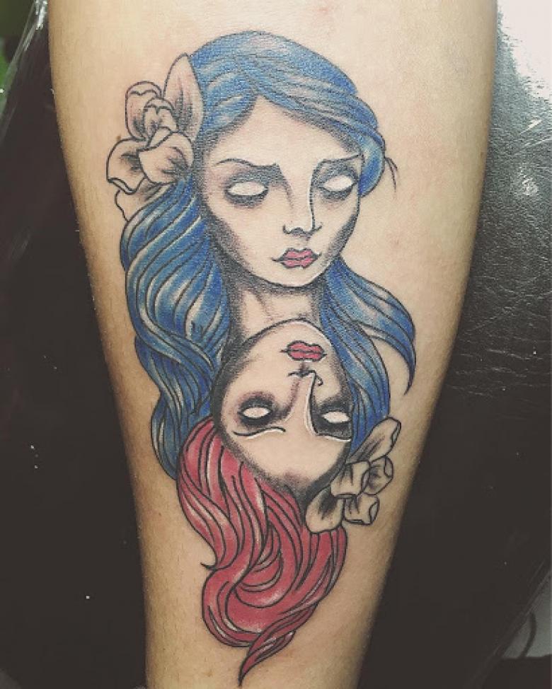 Le signe des Gémeaux a gagné en popularité dans l'industrie du tatouage et son interprétation ne se limite pas à l'horoscope. L'image standard de deux visages identiques est combinée avec d'autres éléments astrologiques, des objets étrangers, selon lesquels la signification du tatouage change.