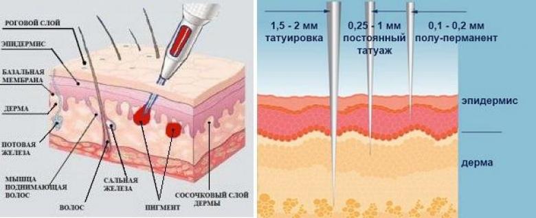 Une distinction entre l'application du tatouage et du permanent est également la profondeur du pigment. Lors du tatouage de pigments sous la peau à une profondeur de 1-1,5 mm, avec le maquillage permanent - pas plus de 0,5-0,8 mm.