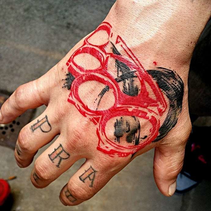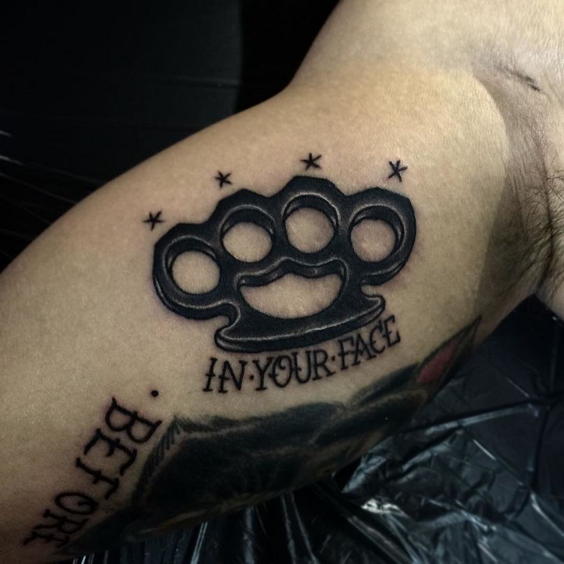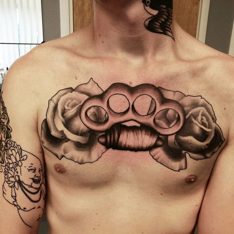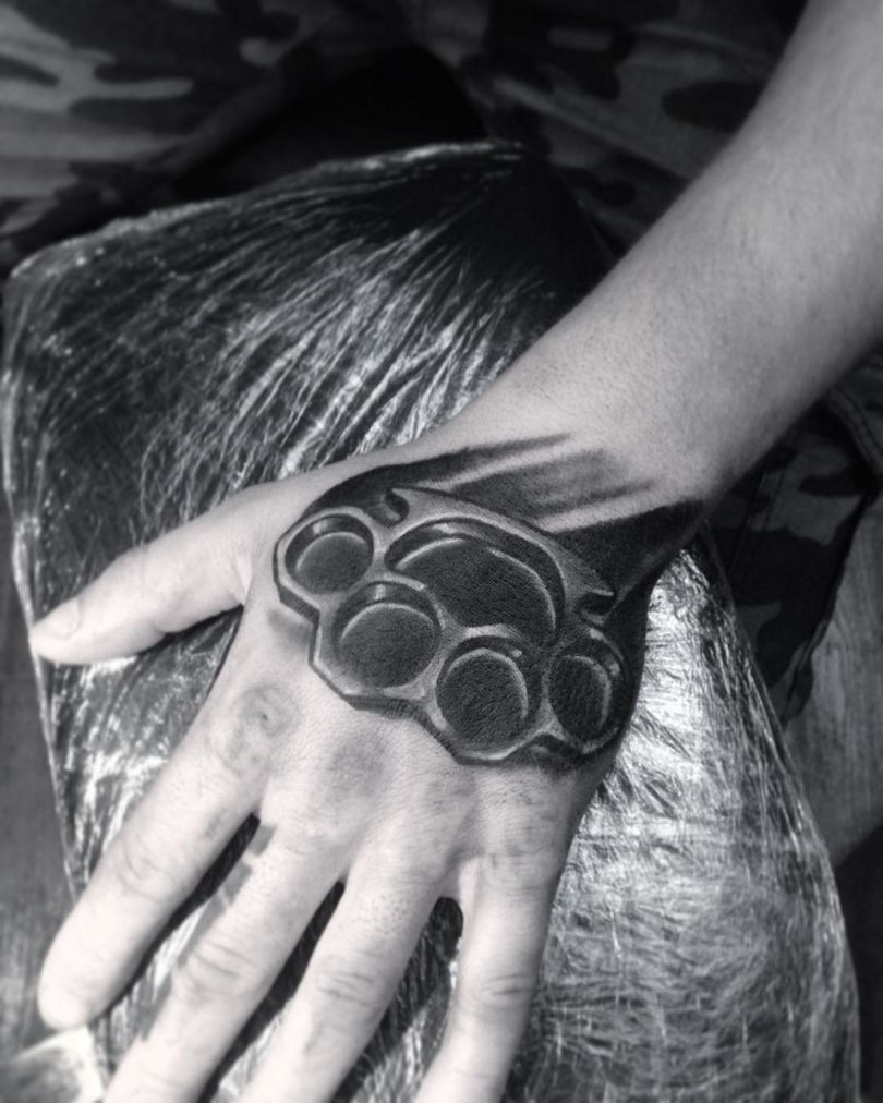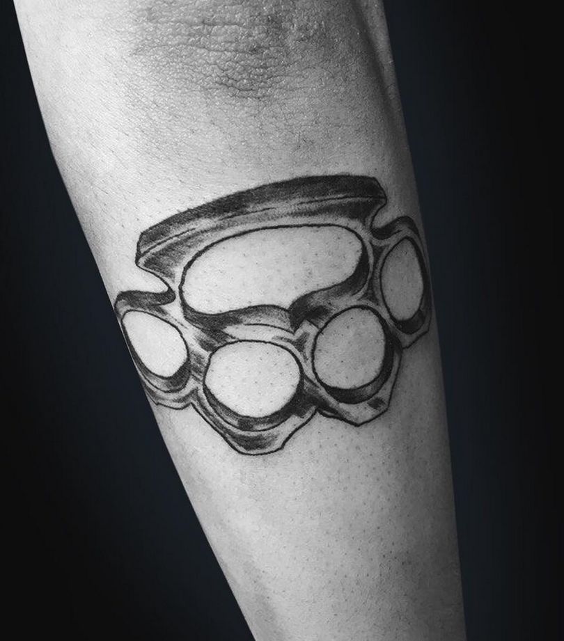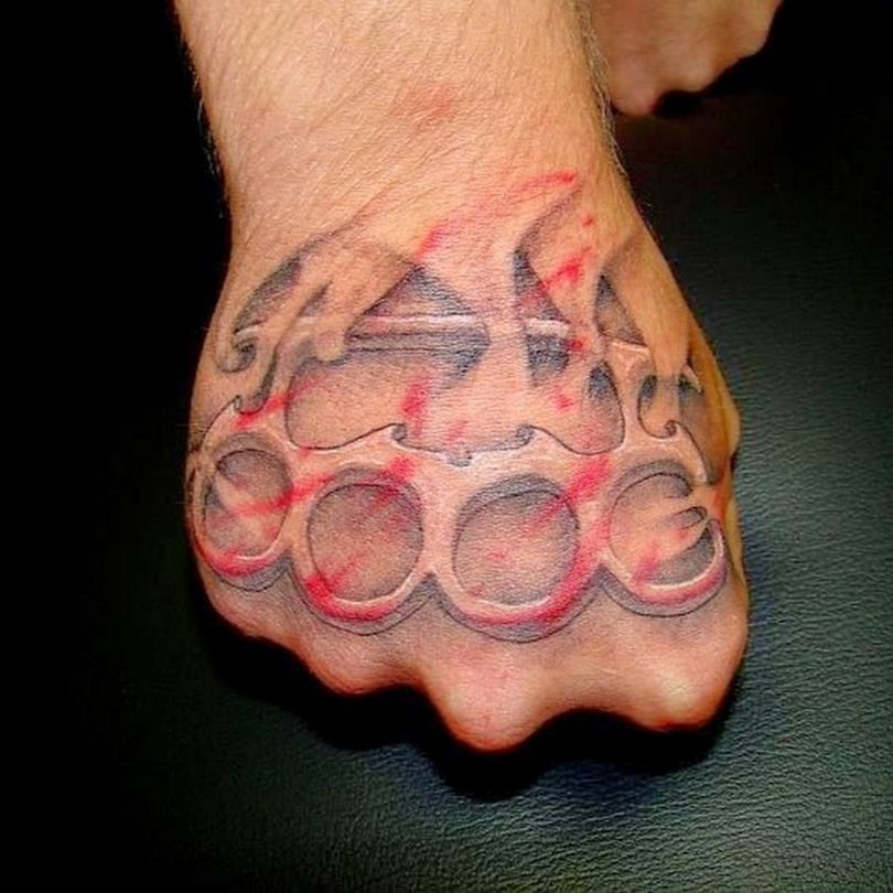Dette er det mest almindelige mandlige mønster på håndleddene, svarende til de klassiske arme. Der er nogle på underarmen og på bagsiden af håndfladerne. Andre kombinationer er på skuldre, bryst og ryg i form af en kniv med et håndtag, der ligner en knojern. Hvis vi ser variationer af billederne, er der en ekstra symbolsk belastning her. Denne mester i knokletatovering har tydeligvis sine egne opfattelser, han er stoisk i vanskelige situationer, elsker magt og er en stor undvigeren.