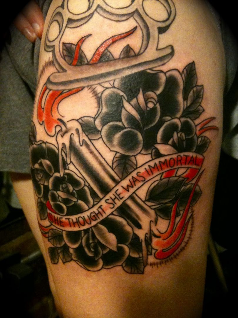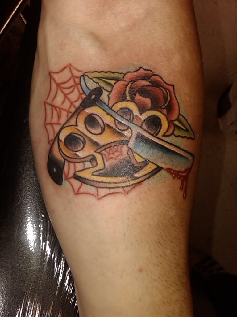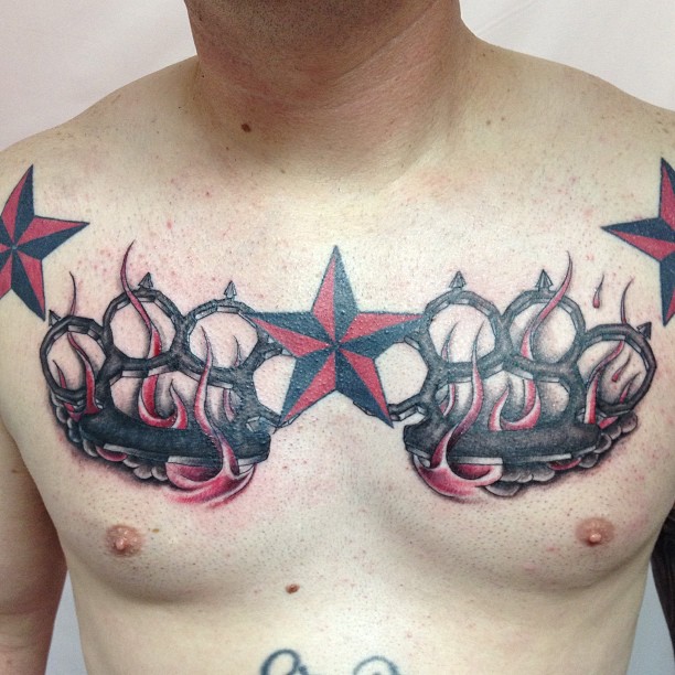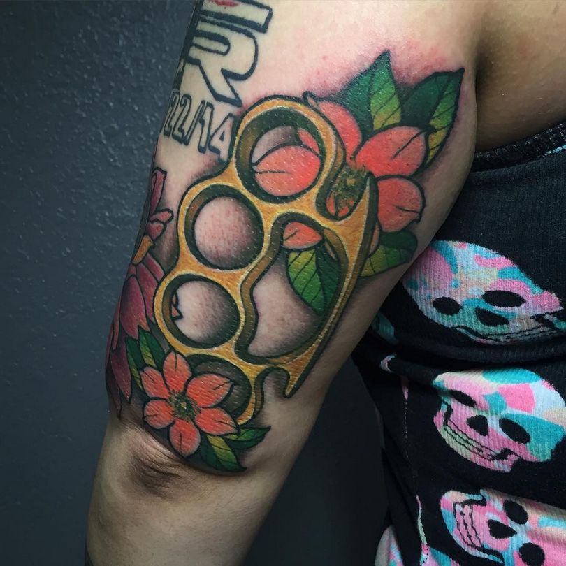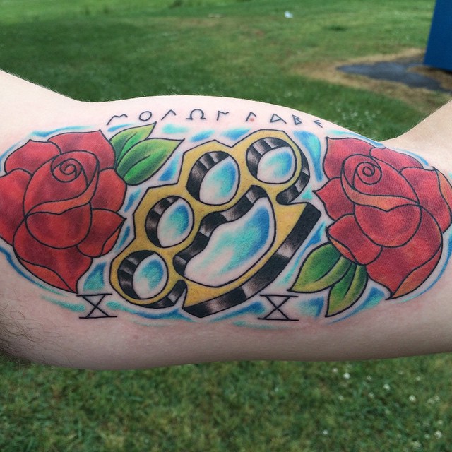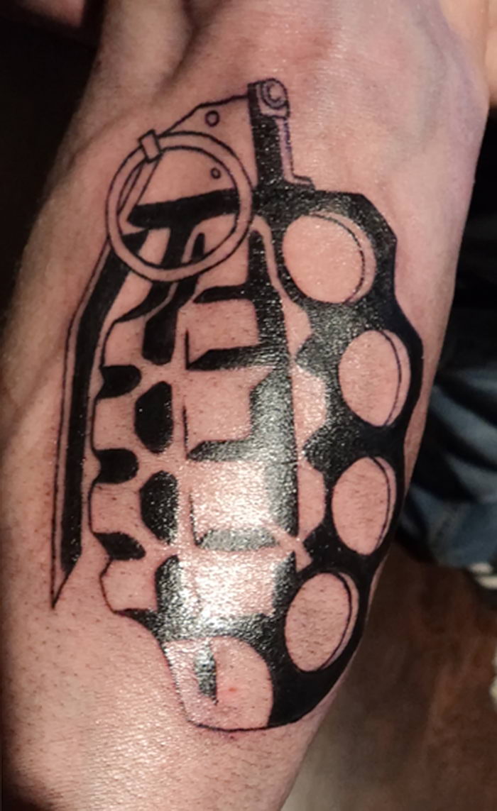Dette er det mest almindelige mandlige mønster på håndleddene, svarende til de klassiske arme. Der er nogle på underarmen og på bagsiden af håndfladerne. Andre kombinationer er på skuldre, bryst og ryg i form af en kniv med et håndtag, der ligner en knojern. Hvis vi ser variationer af billederne, er der en ekstra symbolsk belastning her. Denne mester i knokletatovering har tydeligvis sine egne opfattelser, han er stoisk i vanskelige situationer, elsker magt og er en stor undvigeren.