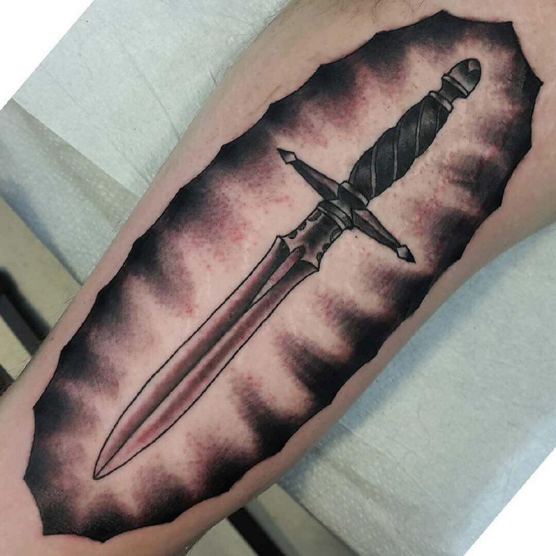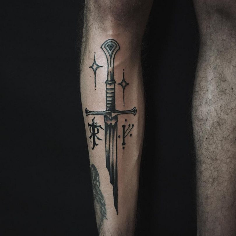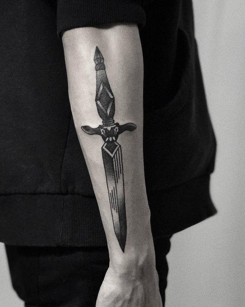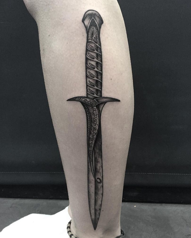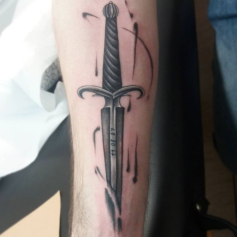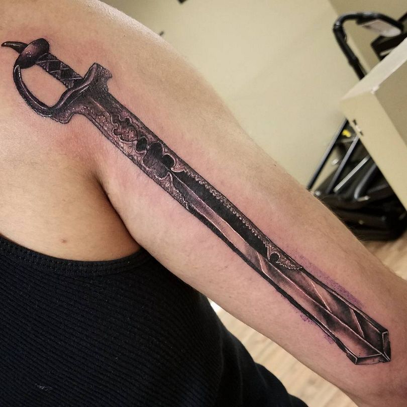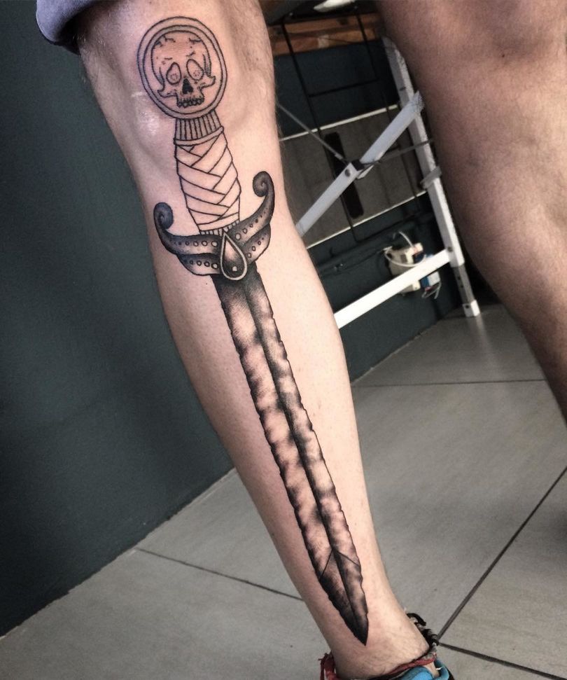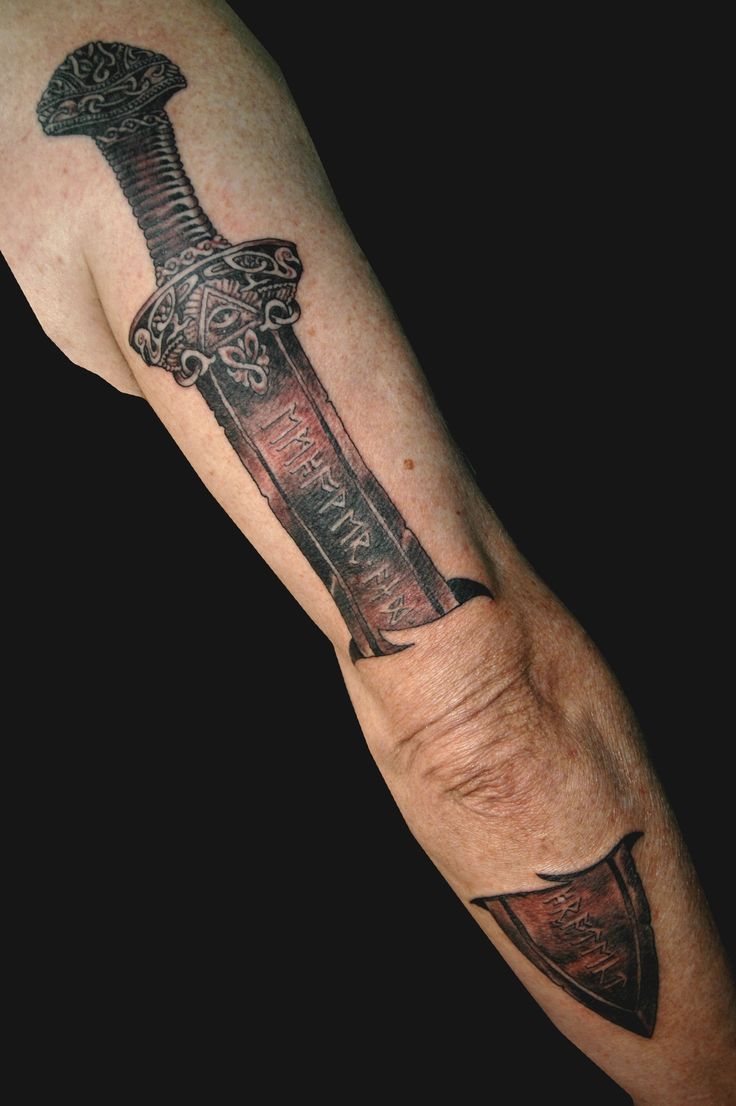 Ikke sjældent forekommer der tatoveringer med kantede våben, og et sværd er den mest populære af dem.