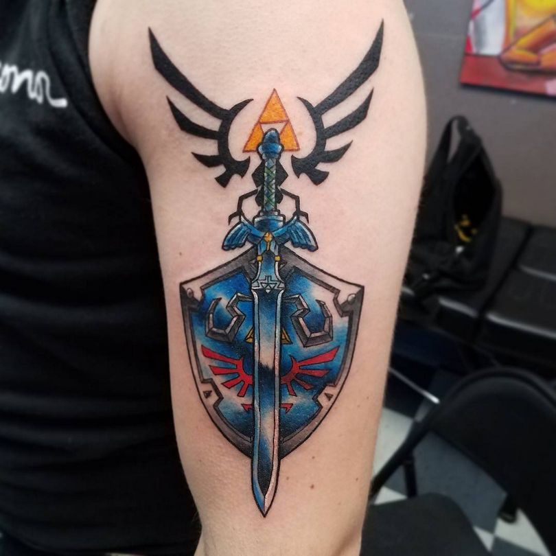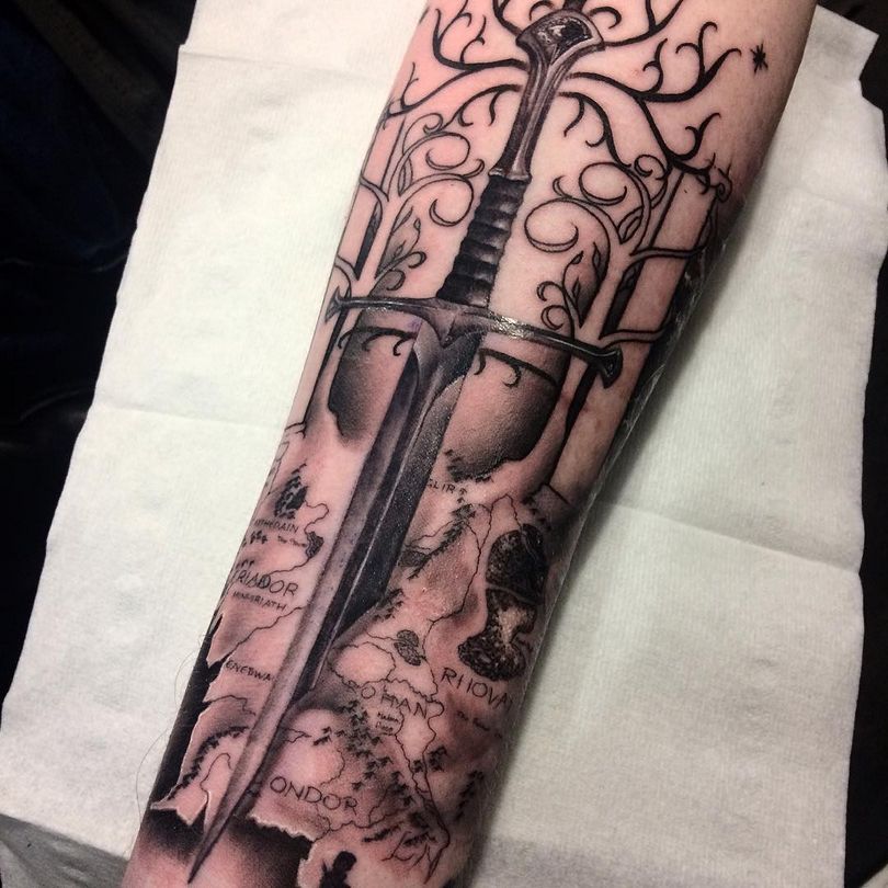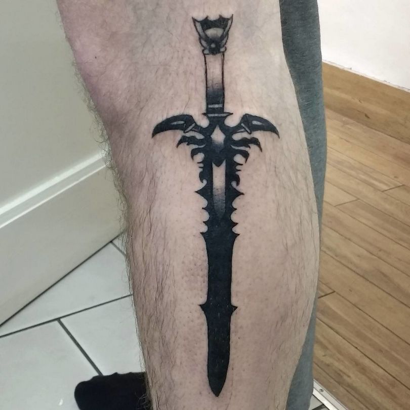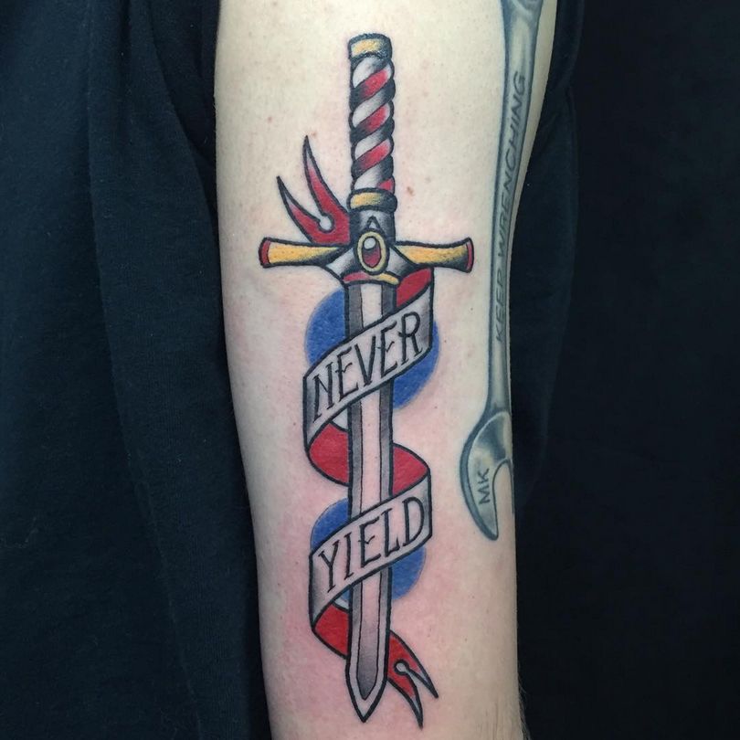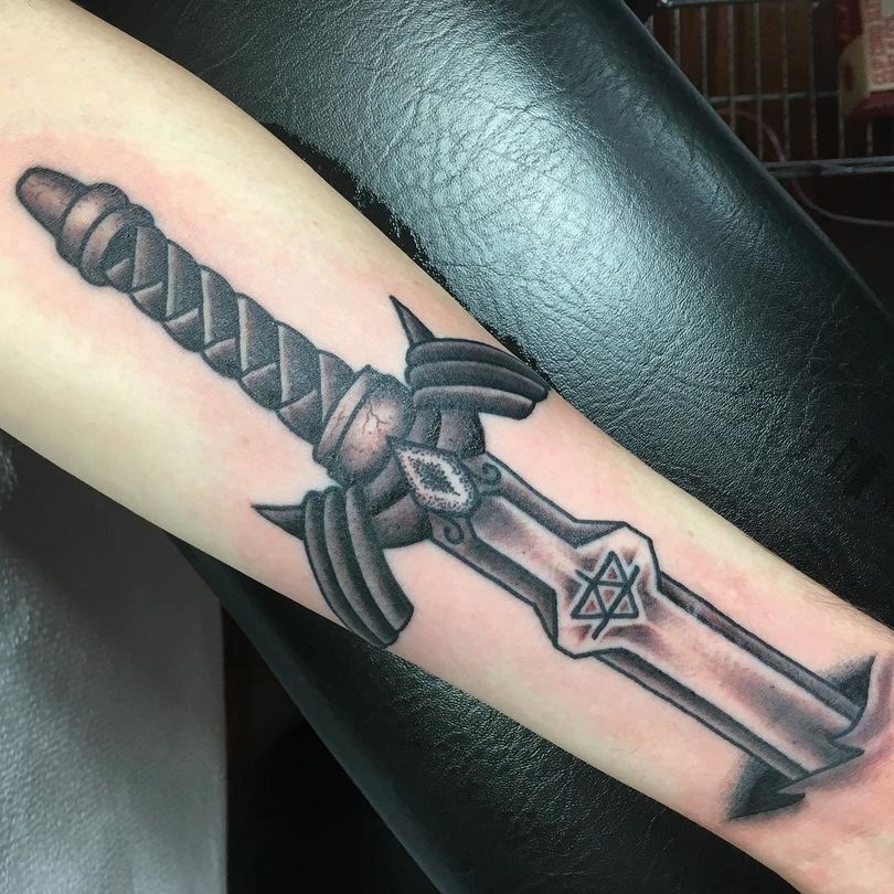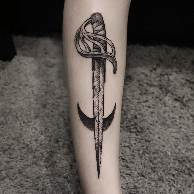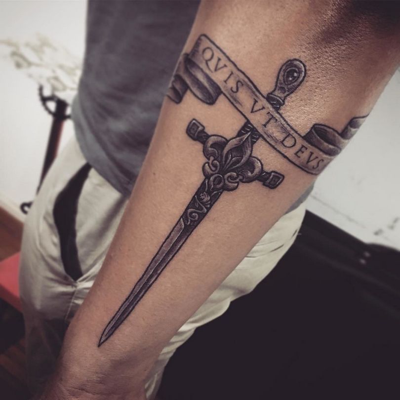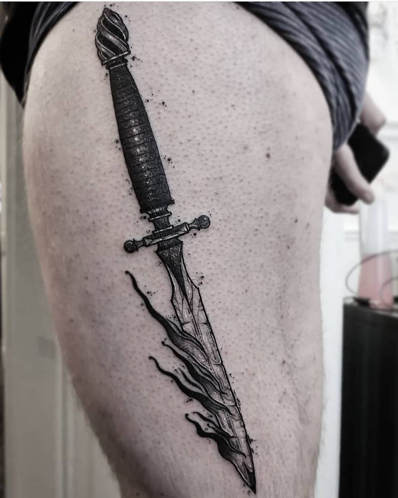 Ikke sjældent forekommer der tatoveringer med kantede våben, og et sværd er den mest populære af dem.