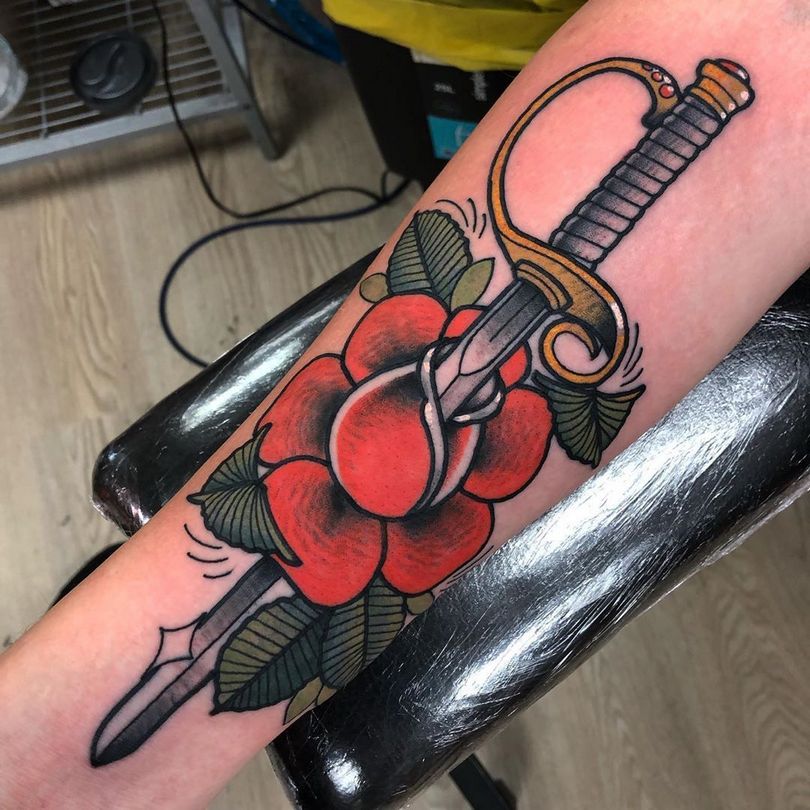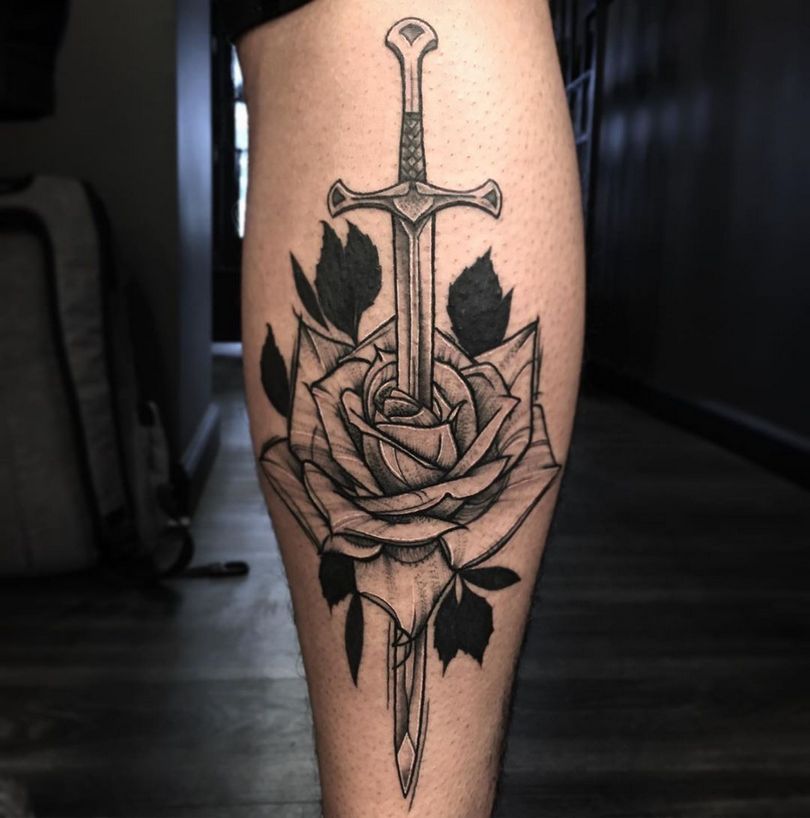 Sværdet med en rose eller blomster er den mest populære udsmykning på en kvindes krop. Det er et symbol på romantik og store følelser. Selv om blomstens farve kan fortælle en masse: hvid er renhed og uskyld, gul er glød og glæde, rød eller orange er lidenskab.