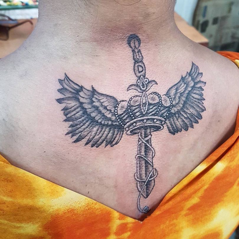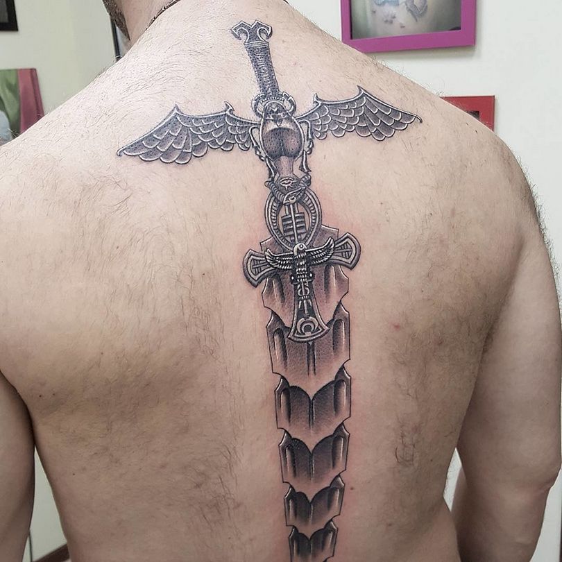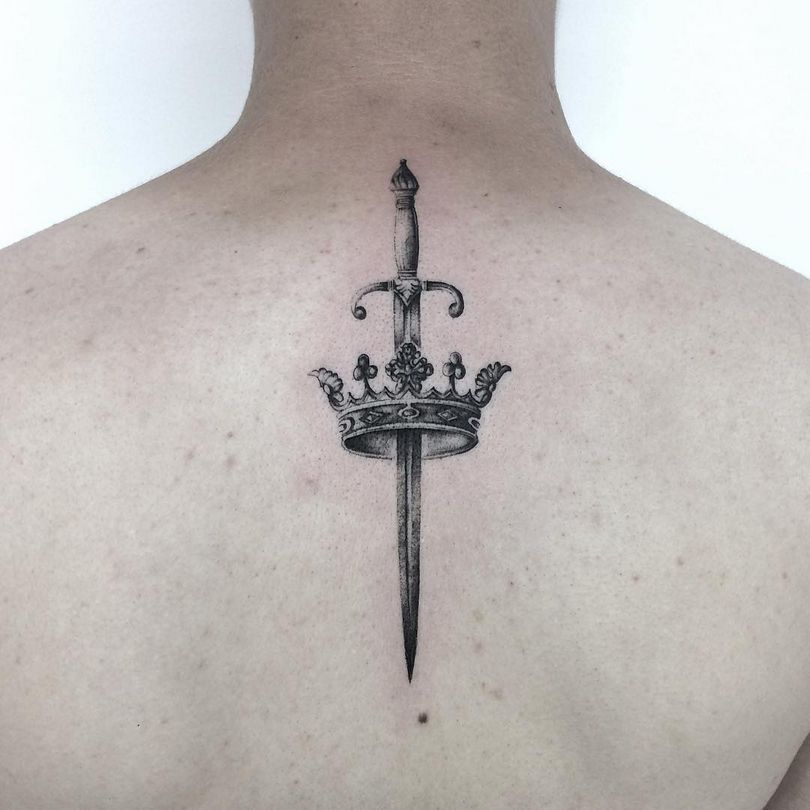 For store tatoveringer skal du vælge ryggen eller brystet, hvor der er plads nok til en hel samling af sværd. De mest populære billeder blandt mænd er et sværd med vinger, med et kranie, med en rose og krydsede klinger.