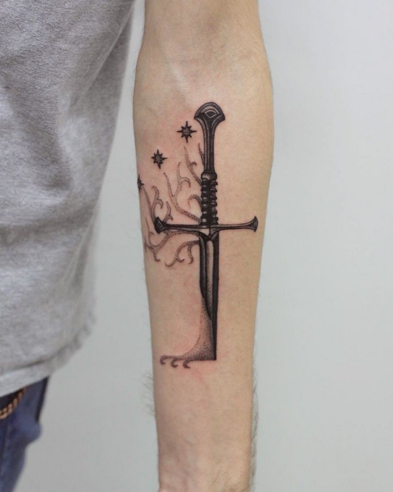 For at udtrykke deres beslutsomhed og mod tatoverer mænd sig med et sværd. Mest af alt kan det stærke køn lide at få tatoveringer på armene for at understrege deres mod og bevidsthed om deres handlinger.