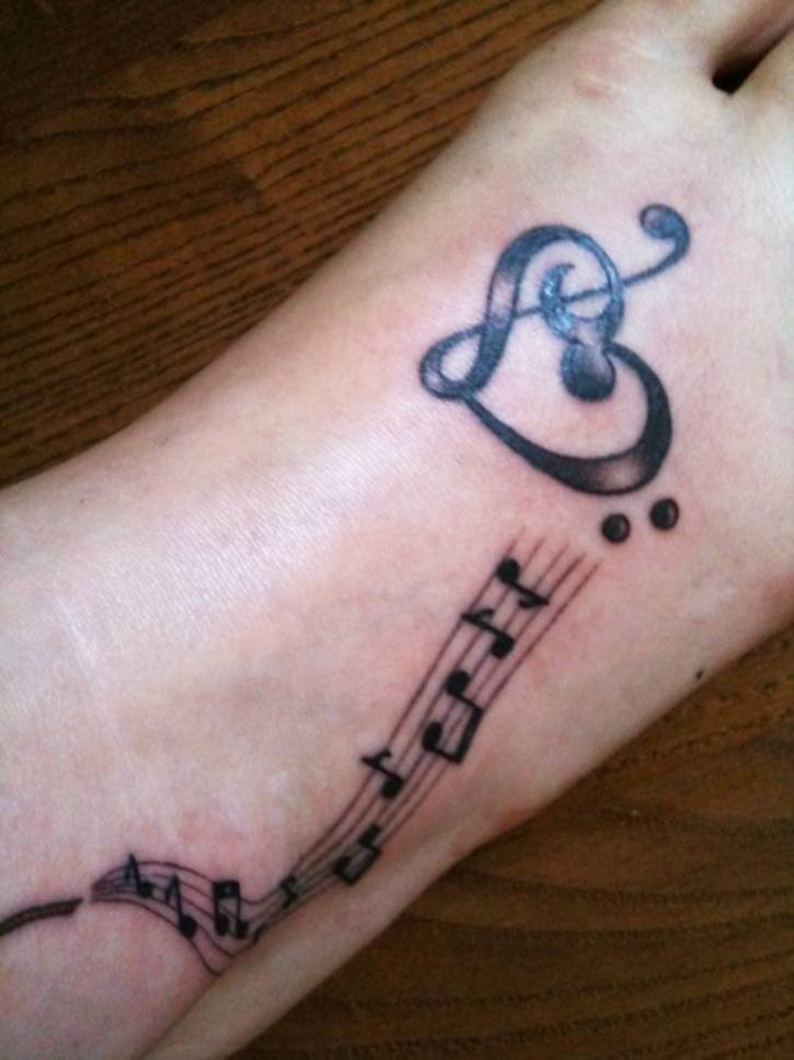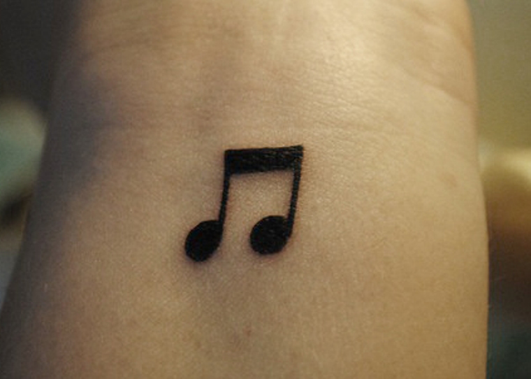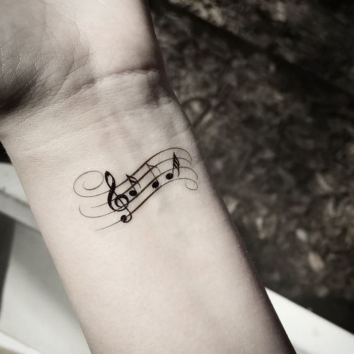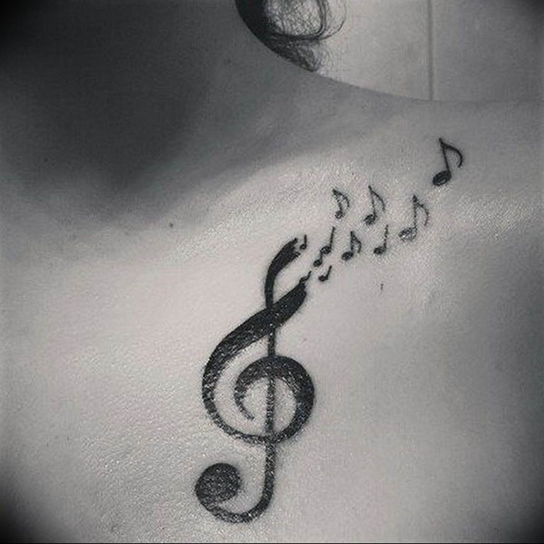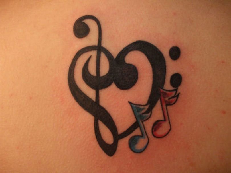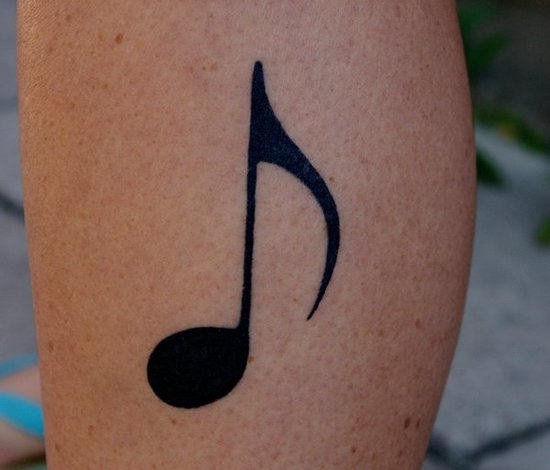 Når vi taler om farveskalaen af tatoveringer med musikalske symboler, er det værd at tage hensyn til, at de oftest er helt ensfarvede, som noder på et stykke papir.