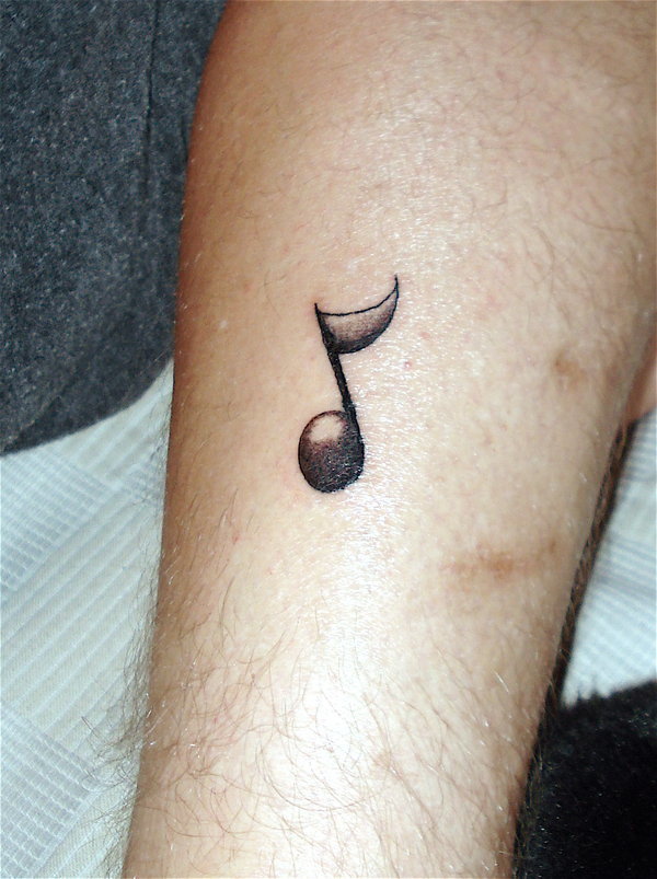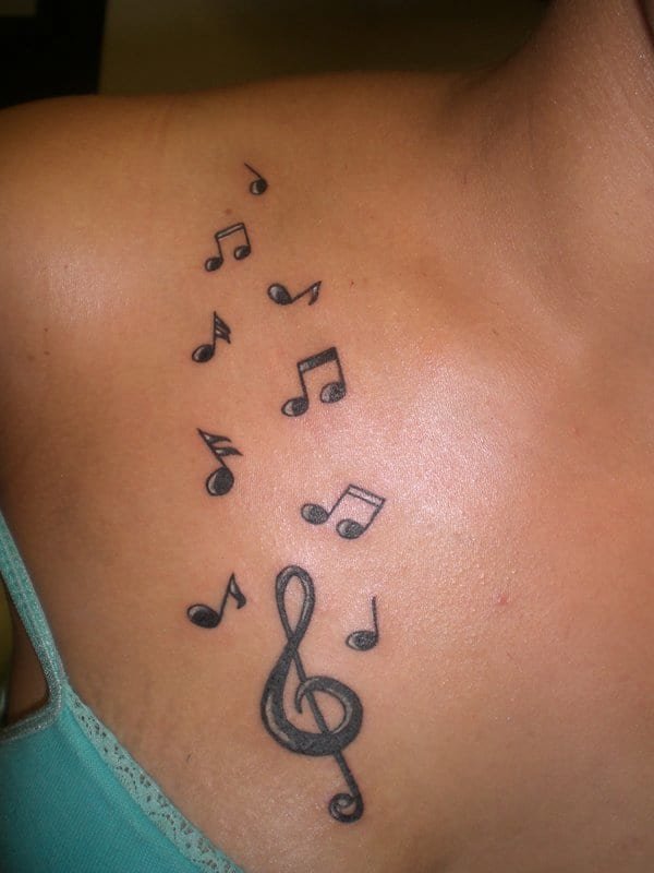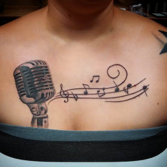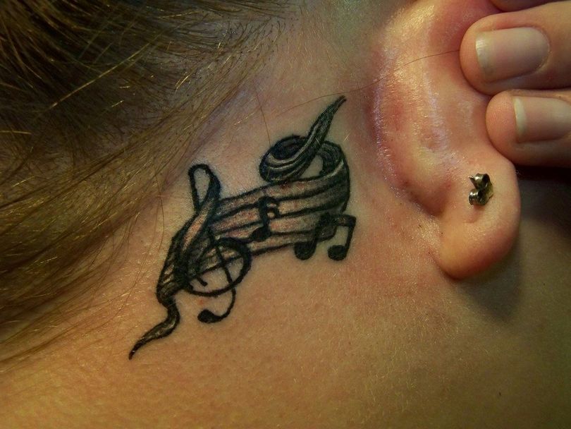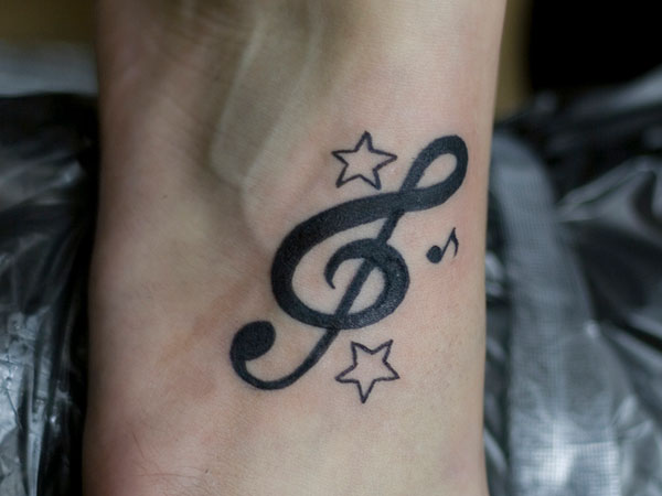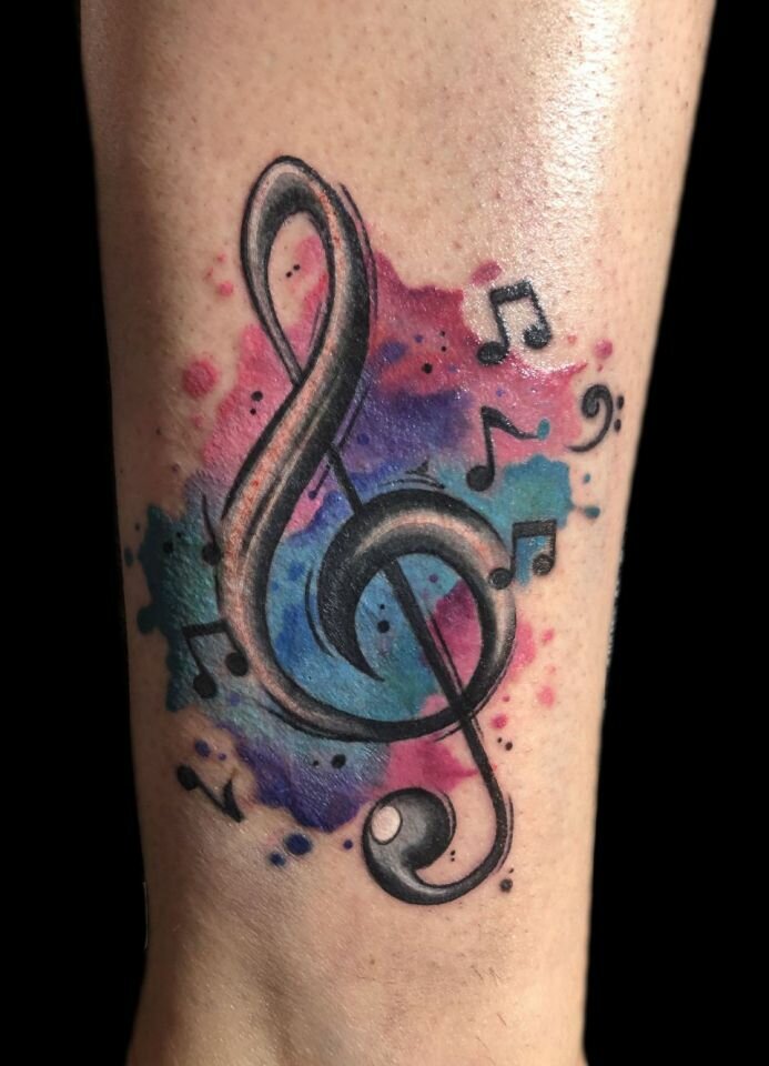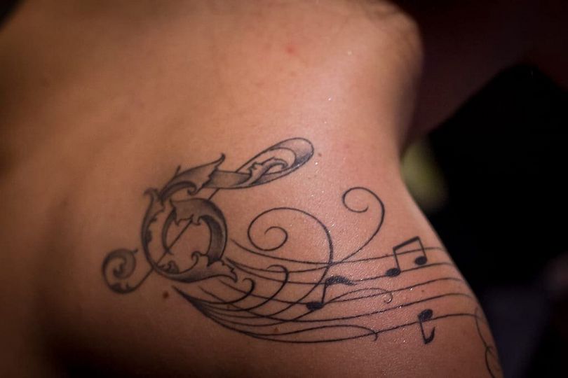 Når vi taler om farveskalaen af tatoveringer med musikalske symboler, er det værd at tage hensyn til, at de oftest er helt ensfarvede, som noder på et stykke papir.