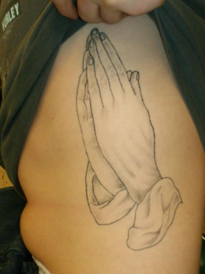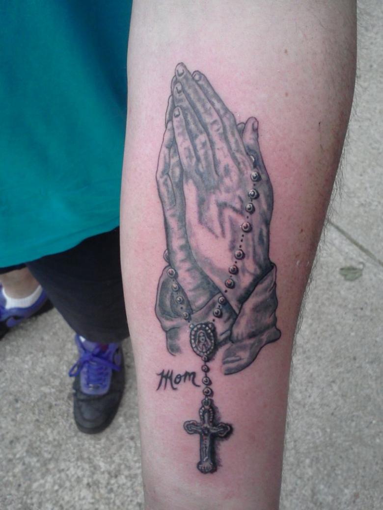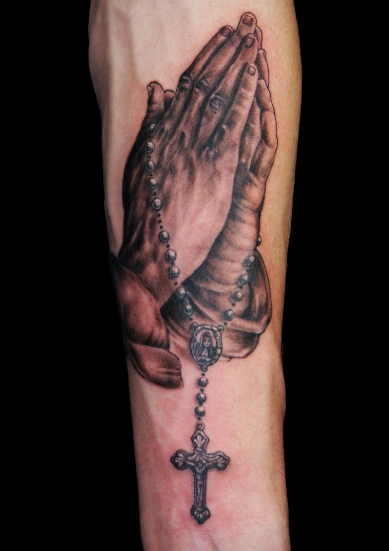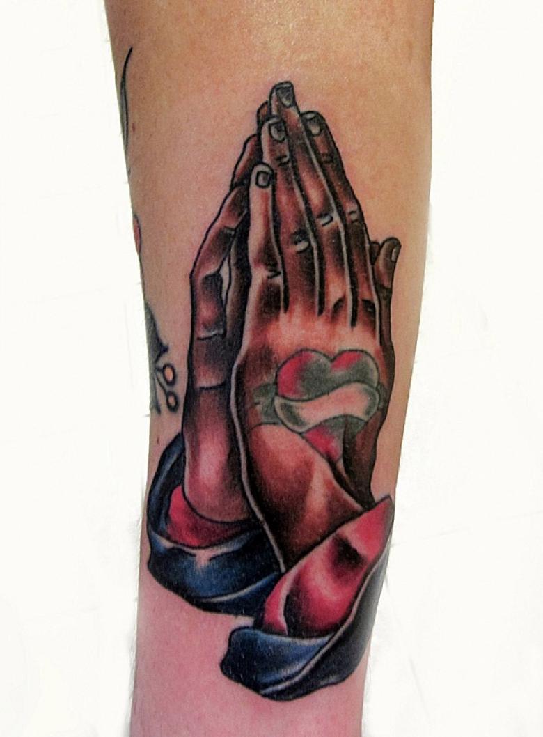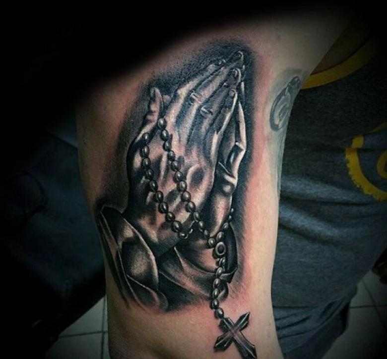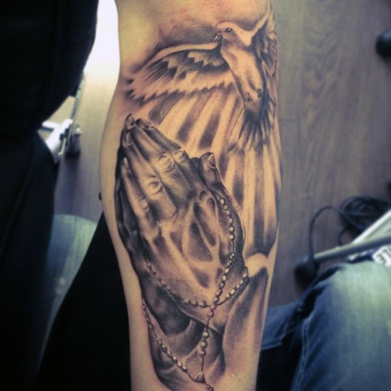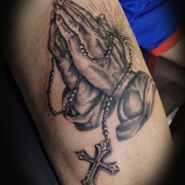 Den bedende persons armtatovering er ofte lavet i to farver, hvoraf den ene nødvendigvis er sort. Der er afvigelser fra den klassiske version - med en rosenkrans, et kors, ja, endda en bog i hånden. Denne tatovering nyder en vis popularitet, især hos de ekstraordinære.