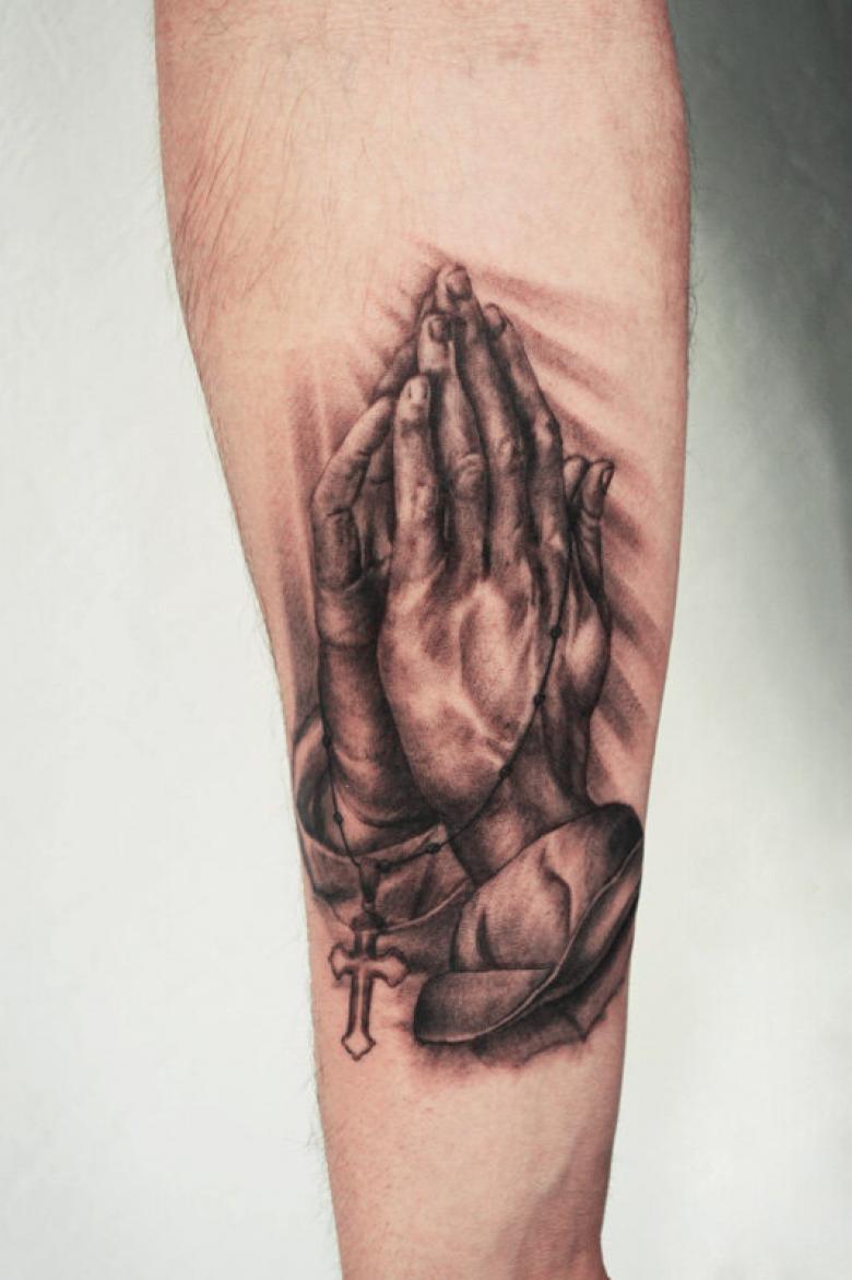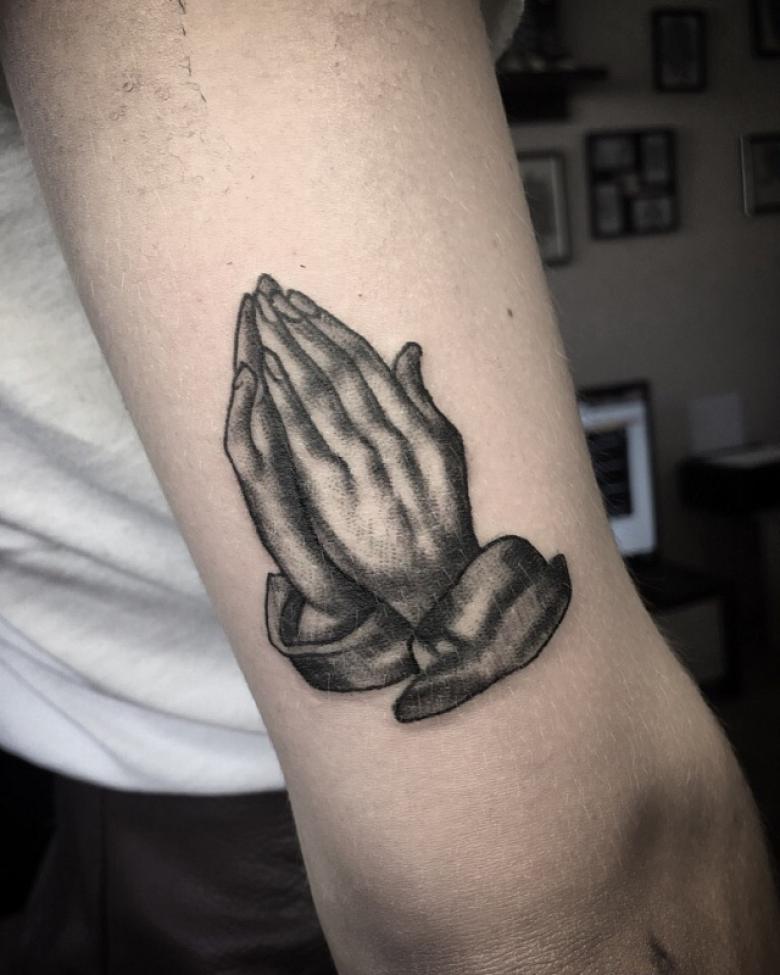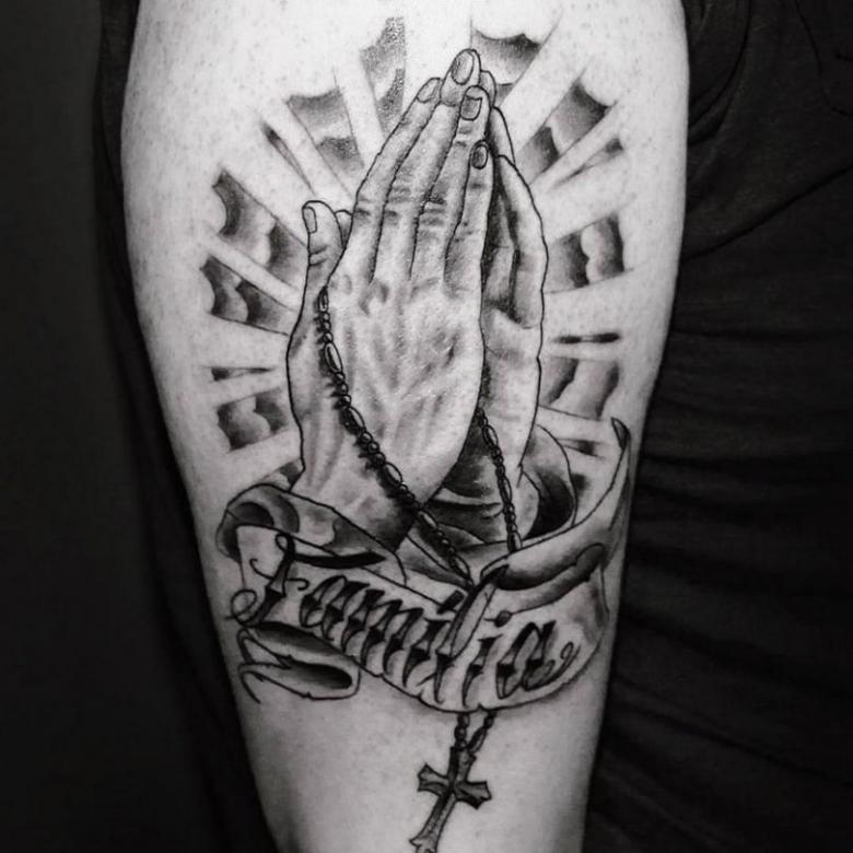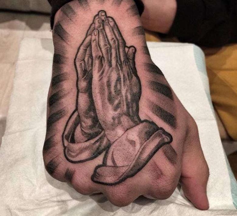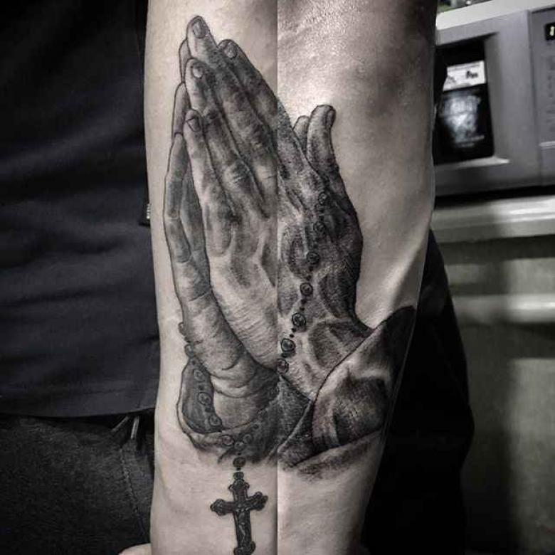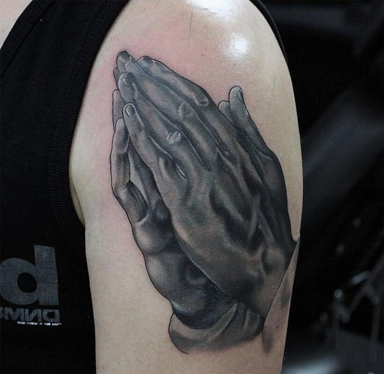 Den bedende mands håndtatovering skal minde om, at der findes en åndelig verden sammen med den materielle verden. En person bør ikke kun være fordybet i jagten på jordiske goder, han bør altid huske Gud og de højere magter. Bønnen skaber en forbindelse med disse kræfter, fylder med styrke og inspiration og udfylder sjælens tomhed.