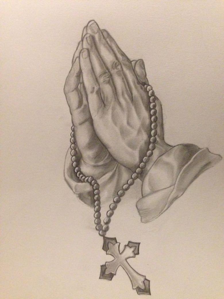 - hænderne foldet i en bønsgestus, med en rosenkrans eller et kors;
