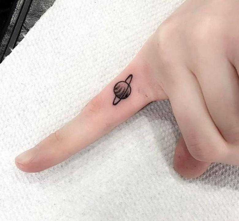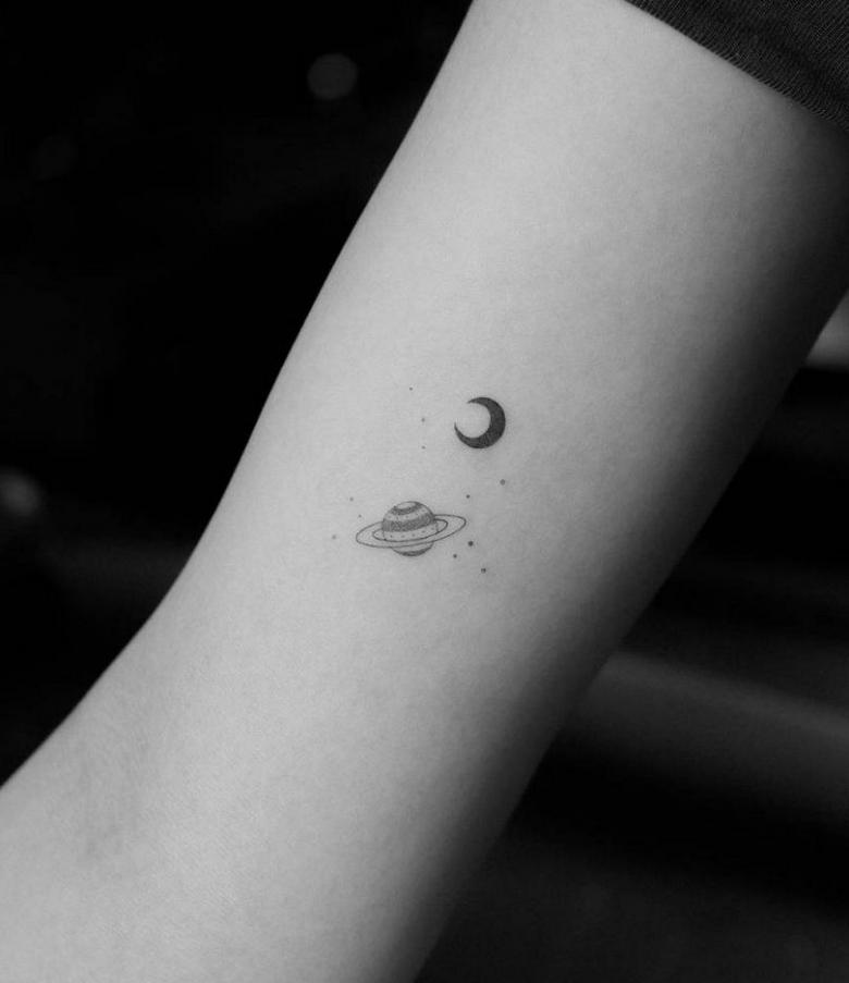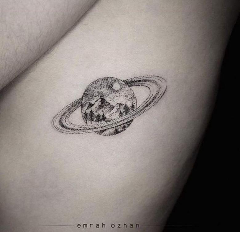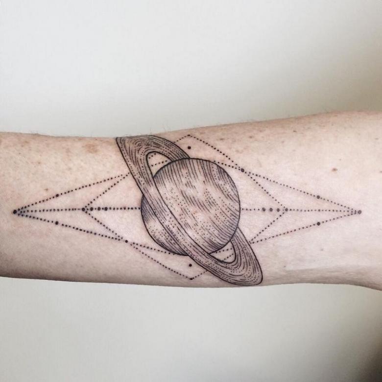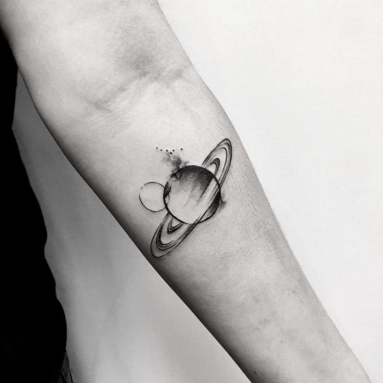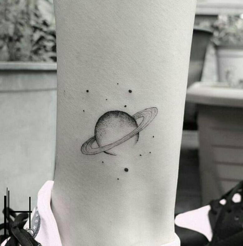 De flotteste af dem alle er de minimalistiske designs, hvor planeten er skitseret ved hjælp af fine linjer og prikker. Manglen på farver og den slørede baggrund giver en kortfattet og stilfuld tatovering.