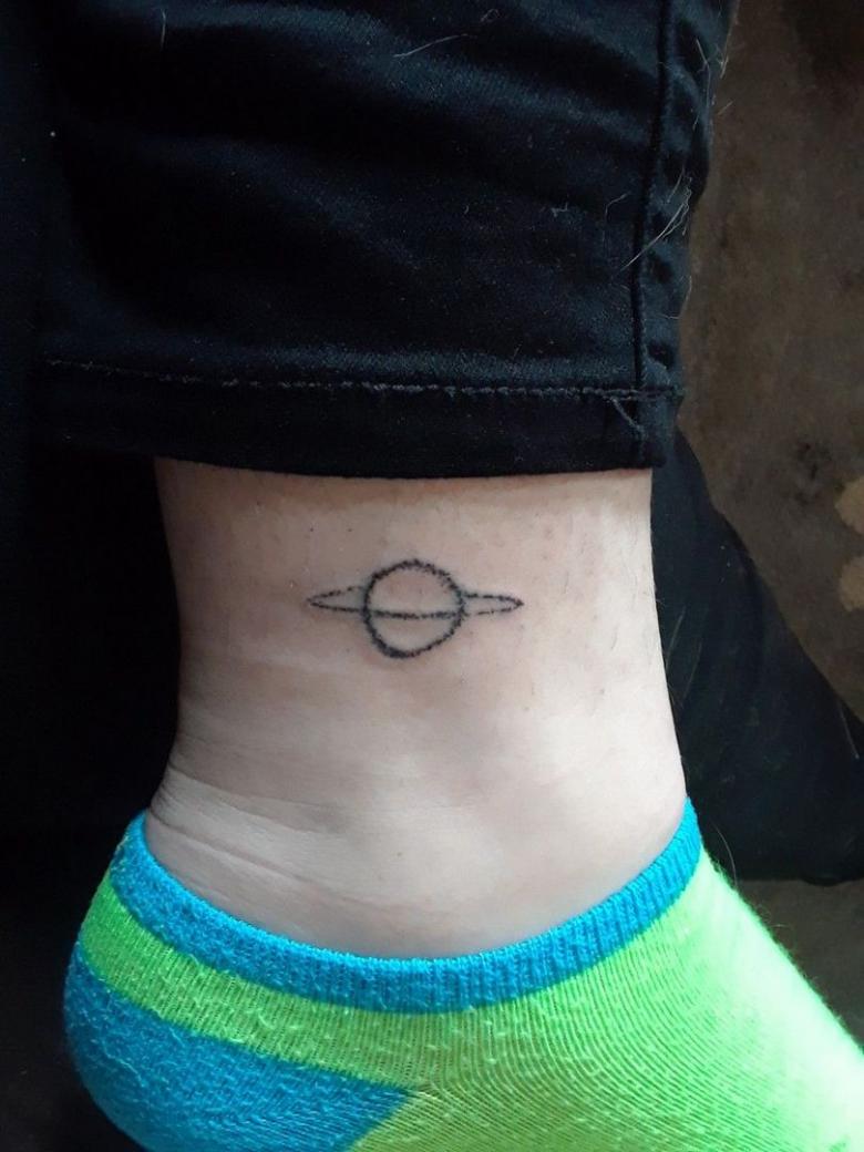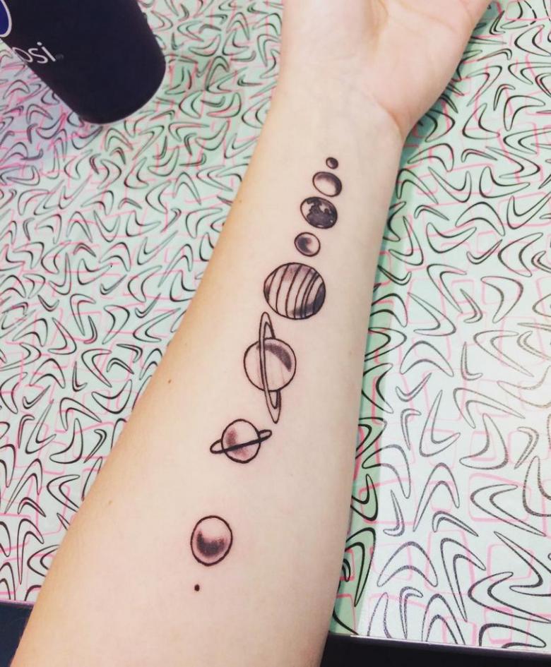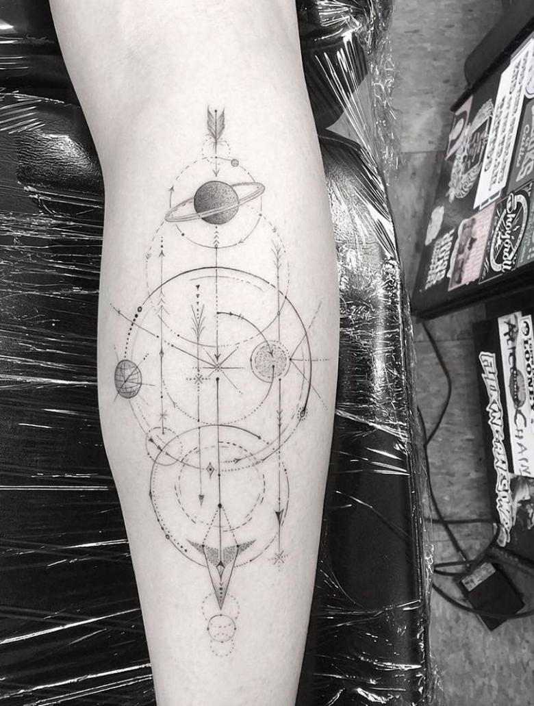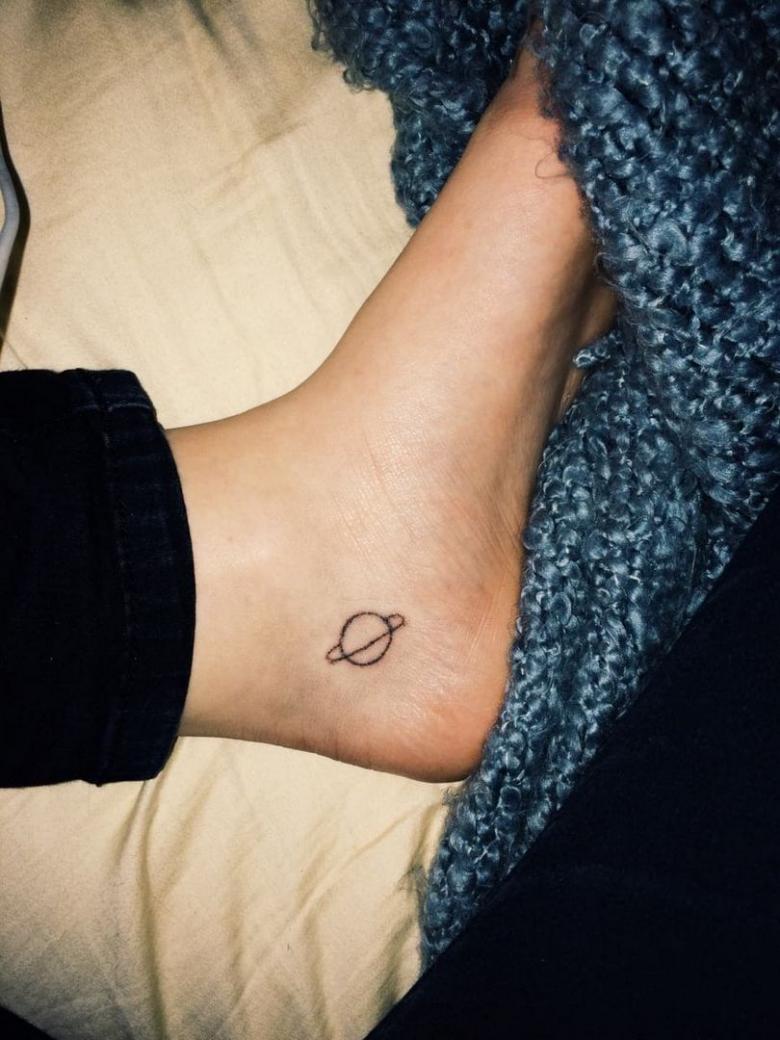 De flotteste af dem alle er de minimalistiske designs, hvor planeten er skitseret ved hjælp af fine linjer og prikker. Manglen på farver og den slørede baggrund giver en kortfattet og stilfuld tatovering.