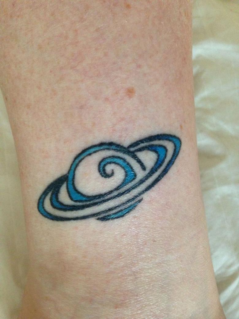 Oftest i mørke farver. Der anvendes forskellige nuancer, og akvarelteknikken er typisk. Planetens ringe er traditionelt tydelige i deres konturer. Nogle gange er billedet kombineret med stjerner eller andre kosmiske elementer. Det er sjældent, at tatoveringer ledsages af inskriptioner, ofte på latin, med smukke ordsprog om livets skrøbelighed.
