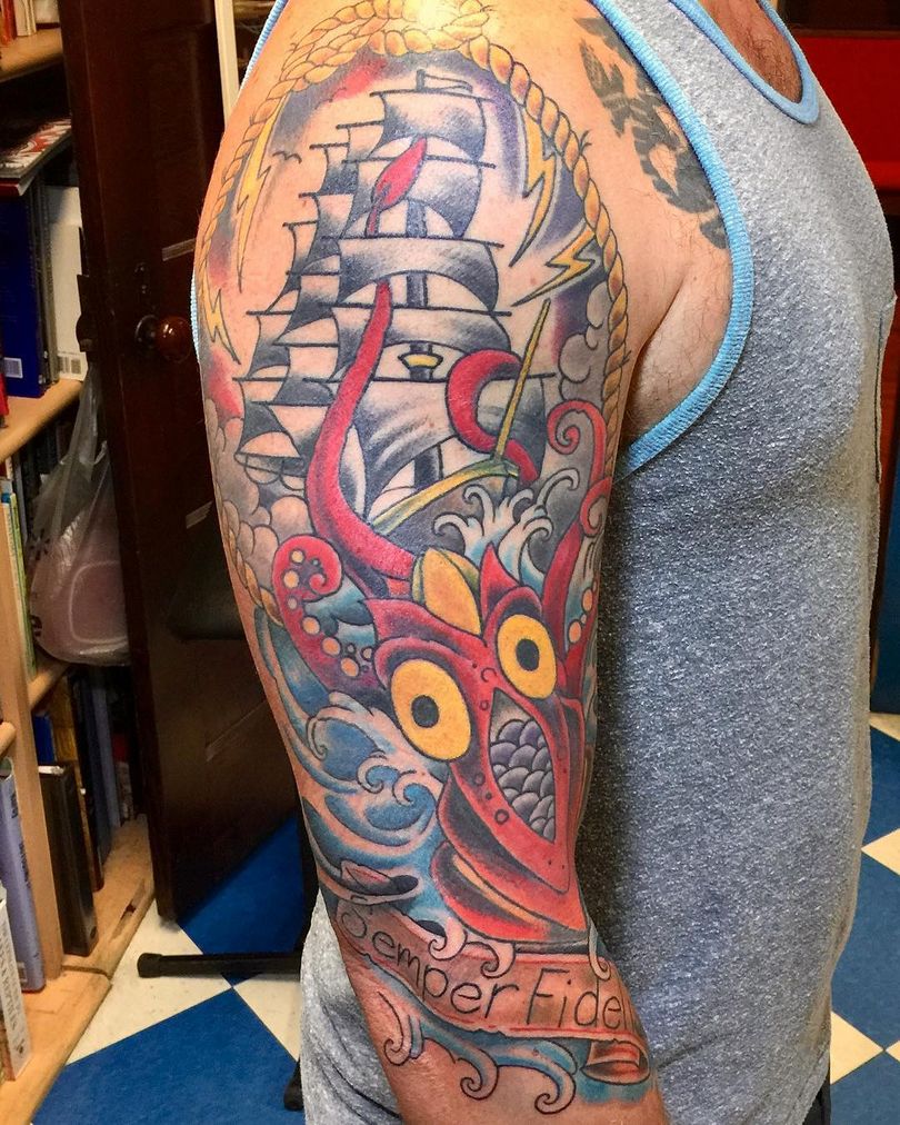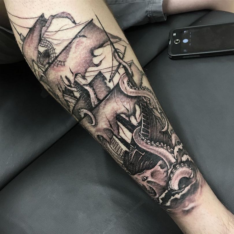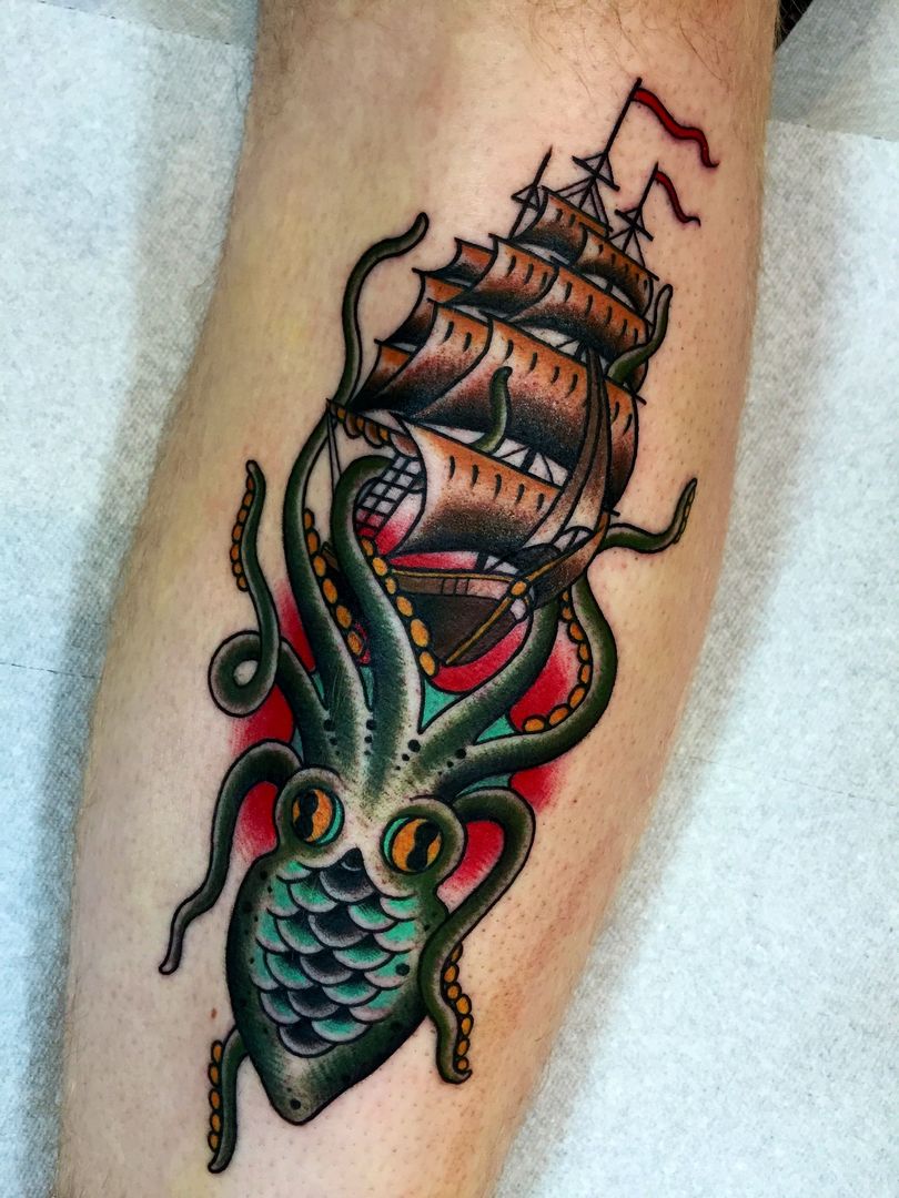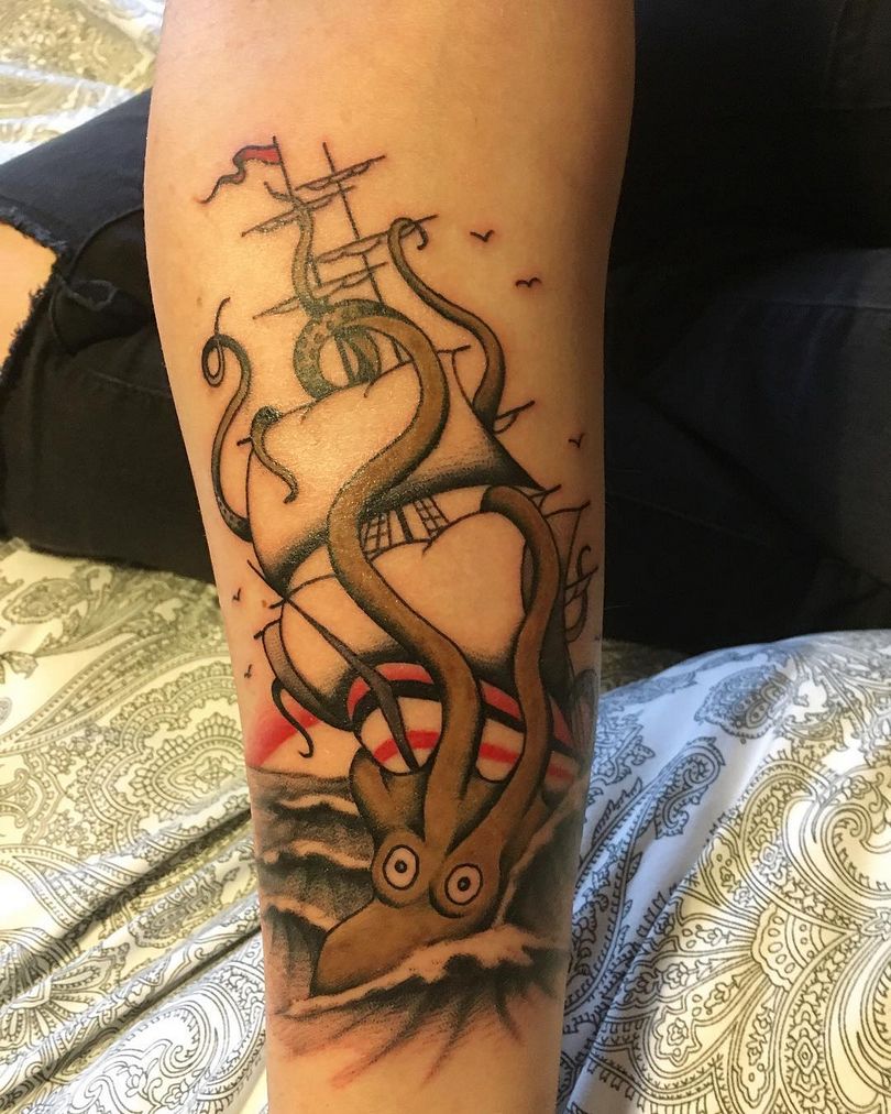 - Glücklich. Ursprünglich wurde das Kraken-Tattoo mit Angehörigen maritimer Berufe - Matrosen, Fischern - und einfach mit Liebhabern des Meeres in Verbindung gebracht. Sie betrachteten ihn als eine Art Talisman gegen Unglück auf hoher See oder einer langen Reise.