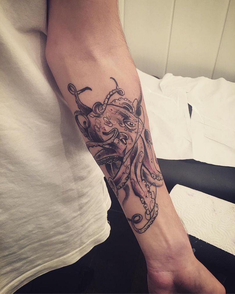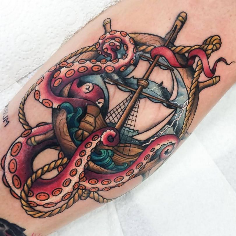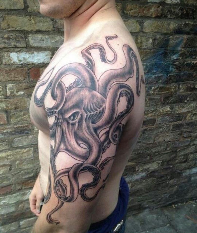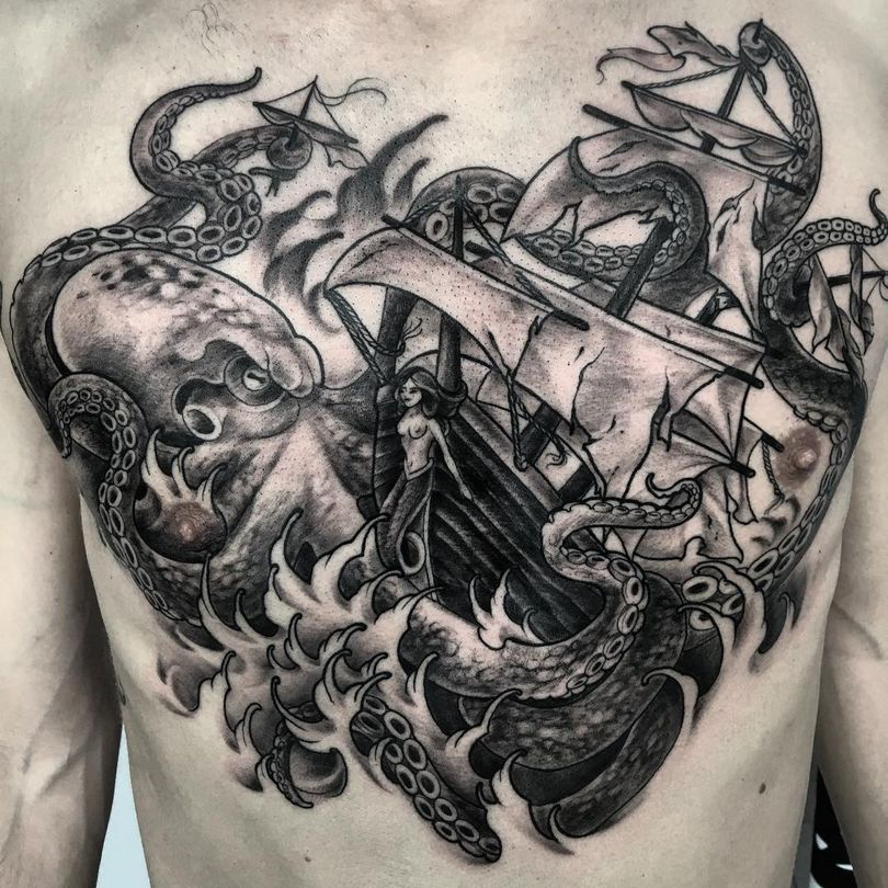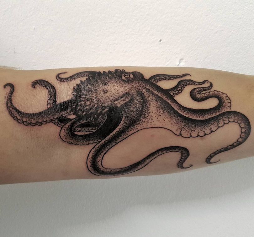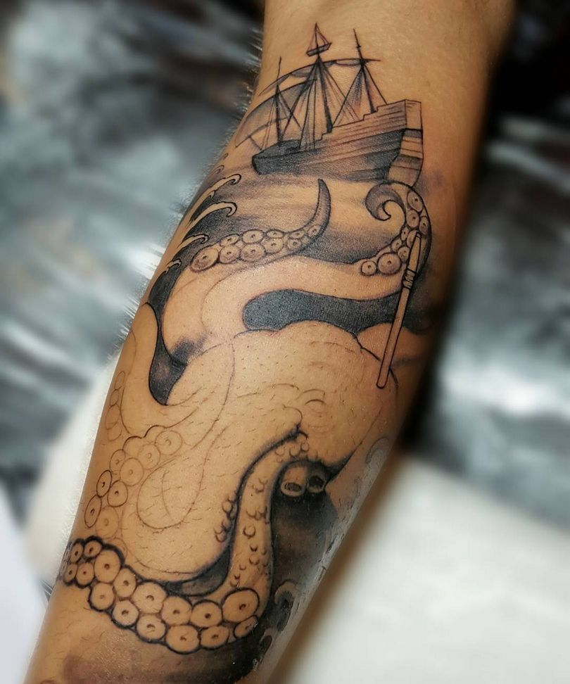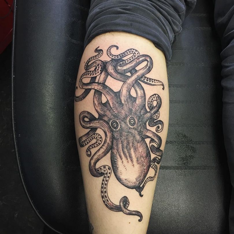 Das Kraken-Tattoo symbolisiert Intelligenz, Intuition und Stärke. Der Träger einer solchen Tätowierung ist zweifellos ein willensstarker Mensch.