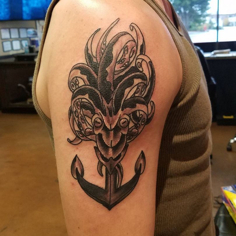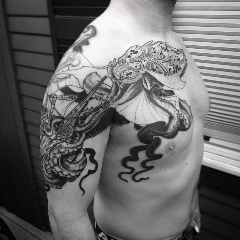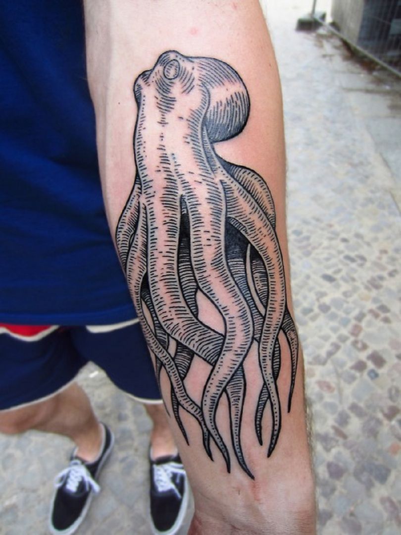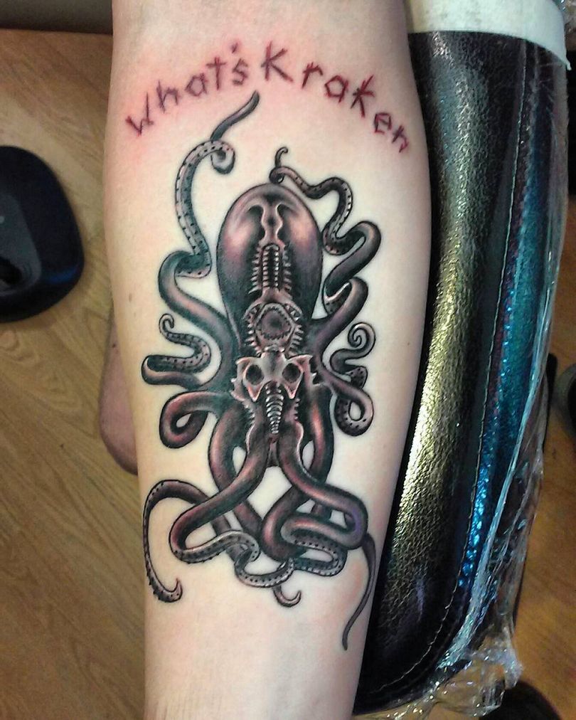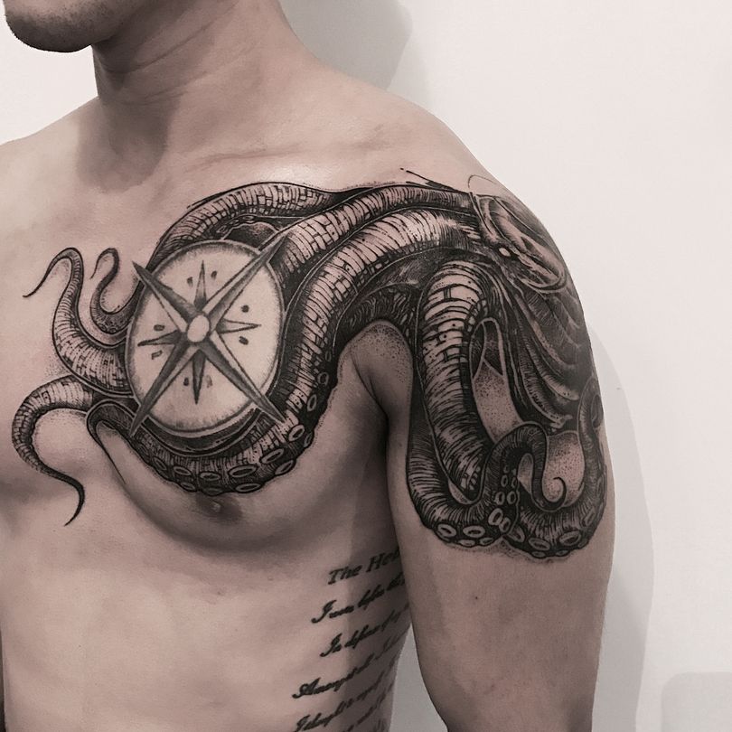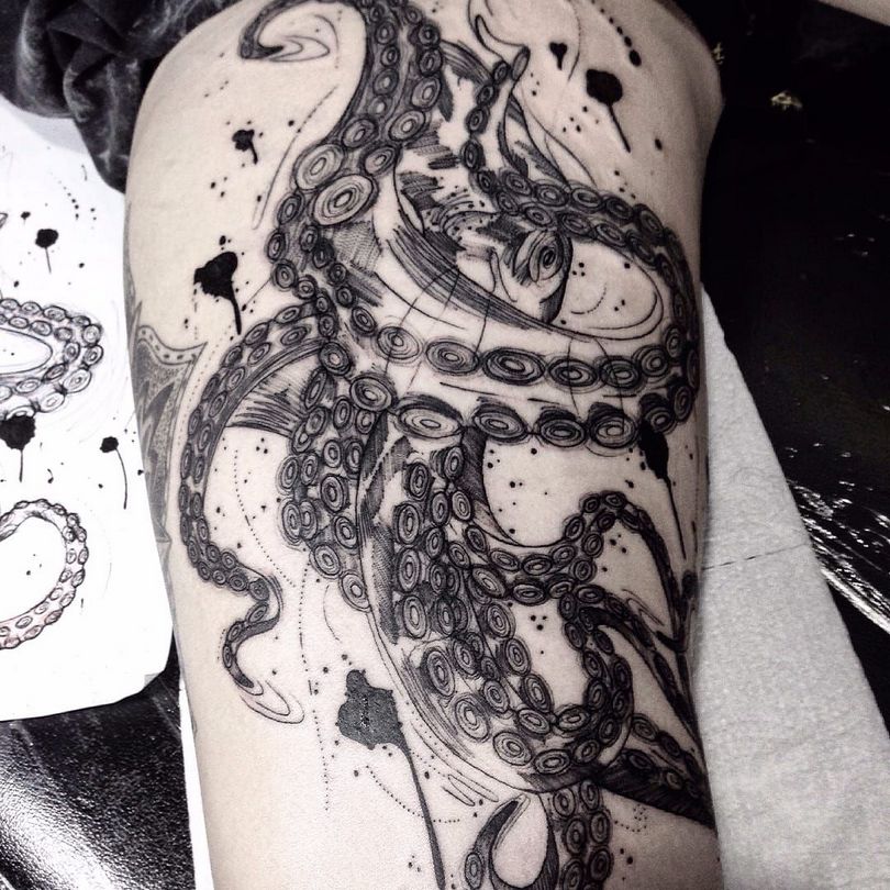 Das Kraken-Tattoo symbolisiert Intelligenz, Intuition und Stärke. Der Träger einer solchen Tätowierung ist zweifellos ein willensstarker Mensch.