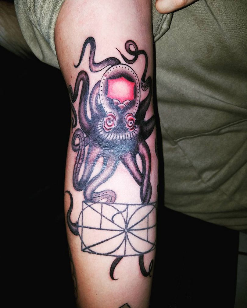- Flexibilität. Ein Oktopus kann etwa das Vierfache seines Körpervolumens schrumpfen. So kann man an die Labilität und Flexibilität der Person denken, die das Tattoo trägt. In der Regel ist ein solcher Mensch recht geduldig, manchmal auch zwielichtig; er kriecht in jede Ritze, er kennt Ihr tiefstes Geheimnis.