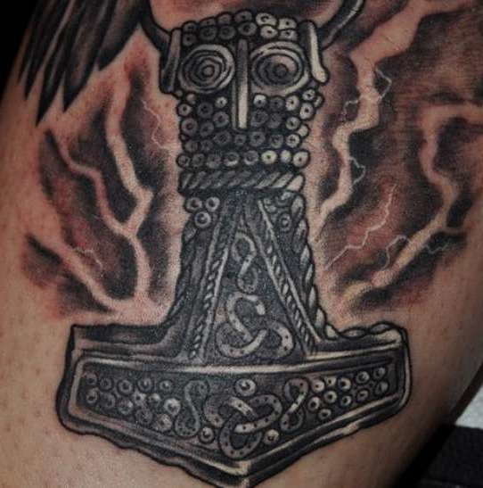 Thors Hammer, oder auch Mjellnir genannt, stammt aus Skandinavien. Spiegelt einen geistig starken Mann mit einem unnachgiebigen Willen und Ziel wider. Aus diesem Grund sind Tätowierungen mit einem Blitz in der heutigen Zeit sehr beliebt geworden.