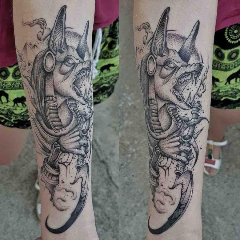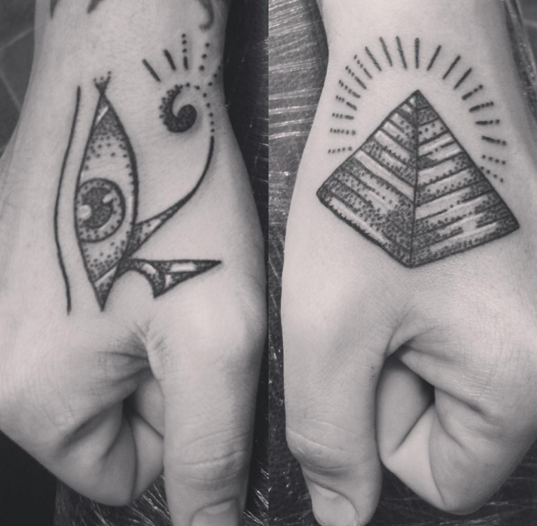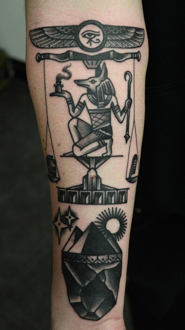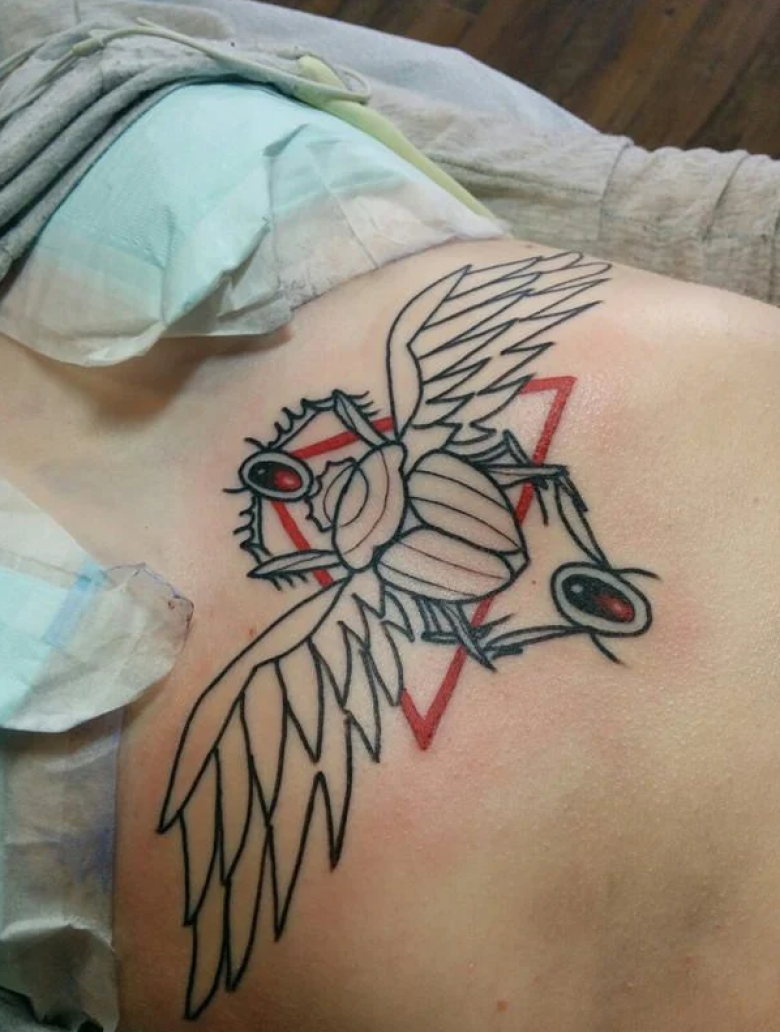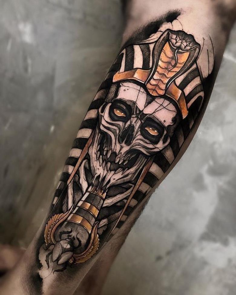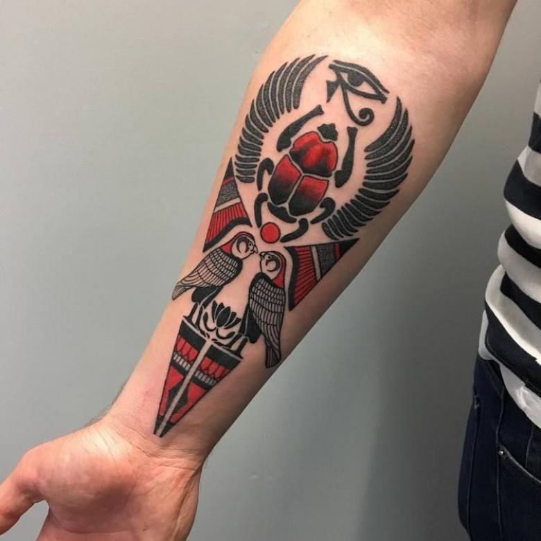 Scarabée. L'un des symboles les plus populaires. Il y a un monument à ce coléoptère à Louxor. À l'époque moderne, l'image est inscrite sur la main ou l'avant-bras. Les styles Old school, Dotwork et Réalisme sont utilisés.