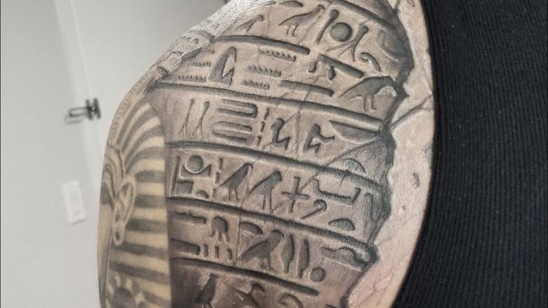 Fresques. Il s'agit d'un tatouage des fresques des temples de Louxor et de Gizeh. Il n'y a pas vraiment de message. C'est juste magnifique.
