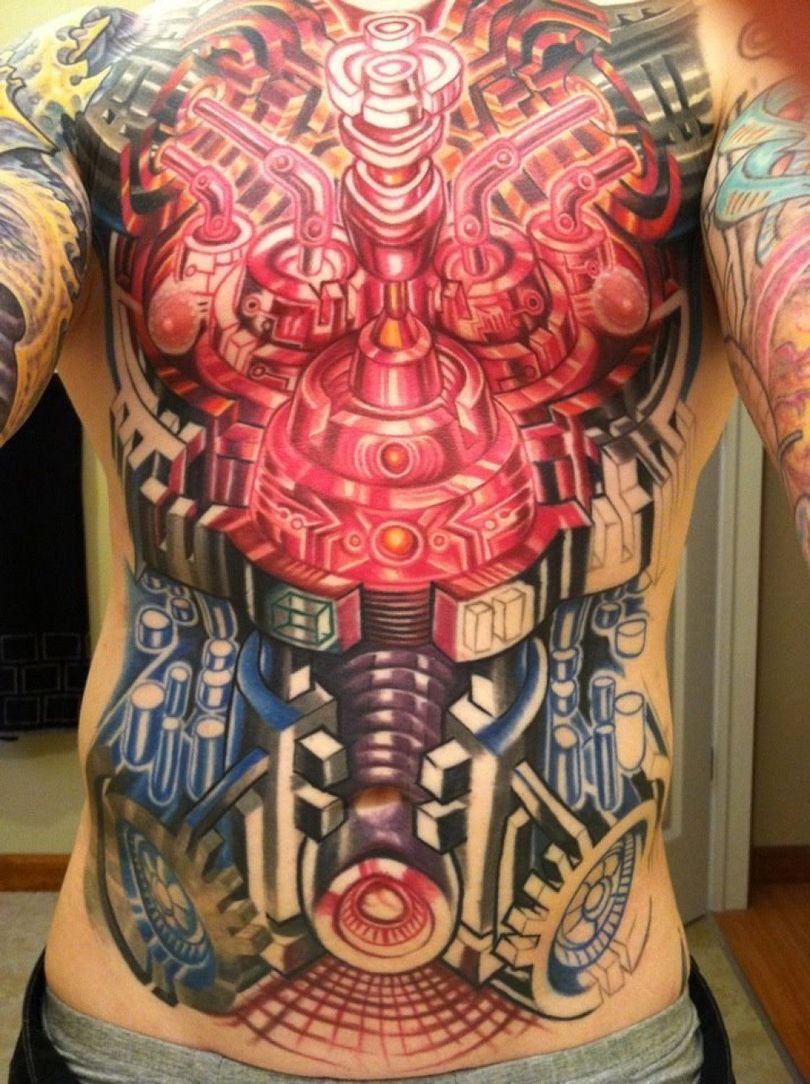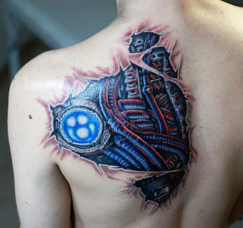 Η μεγάλη επιφάνεια του δέρματος καθιστά την πλάτη ιδανικό μέρος για τατουάζ. Εδώ ο καλλιτέχνης μπορεί να πραγματοποιήσει τα πιο φιλόδοξα οράματά του. Ένας μεγαλύτερος αριθμός μηχανικών στοιχείων μπορεί να χρησιμοποιηθεί για να δώσει στην εικόνα τη μέγιστη δυνατή επίδραση.
