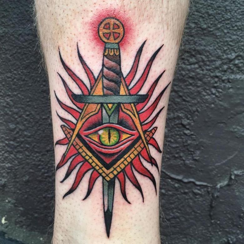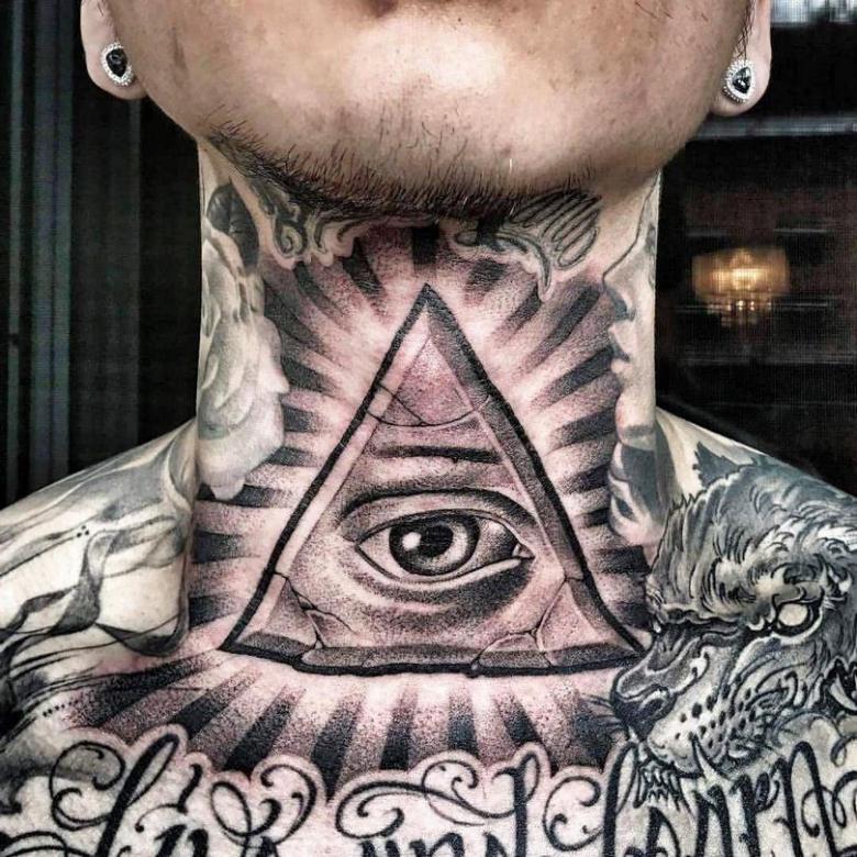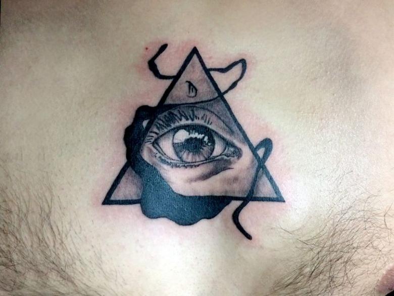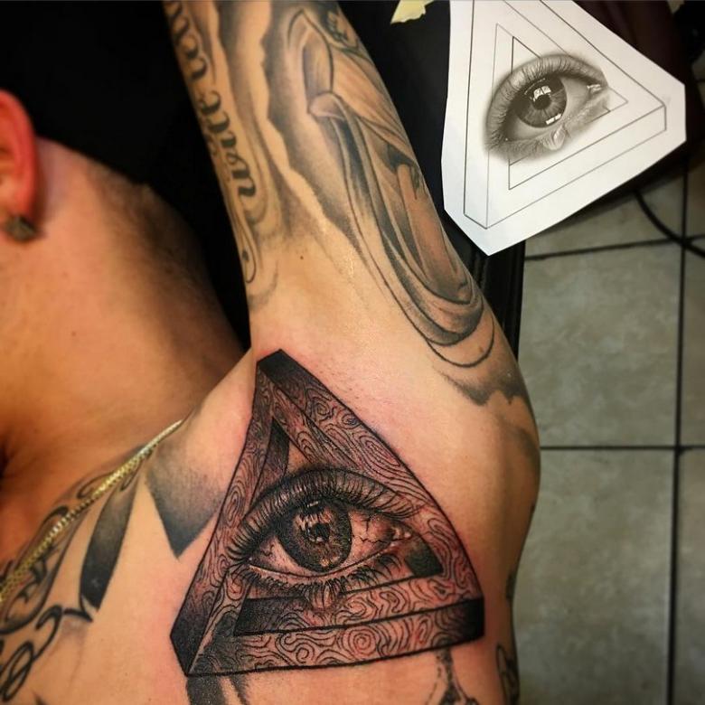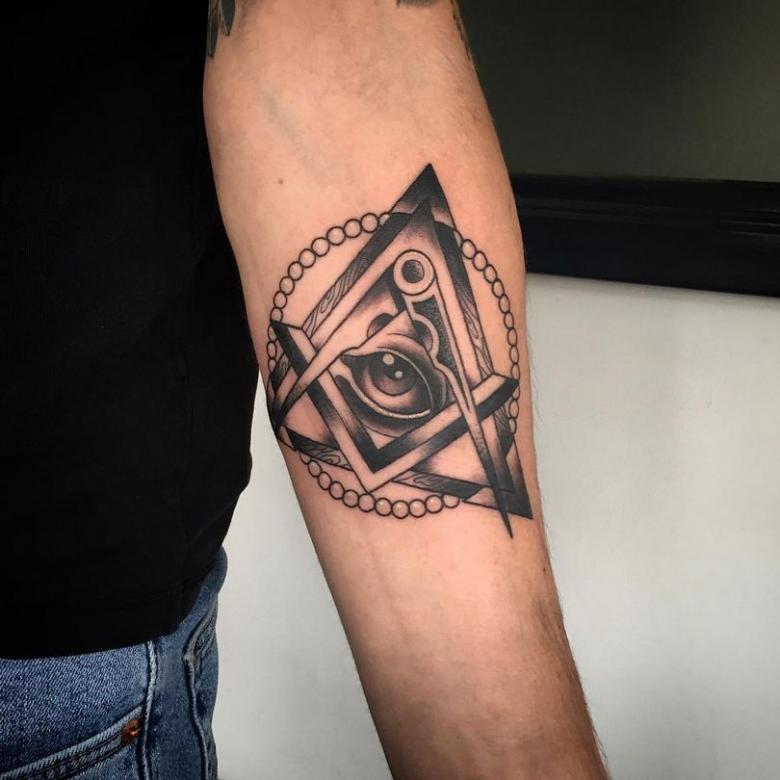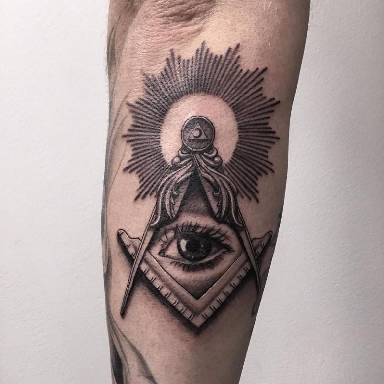 Στις φωτογραφίες που παρέχονται, το μασονικό μάτι φαίνεται πολύ ρεαλιστικό, ανεξάρτητα από τις λεπτομέρειες που το περιβάλλουν. Ωστόσο, το τατουάζ με τις ακτίνες φωτός που εκπέμπονται από το τρίγωνο υποδηλώνει ένα μέλος μιας μυστικής κοινωνίας μασόνων.