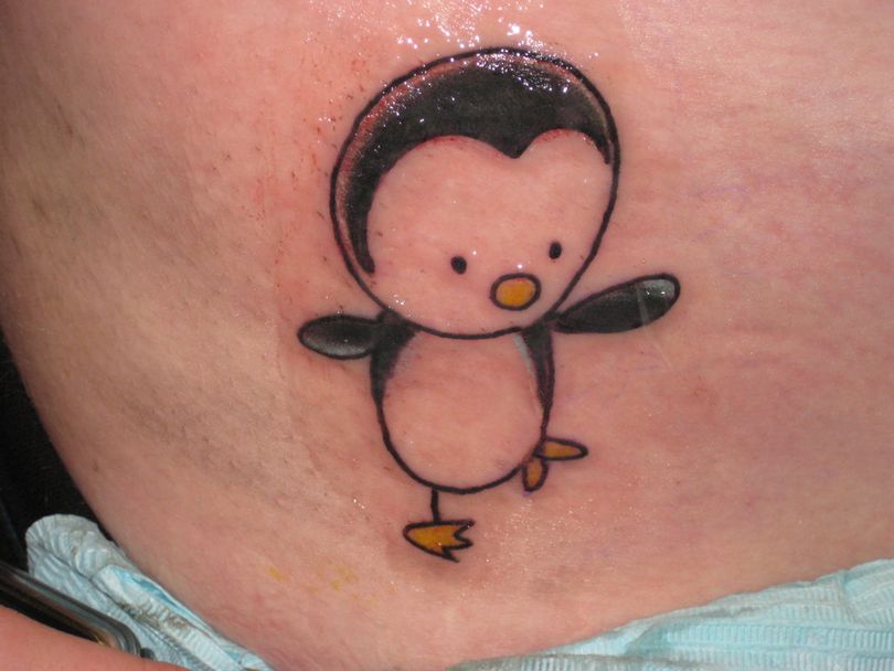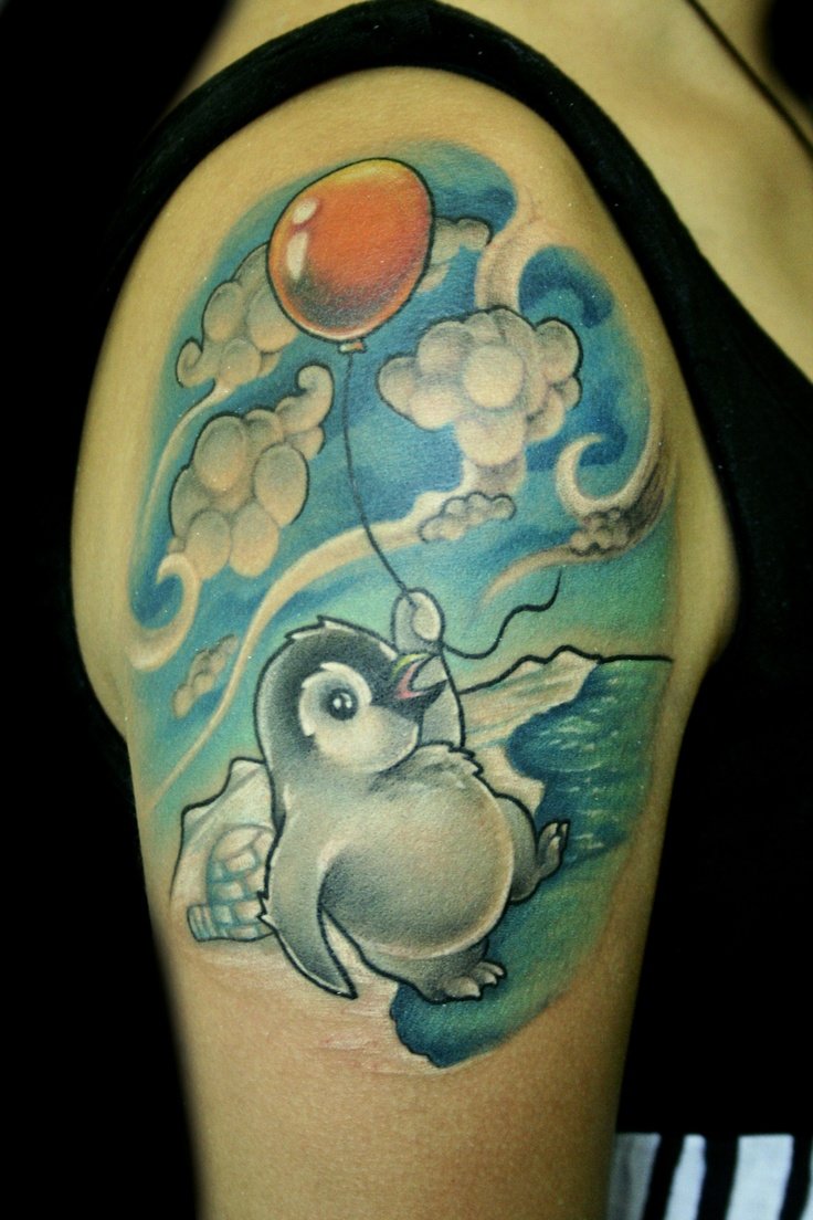 Συχνά για τη δημιουργία τατουάζ χρησιμοποιούν πιγκουίνους από γνωστά κινούμενα σχέδια. Οι άνθρωποι που τους αρέσει μια τέτοια εικόνα τονίζουν την ευγένεια και τον ρομαντισμό τους. Στις γυναίκες αρέσουν ιδιαίτερα οι ποιητικές εικόνες. Οι κυρίες έλκονται τόσο πολύ από τους φωτεινούς παχουλούς πιγκουίνους, που συχνά αυτά τα τατουάζ στο σώμα τους μπορούν να βρεθούν αμέσως μερικά.