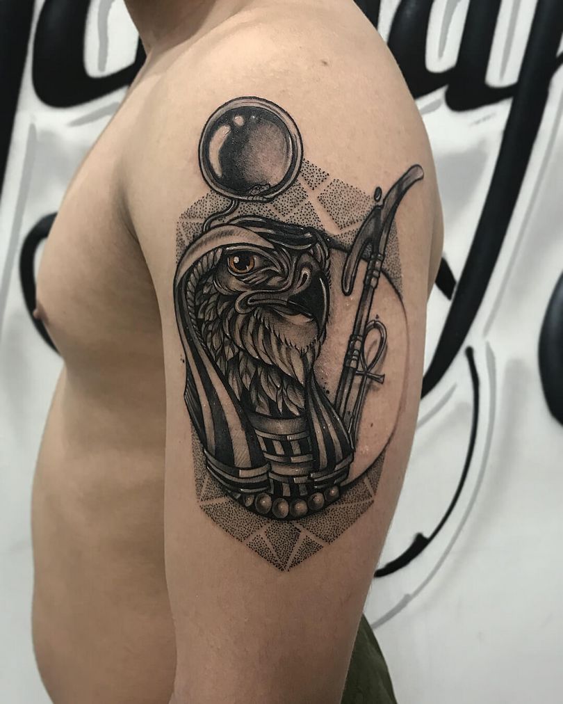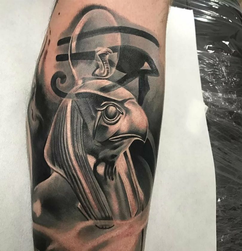 La imagen coronada tiene el significado de conocimiento espiritual supremo, majestuosidad y sabiduría. La cruz que sostiene el dios simboliza la vida eterna y el cetro es un signo de la autoridad divina. Cualquier tatuador profesional le dirá que el dios Ra es el preferido de los interesados en los mitos y la historia.