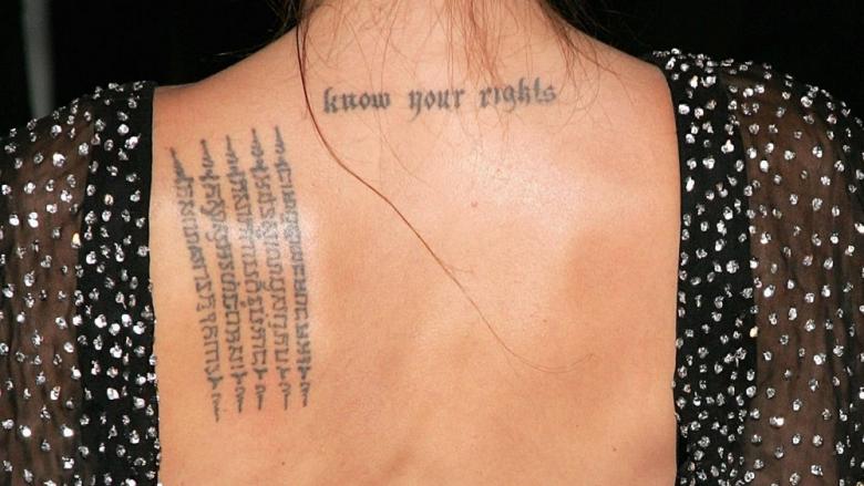 La signification du tatouage d'Angelina Jolie dans son dos, ou plutôt juste en dessous de son cou, entre ses omoplates - "Connaissez vos droits" ou " Connaissez vos droits ". Les mots sont écrits dans un style gothique. C'est le nom d'une de ses compositions préférées.
