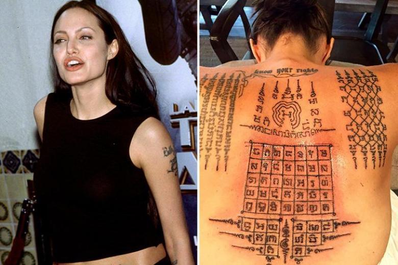 Angelina Jolie a un tatouage d'un énorme tigre du Bengale et d'un dragon dans le dos, sous la taille, avec un swoop sur les fesses. Le tatouage a été encré en 2004. La tribu de Bornéo avait une peinture rupestre similaire. Les images ont été appliquées par un célèbre maître tatoueur thaïlandais, Sompong Kanhpai, au moyen de l'acupuncture. Des chants rituels ont accompagné le processus.