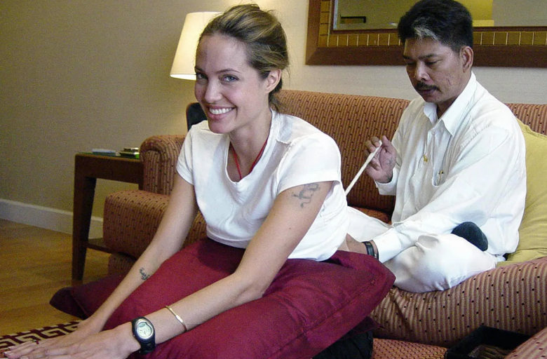 L'un des tatouages les plus récents a été encré sur les deux conjoints. Ce motif a été appliqué par le moine thaïlandais Ajarna Nu Kanpaya, spécialement convoqué de Bangkok. Le tatouage était sur le dos d'Angelina et sur le ventre de son mari. Le processus d'application a été très douloureux car l'artisan a utilisé une tige d'aiguille chirurgicale. Mais l'image est sortie clairement.