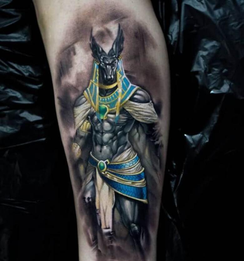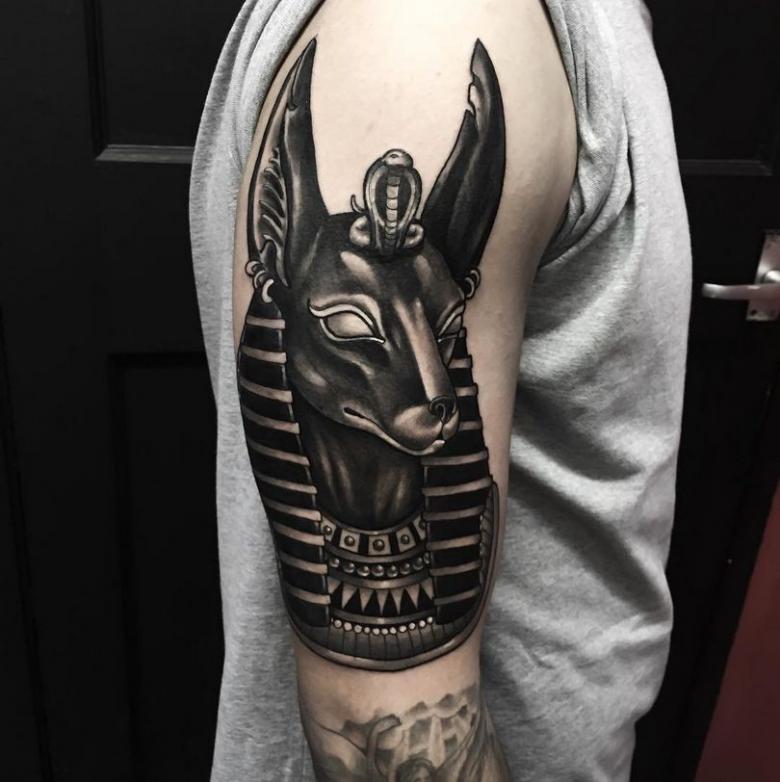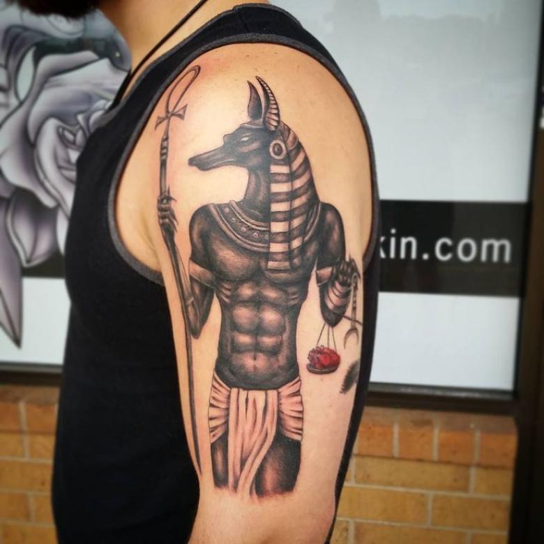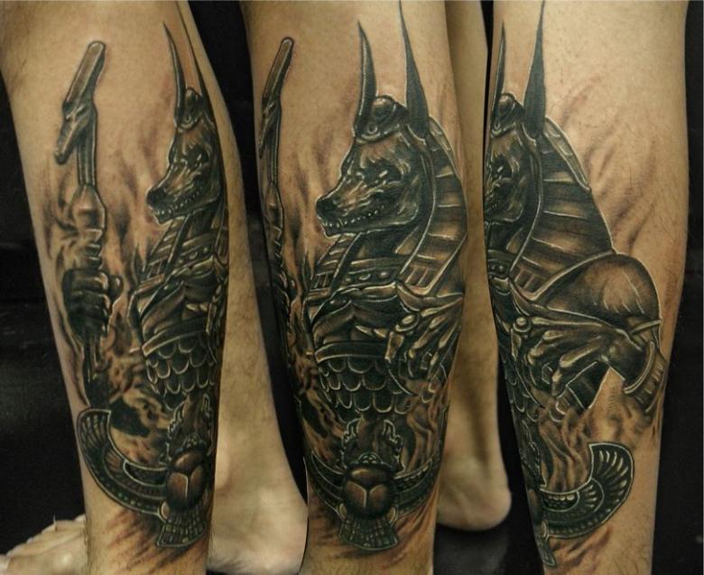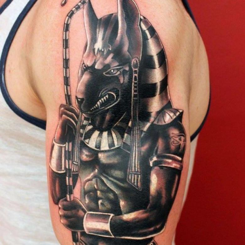 Ez azonban nem az amerikai filmművészet újabb remekműve, hanem egy tetoválás, amely Anubisz istent ábrázolja a kor hagyományos ruházatában, hagyományos fejdísszel és egy kutya vagy sakál fejével, amelyet az egyiptomiak akkoriban pozitív tulajdonságokkal ruháztak fel.