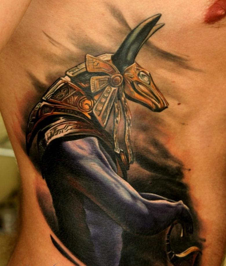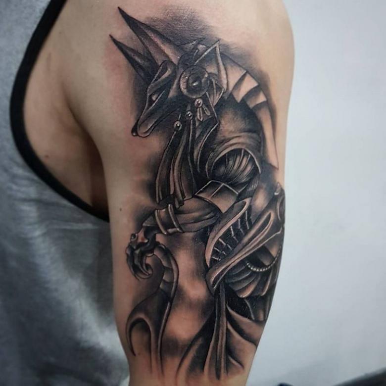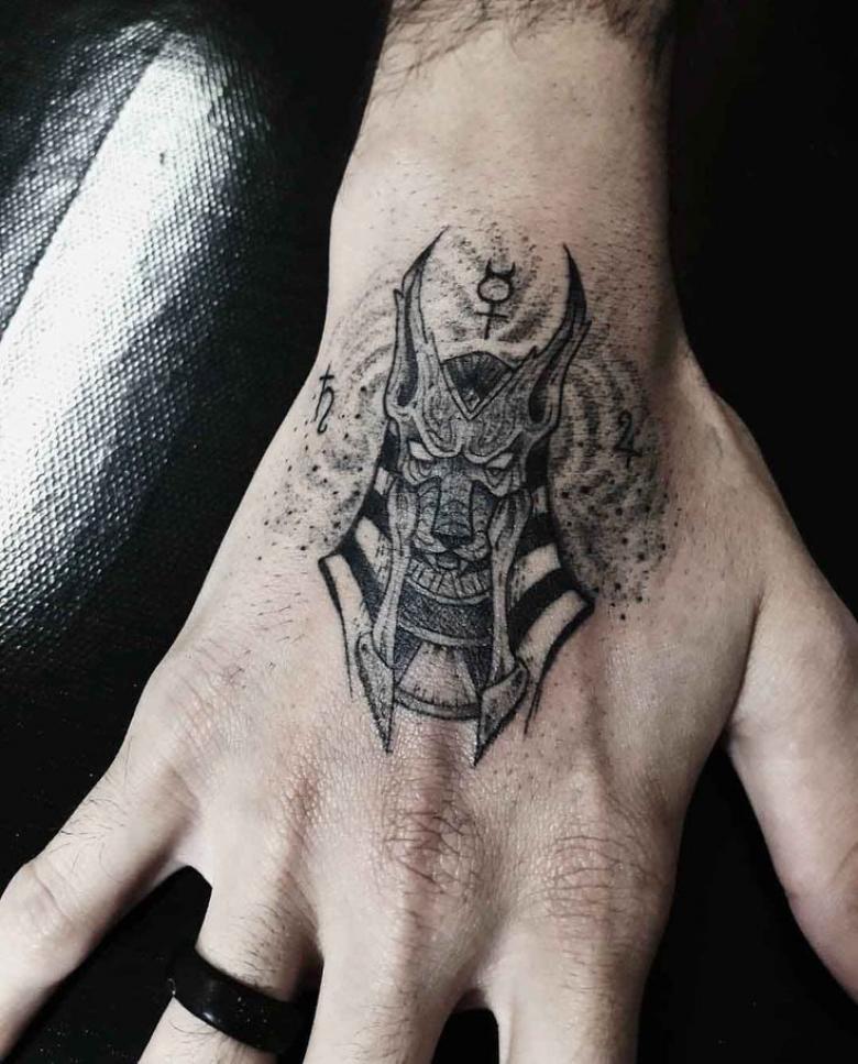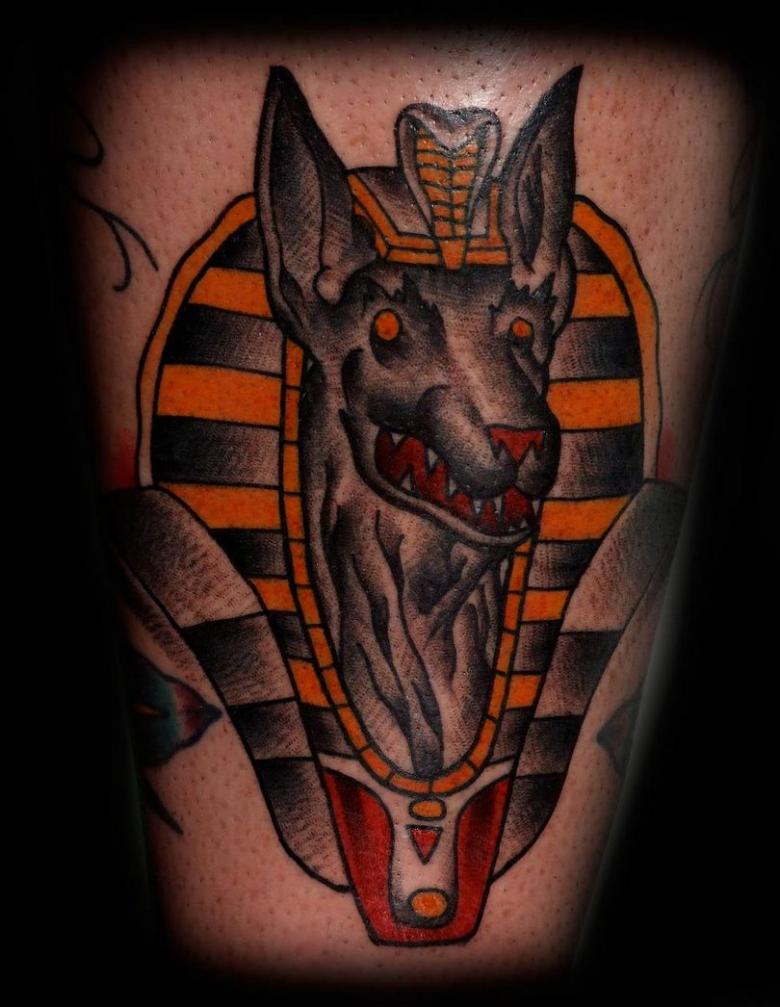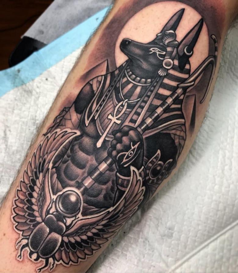 Ez azonban nem az amerikai filmművészet újabb remekműve, hanem egy tetoválás, amely Anubisz istent ábrázolja a kor hagyományos ruházatában, hagyományos fejdísszel és egy kutya vagy sakál fejével, amelyet az egyiptomiak akkoriban pozitív tulajdonságokkal ruháztak fel.