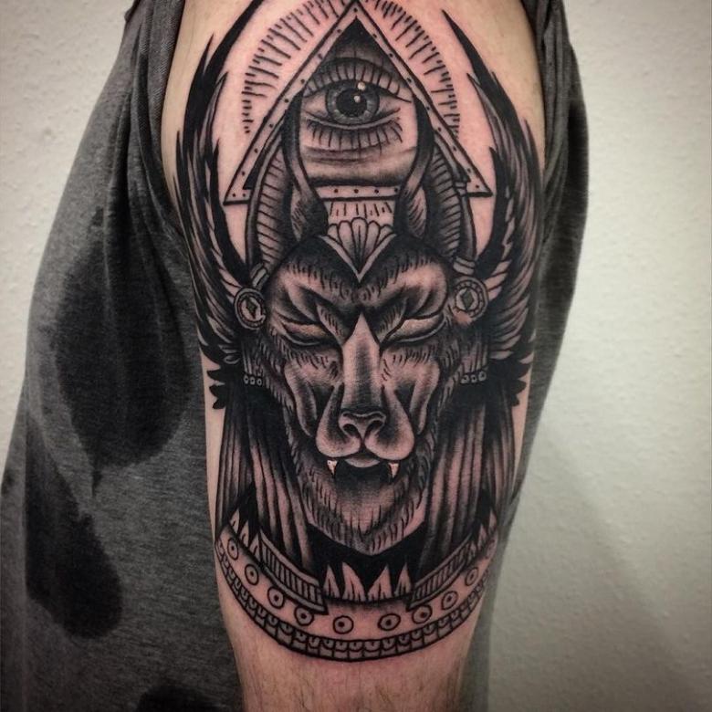 Az ókori egyiptomi istenség sziluettje (vagy csak a fej a hagyományos fejdíszben) tetoválható bárhová, mert a tetoválás nem meghatározott szimbólum, amelyet a karon vagy a lábon kell használni.