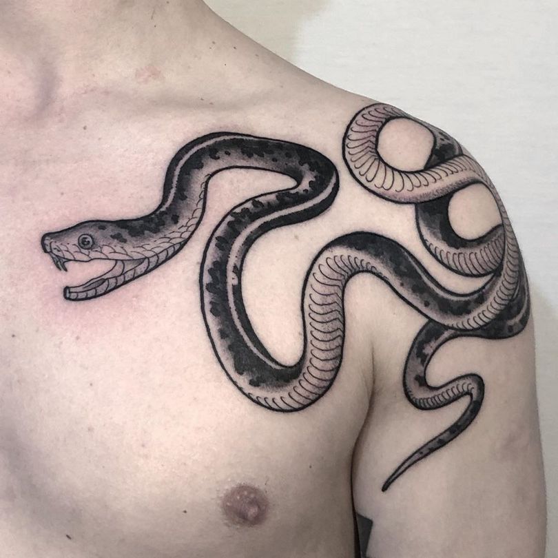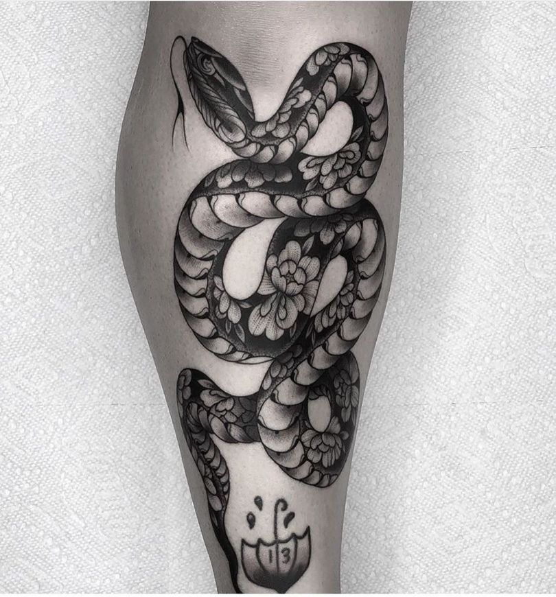 Il rettile con la sua configurazione sinuosa non trattiene l'immaginazione, permettendo di applicarlo a qualsiasi zona della figura, da piccoli elementi a enormi esemplari che si muovono su tutto il corpo. Il serpente che scorre sulla spalla sembra spettacolare e originale, accentuando le belle curve del braccio di una donna o di un uomo. Il simbolo è adatto a entrambi i sessi.