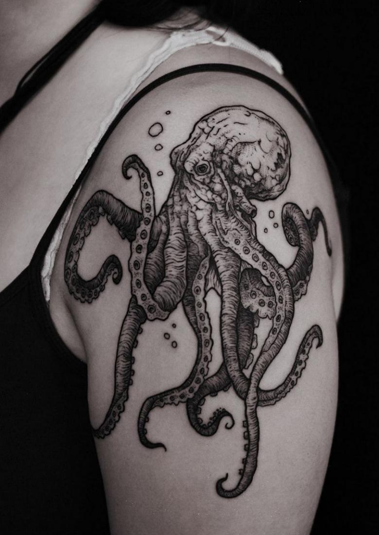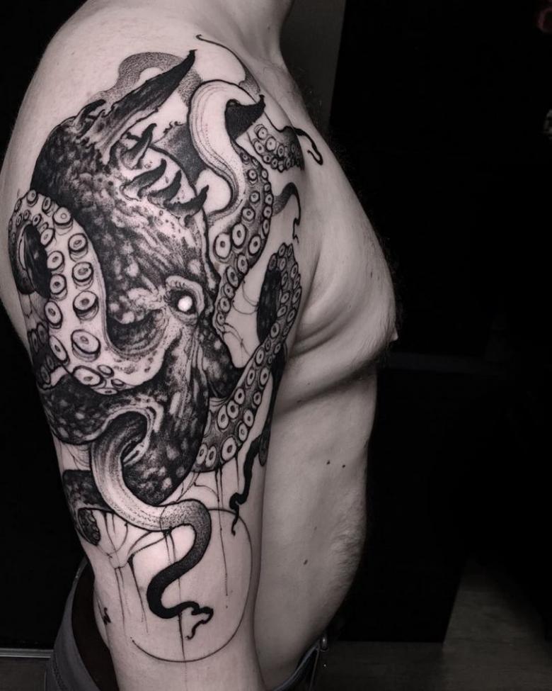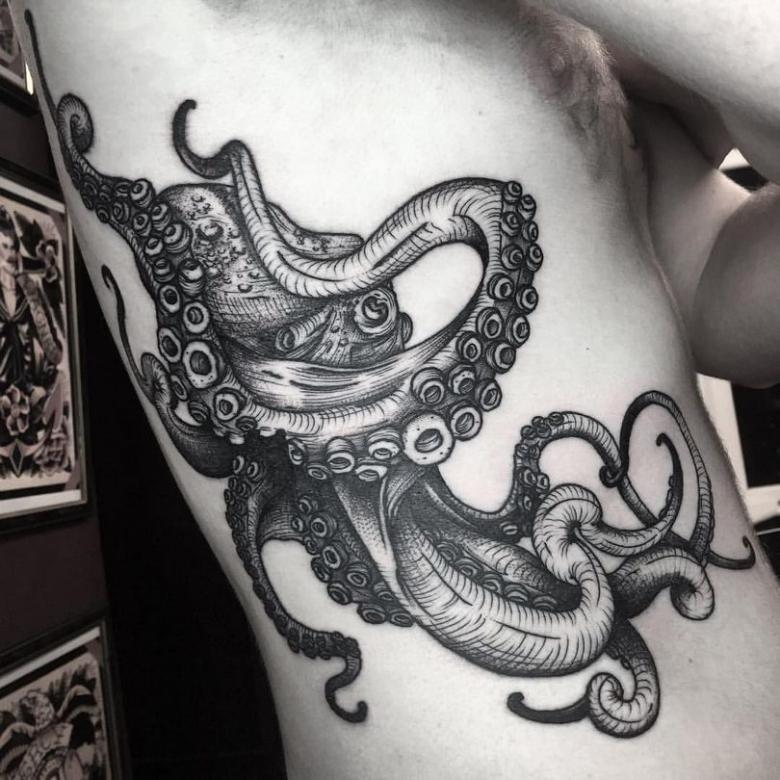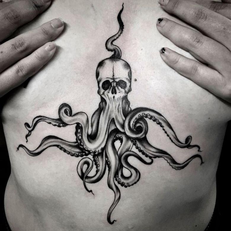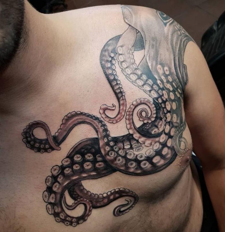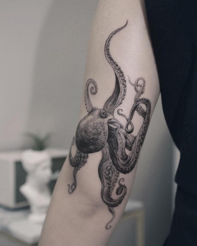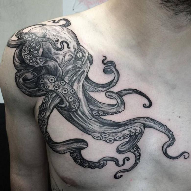 女性と男性では、タトゥーのスケッチを選択する際に、異なる目標を追求し、同じように異なる結果を得ることができることは周知の事実です。男性の場合、胴体のタコは通常、敏捷性と回復力、運と成功の象徴とされています。タコが持つ環境変化への適応力や柔軟性、臨機応変な対応力が頼みの綱です。