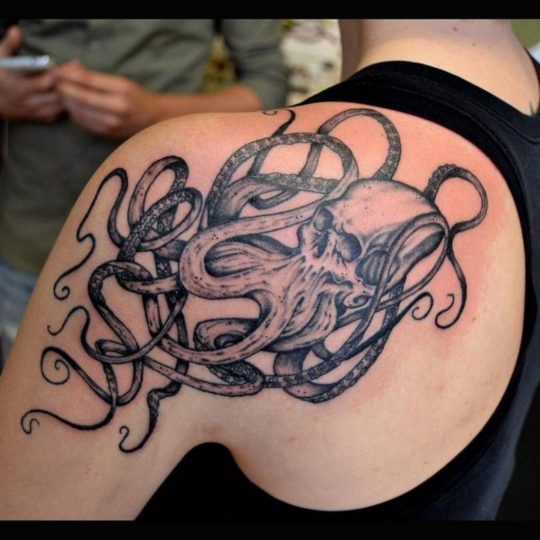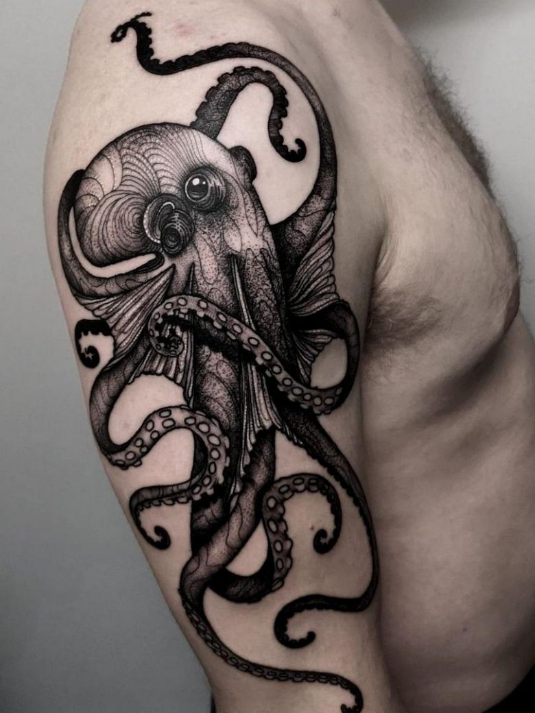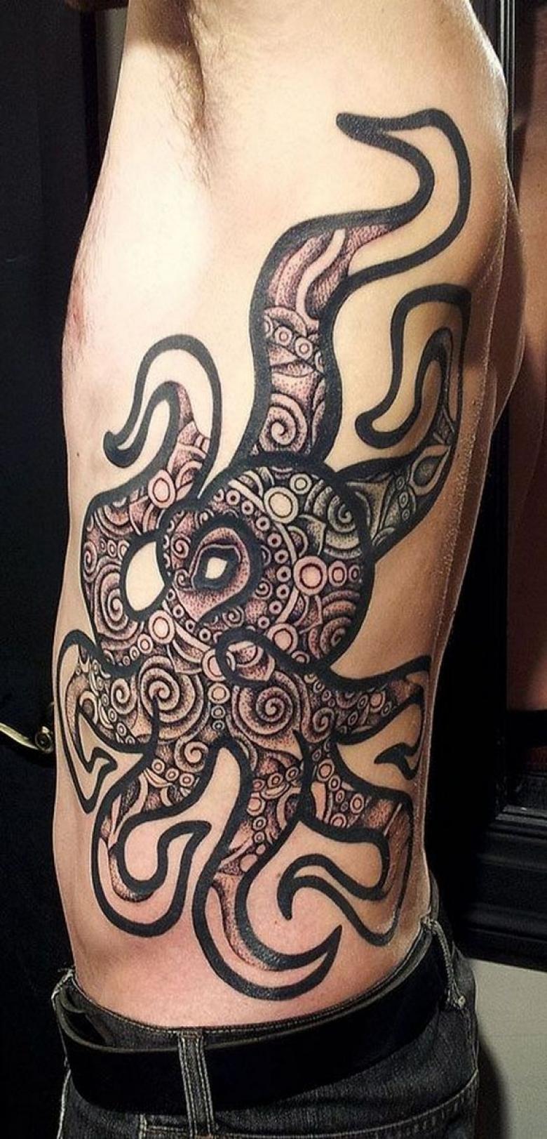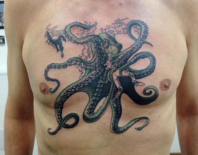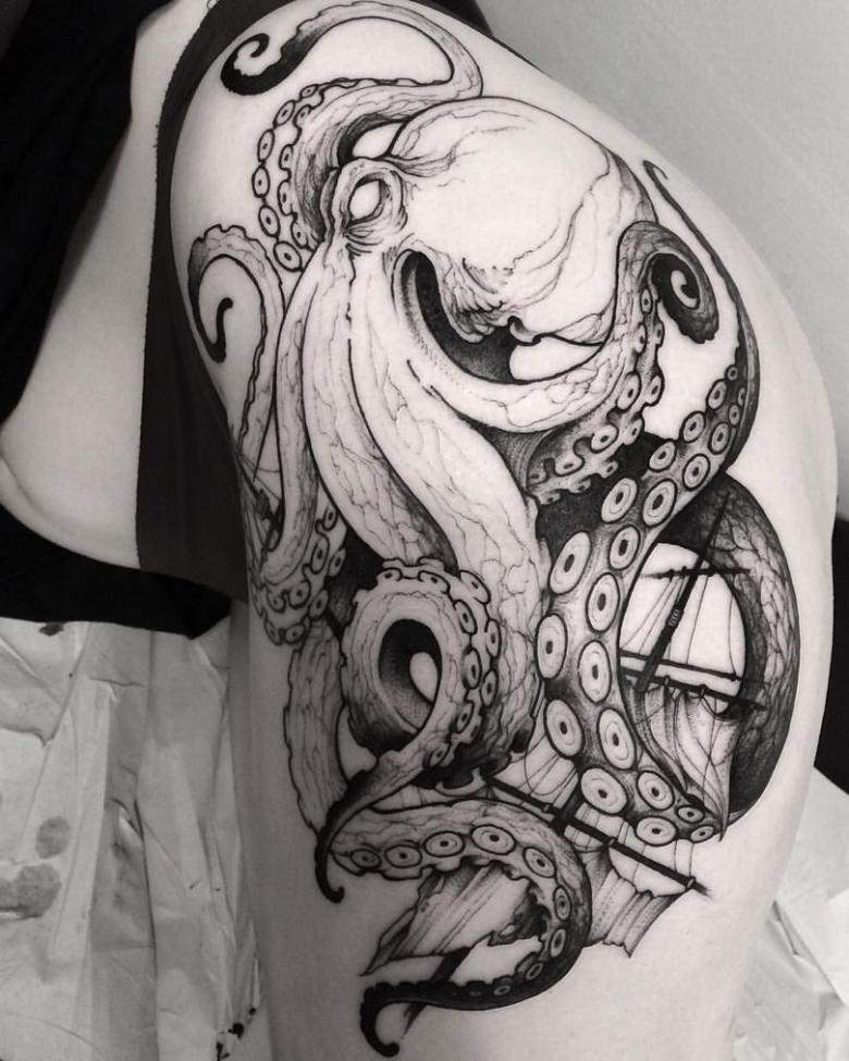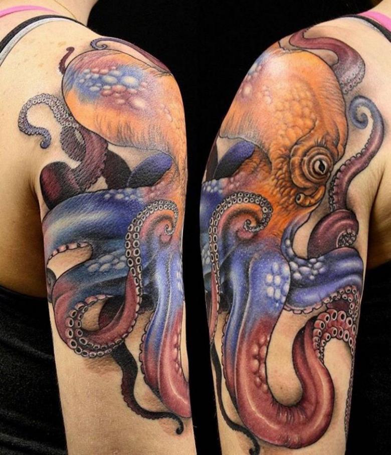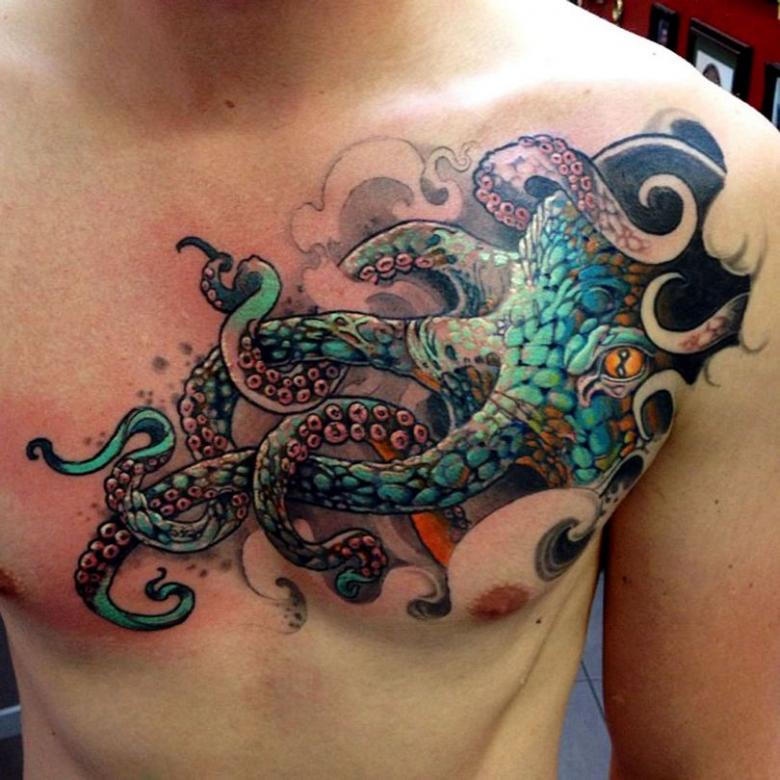 女性と男性では、タトゥーのスケッチを選択する際に、異なる目標を追求し、同じように異なる結果を得ることができることは周知の事実です。男性の場合、胴体のタコは通常、敏捷性と回復力、運と成功の象徴とされています。タコが持つ環境変化への適応力や柔軟性、臨機応変な対応力が頼みの綱です。