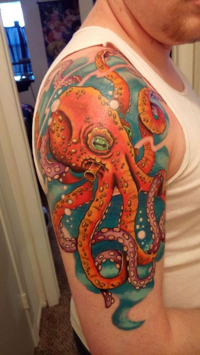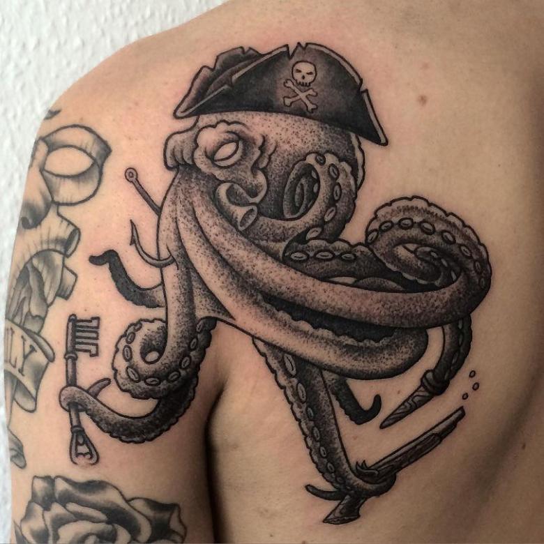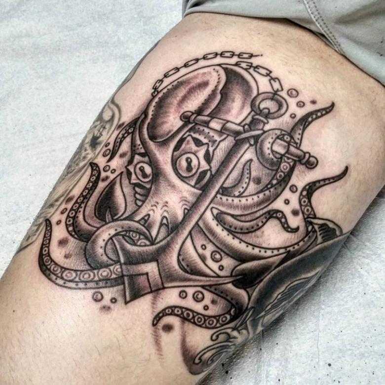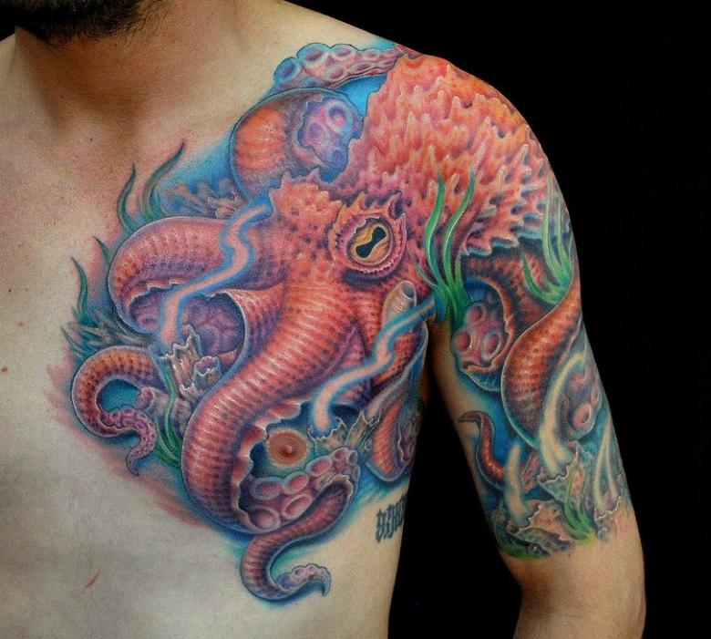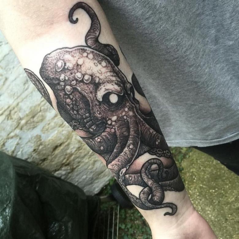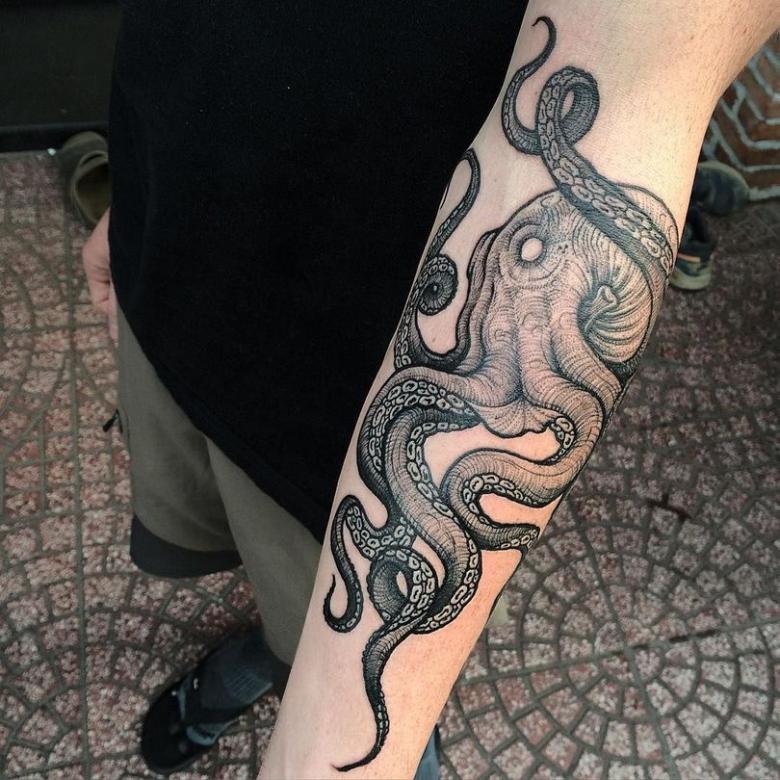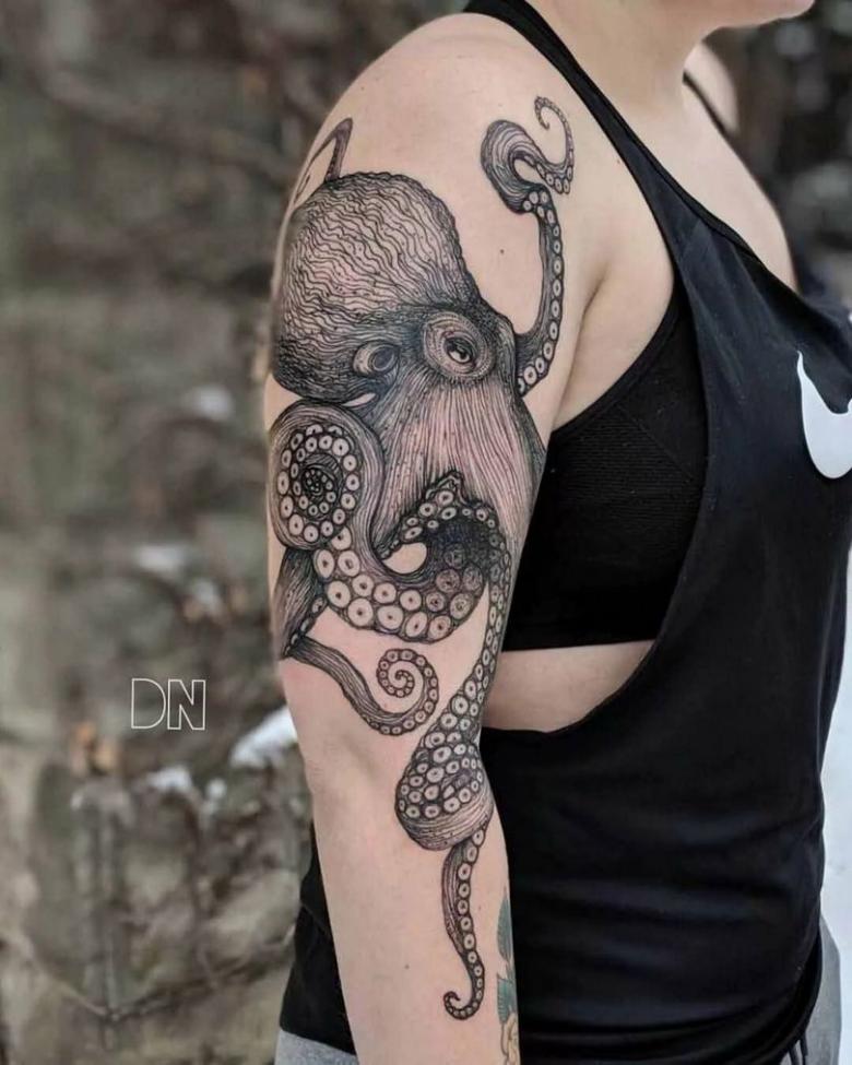 女性と男性では、タトゥーのスケッチを選択する際に、異なる目標を追求し、同じように異なる結果を得ることができることは周知の事実です。男性の場合、胴体のタコは通常、敏捷性と回復力、運と成功の象徴とされています。タコが持つ環境変化への適応力や柔軟性、臨機応変な対応力が頼みの綱です。