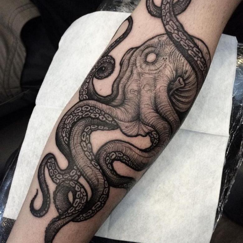 このように、タコは非常に曖昧な動物であり、タコをモチーフにしたタトゥーの数だけ、アイデアや思考が存在するのです。今ではほとんど使われることのない希少な画像ですが、揺るぎない思い入れと徹底したこだわりを持っています。タコが描かれたドローイングを身に着けることで、その発想の独創性、アプローチの繊細さ、そして動物の持つシンプルな美学は、誰も無関心ではいられなくなることでしょう。